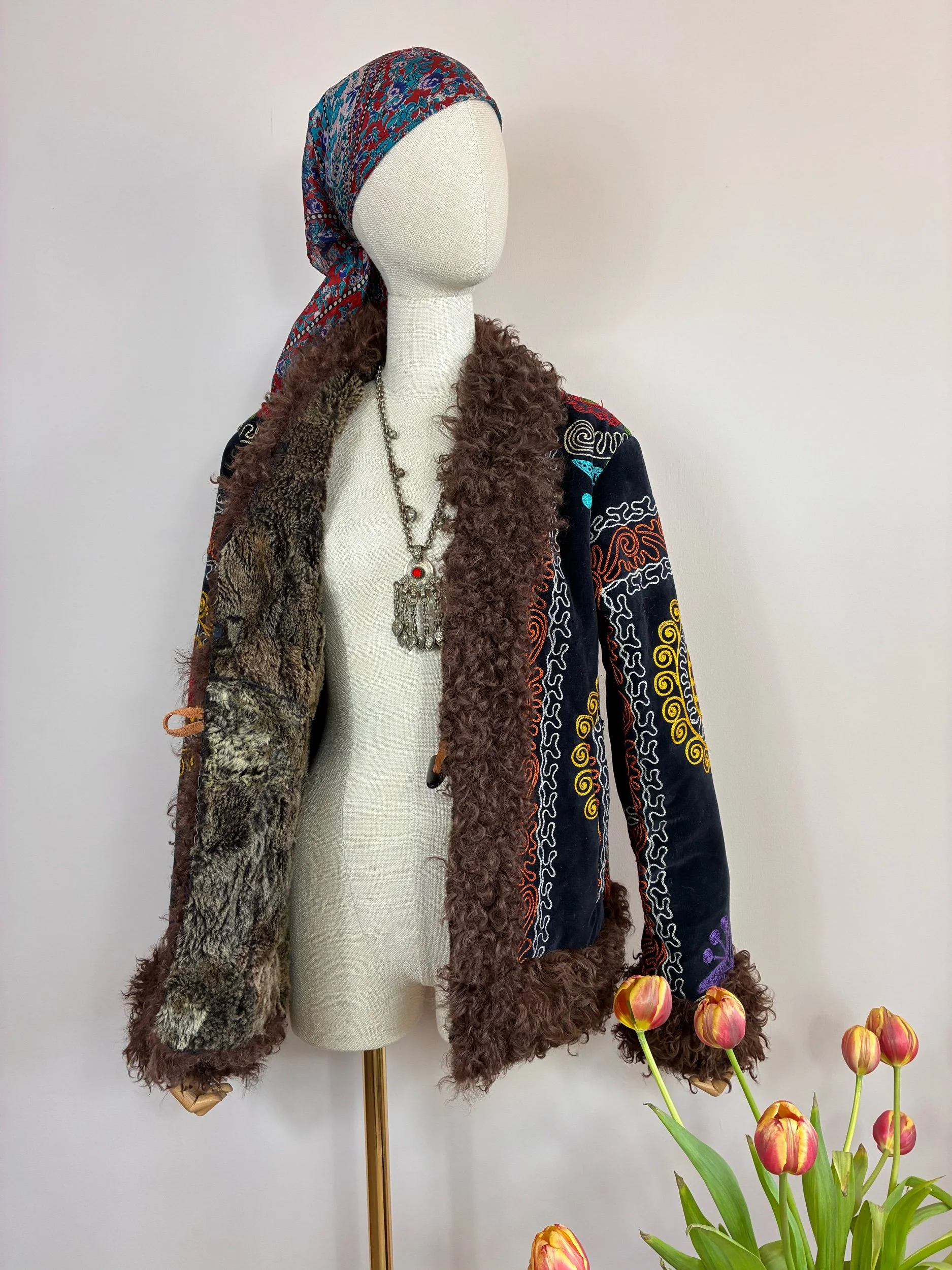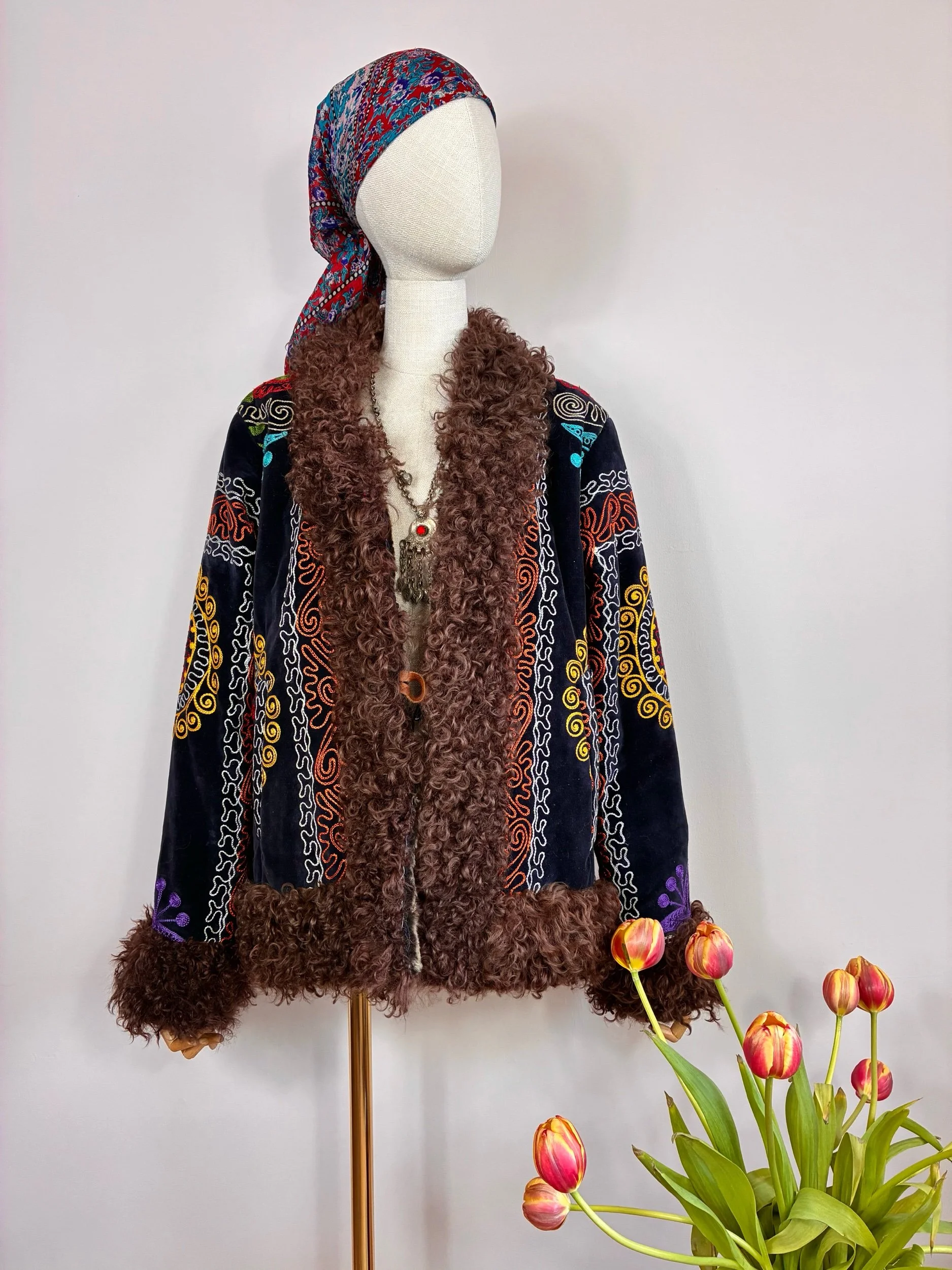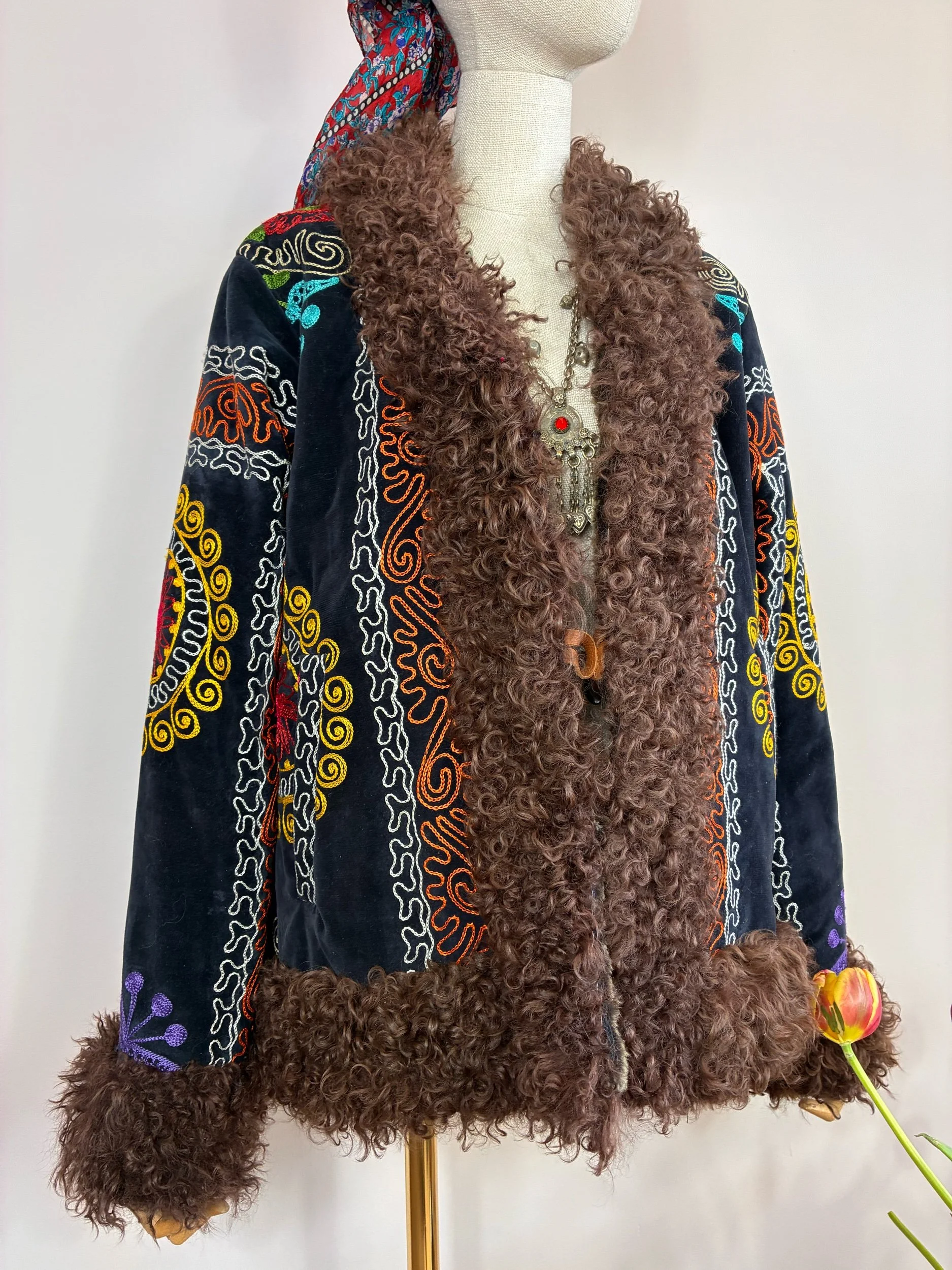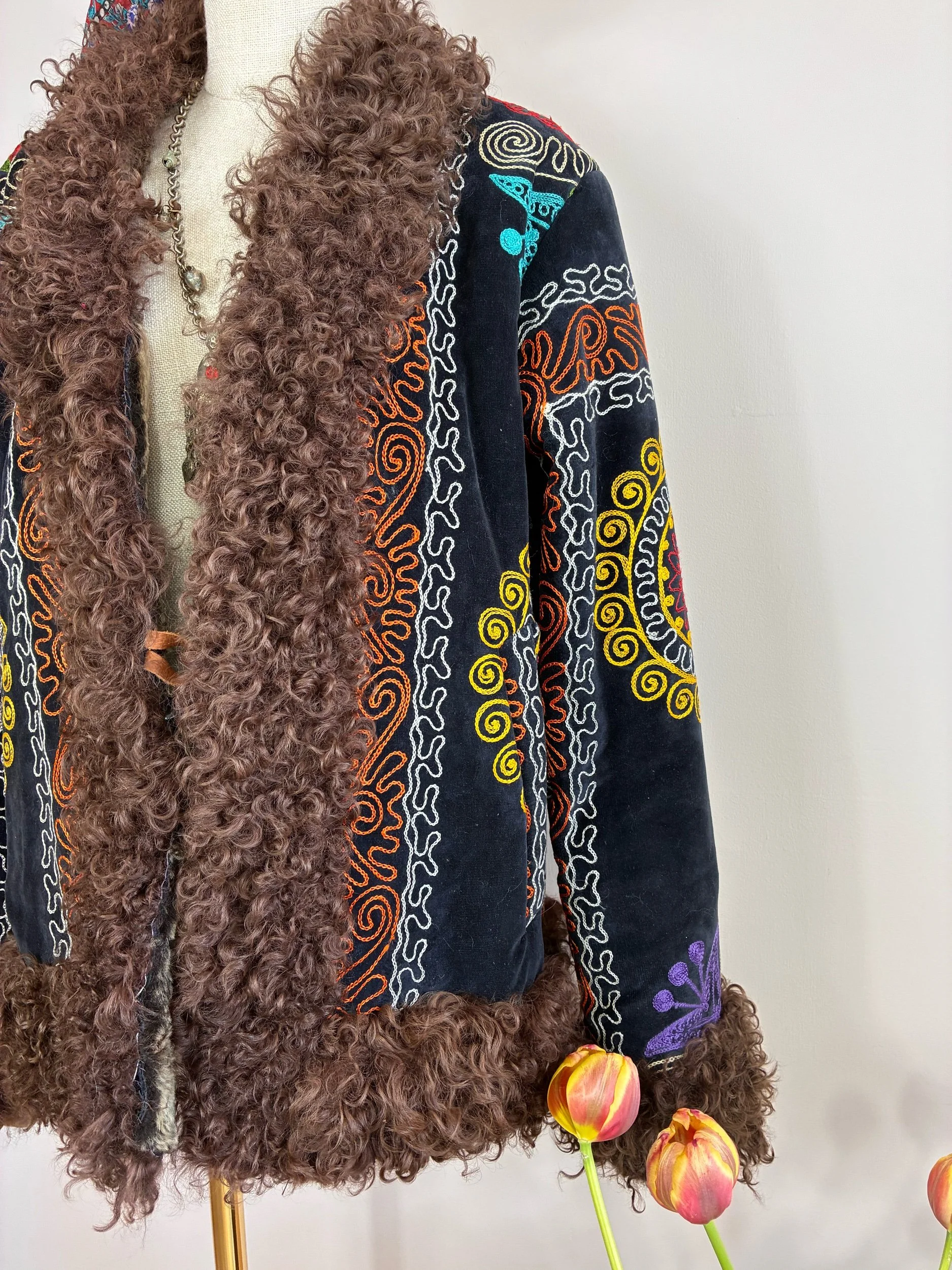 Incredible Afghan inspired coat handmade from preloved velvet Suzani fabric. Unique embroidered textile - one of a kind. Adorned with super soft brown curly Mongolian fur collar, trim and cuffs. Fur lining inside for extra warmth. Two pockets, toggle fastening. A piece of wearable art. Designed to be cherished and treasured.