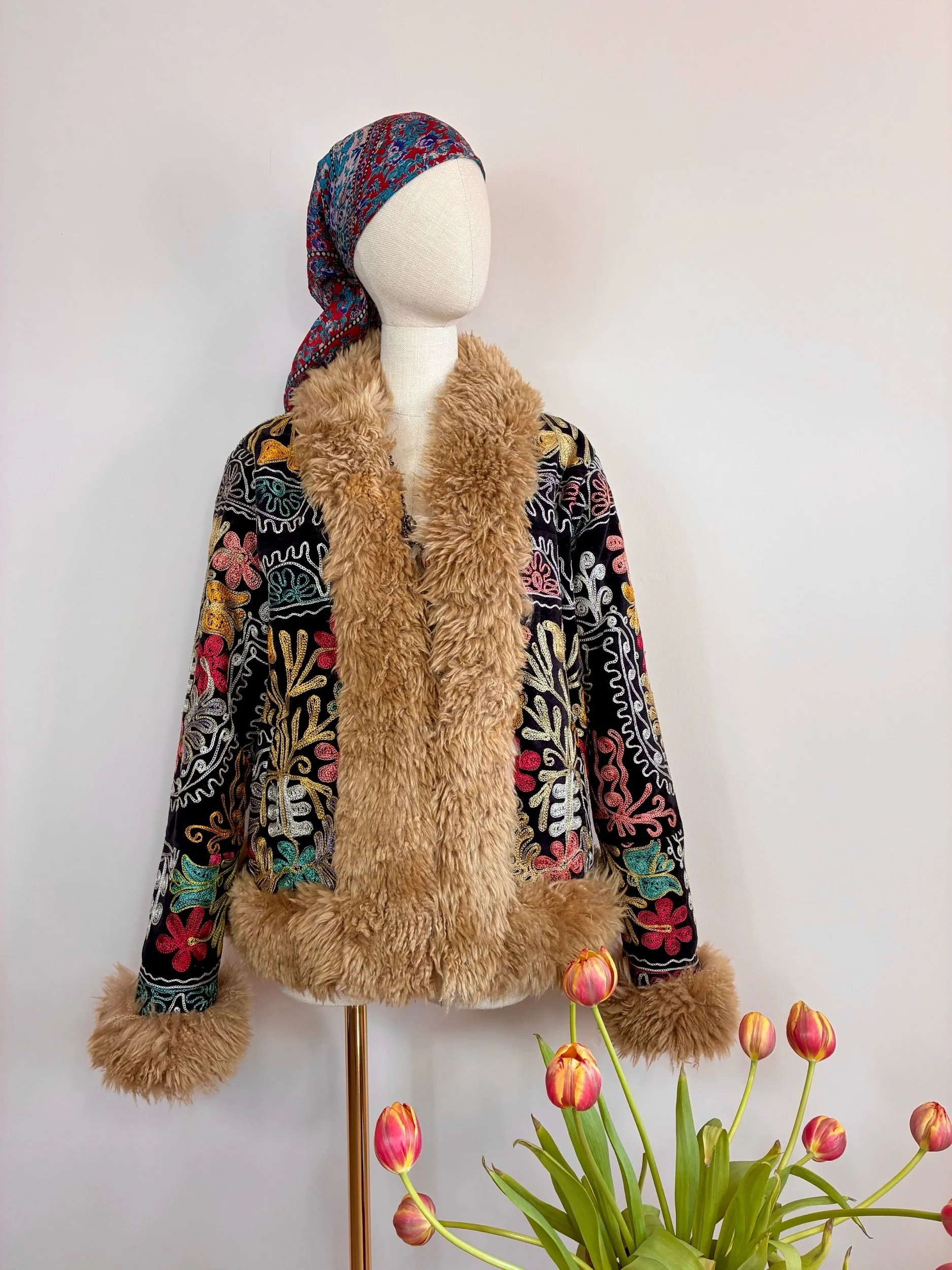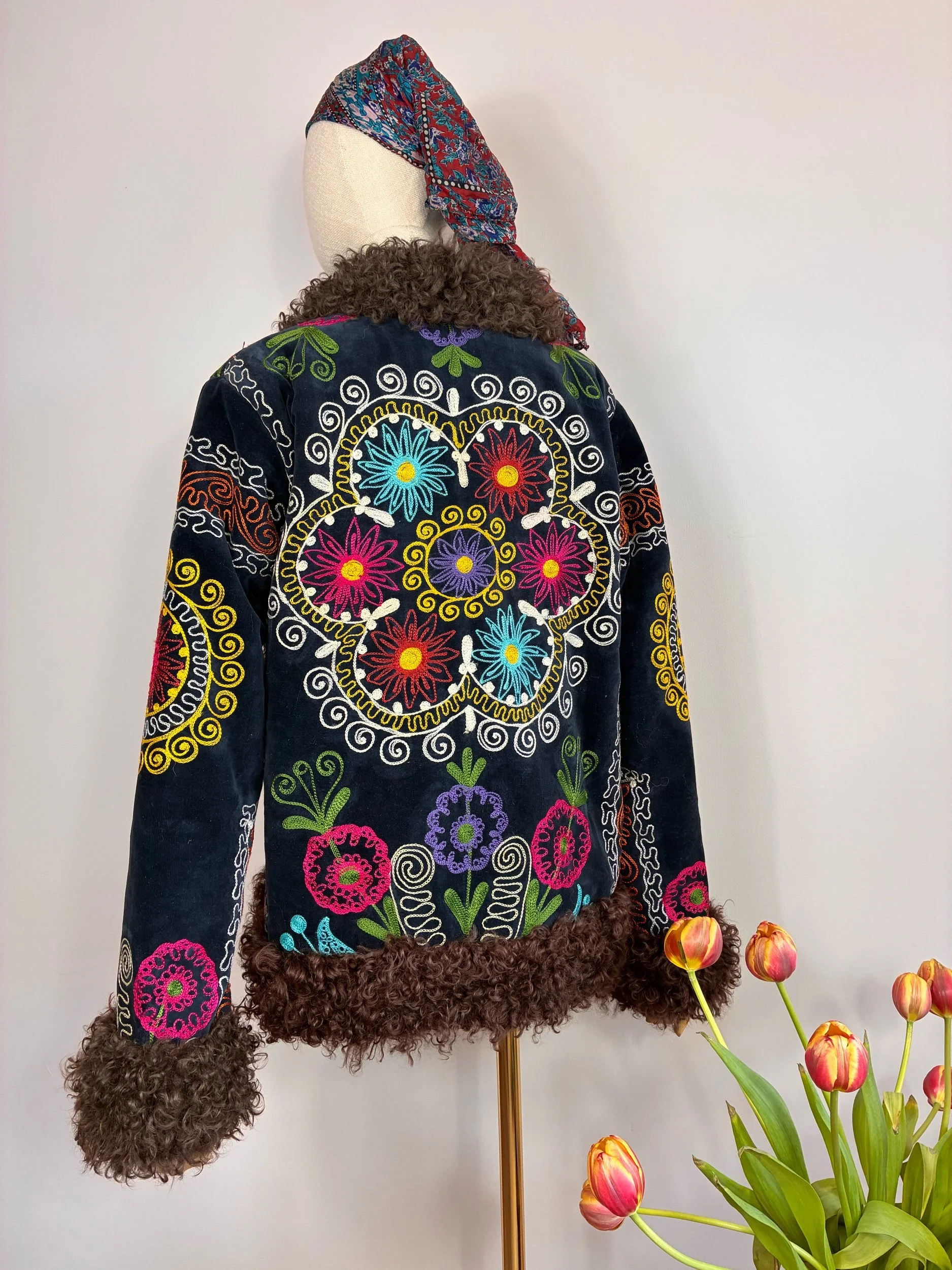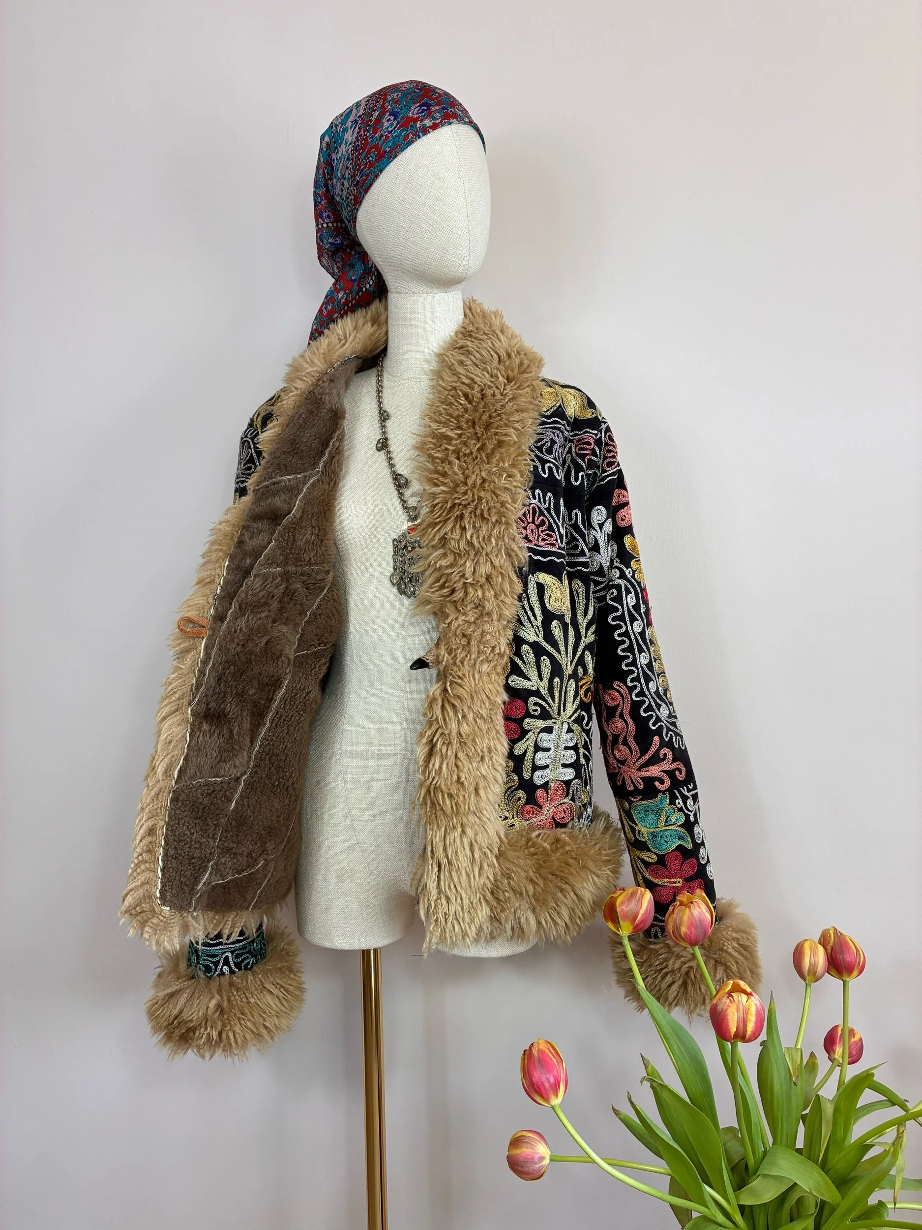 Incredible Afghan inspired coat handmade from preloved velvet Suzani fabric. Unique embroidered textile - one of a kind. Adorned with super soft brown curly Mongolian fur collar, trim and cuffs. Fur lining inside for extra warmth. Two pockets, toggle fastening. A piece of wearable art. Designed to be cherished and treasured.