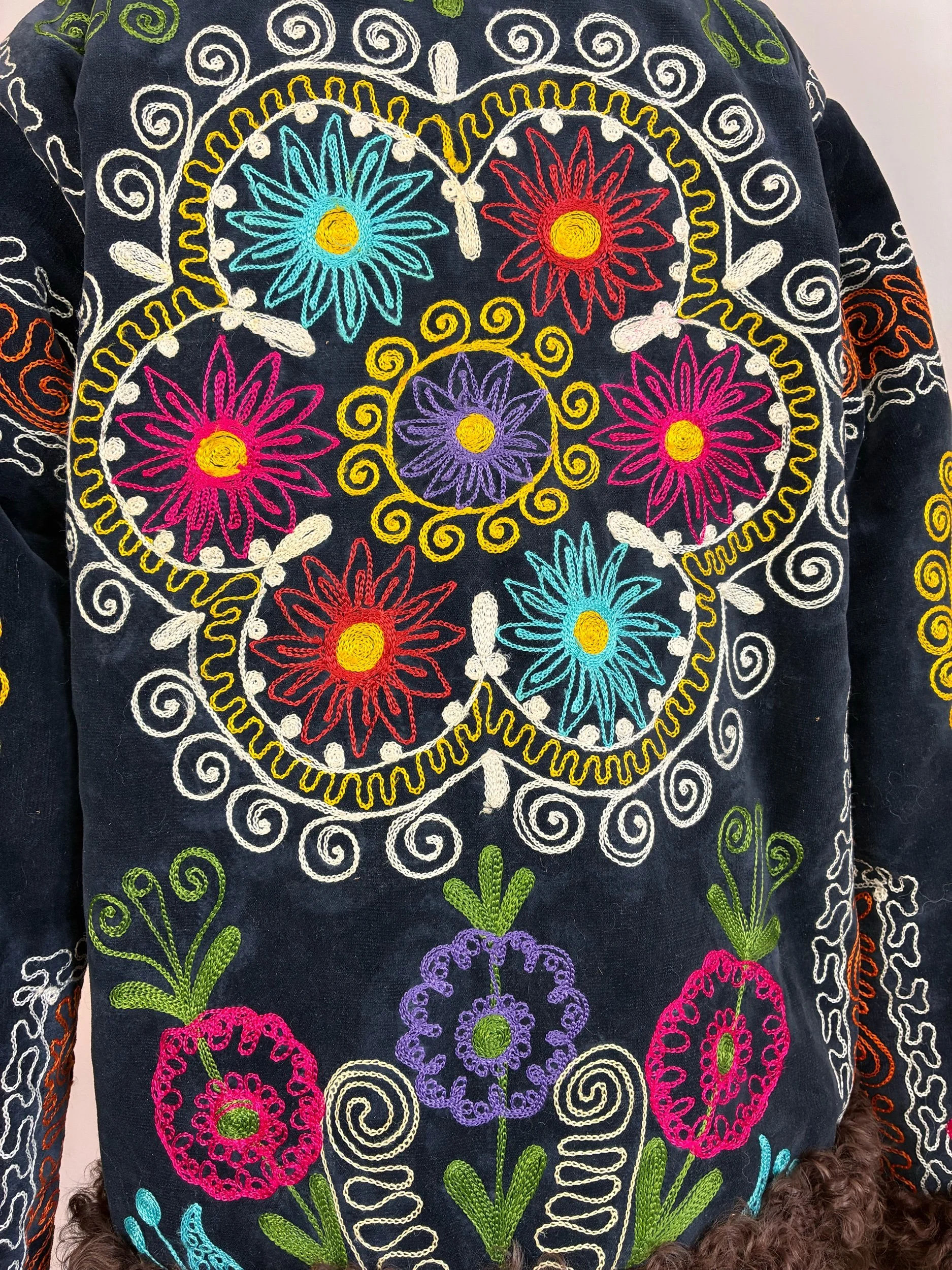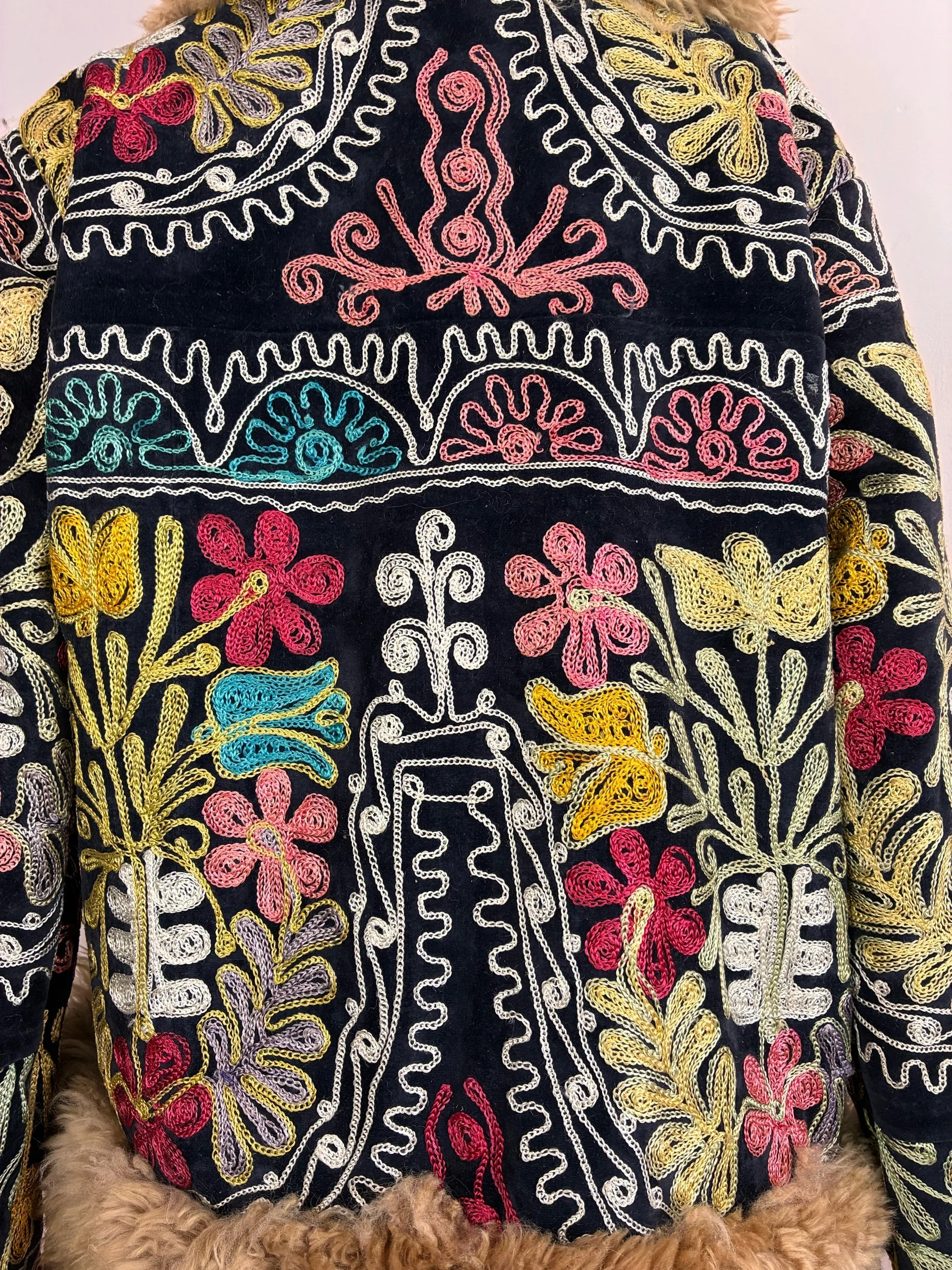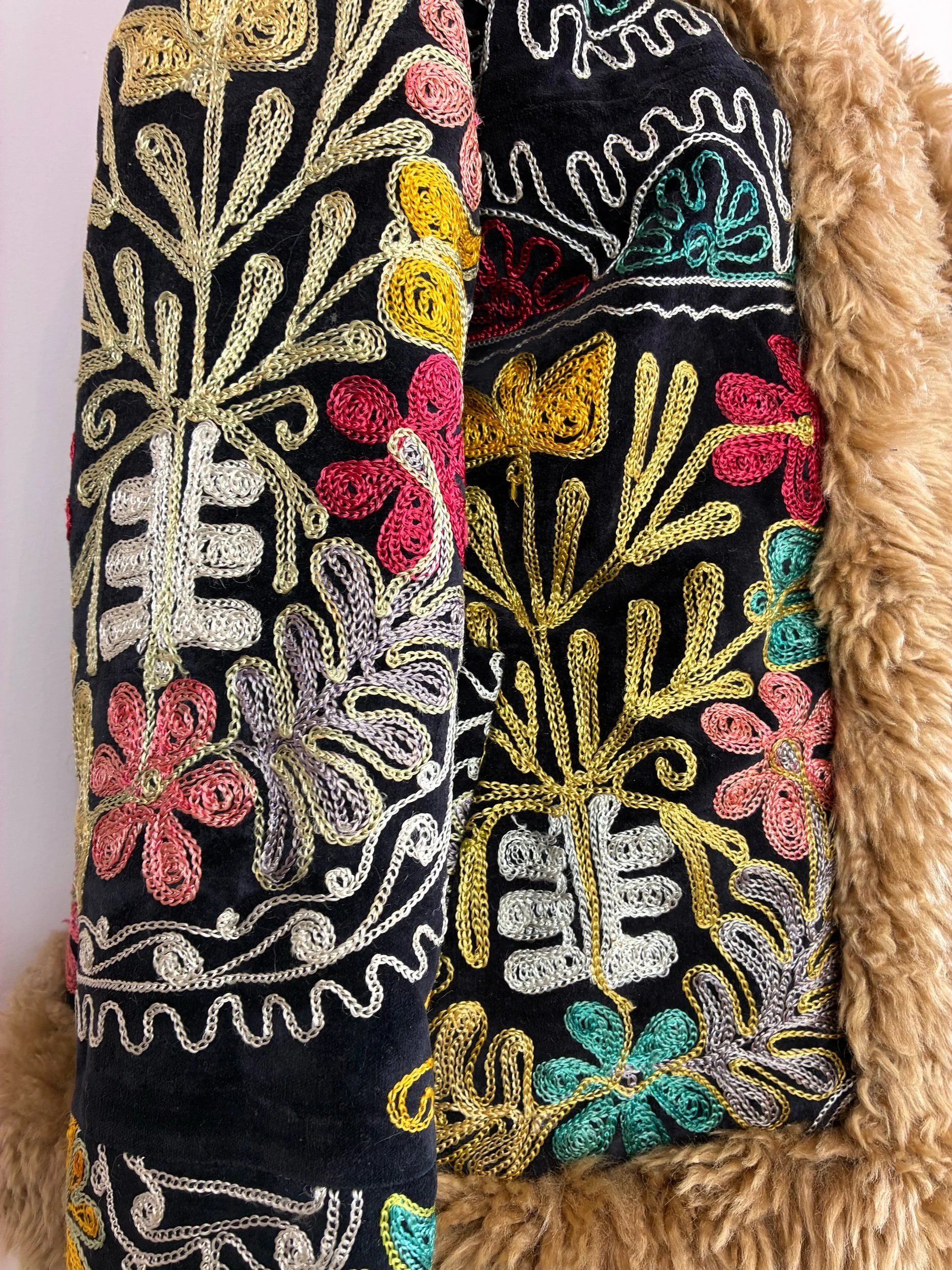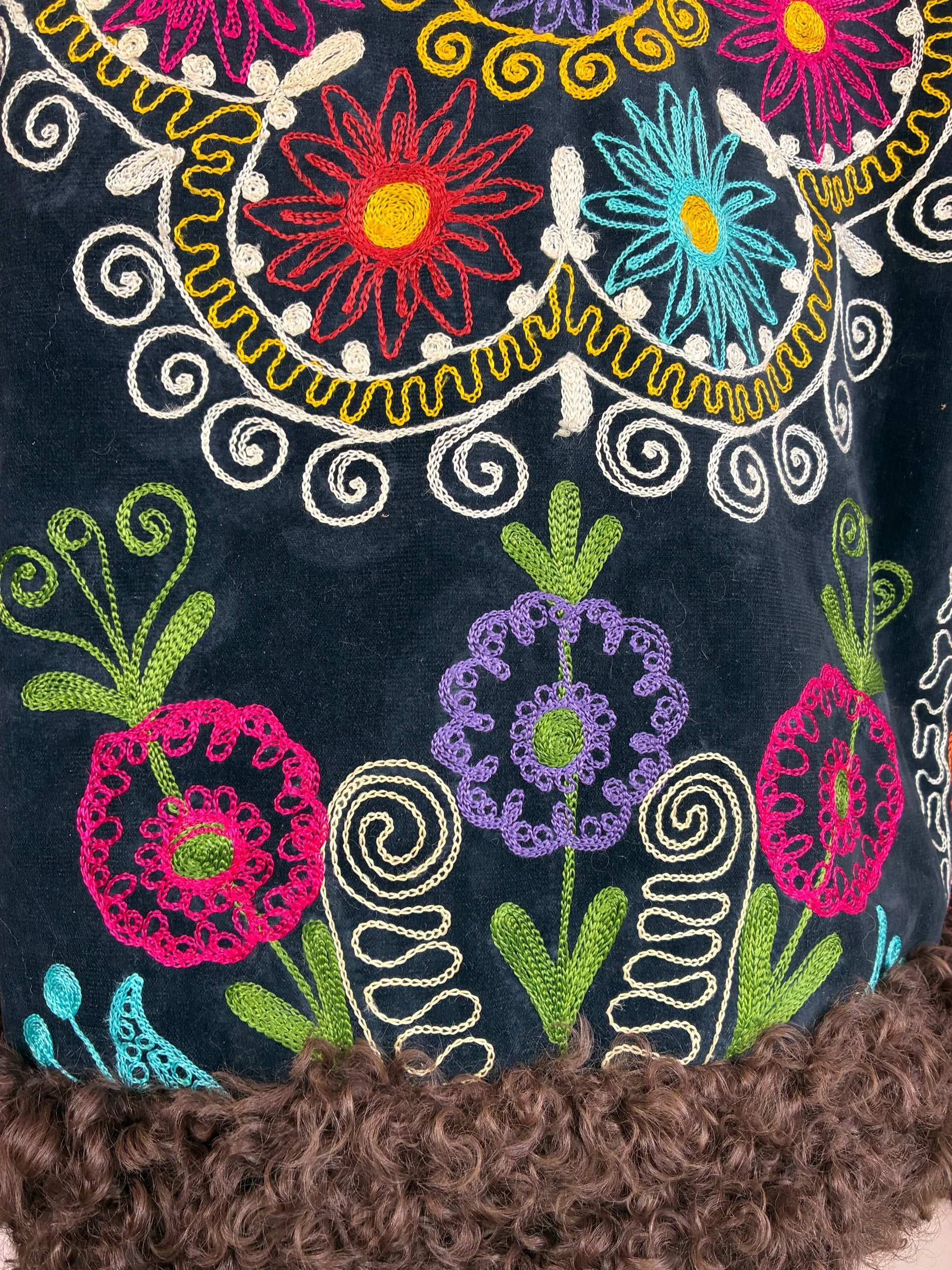 Incredible Afghan inspired coat handmade from preloved velvet Suzani fabric. Unique embroidered textile - one of a kind. Adorned with super soft brown curly Mongolian fur collar, trim and cuffs. Fur lining inside for extra warmth. Two pockets, toggle fastening. A piece of wearable art. Designed to be cherished and treasured.