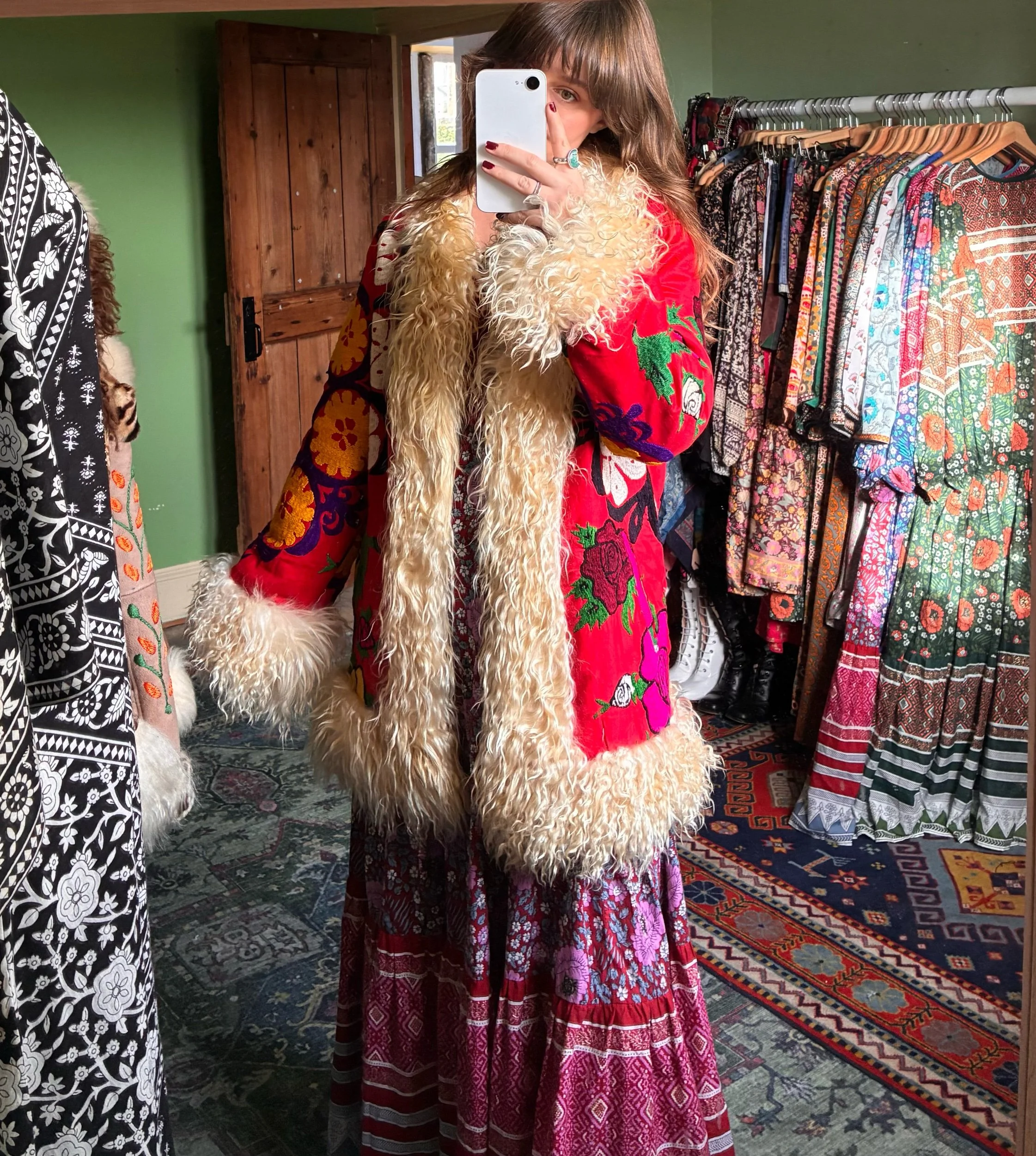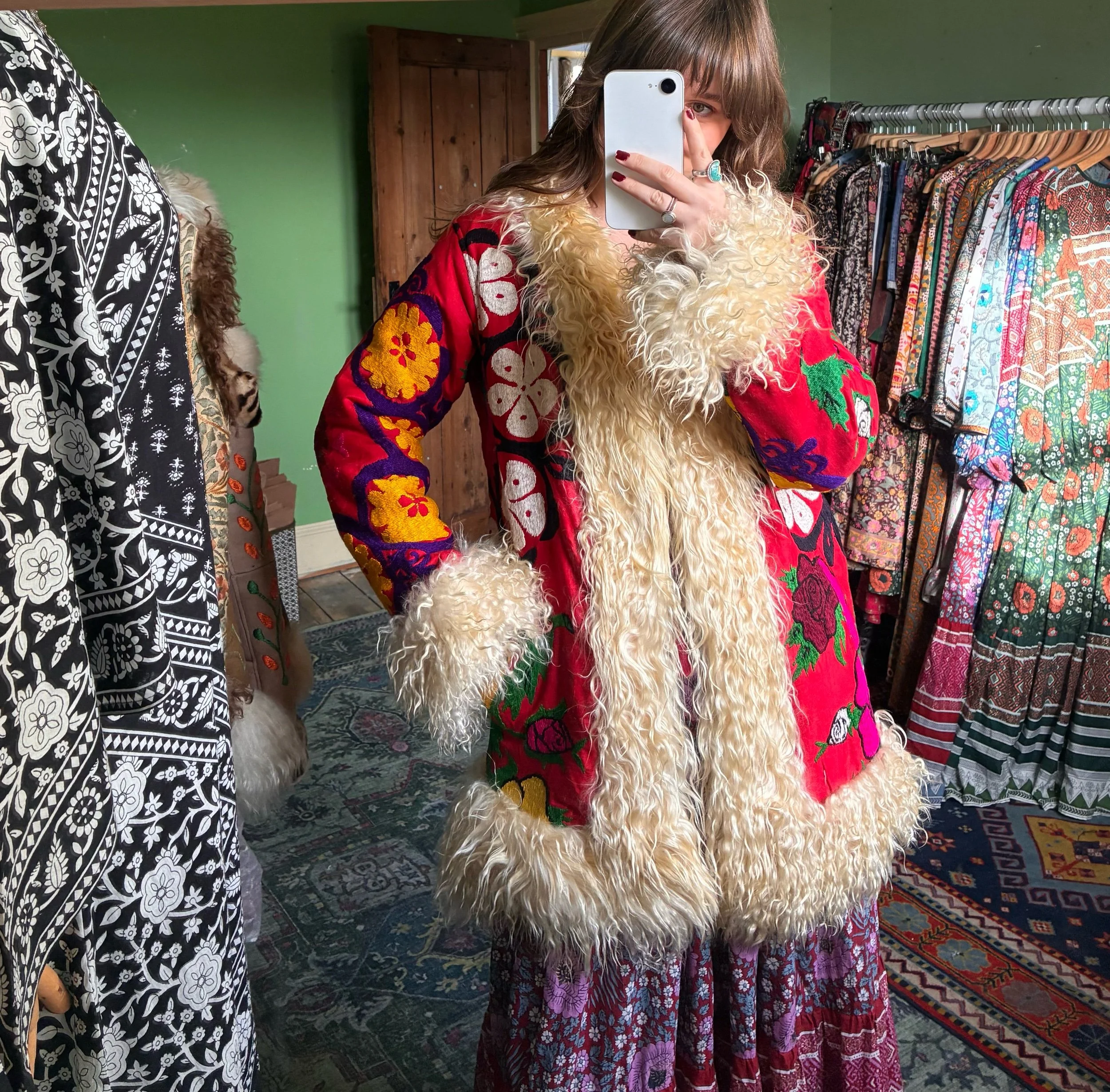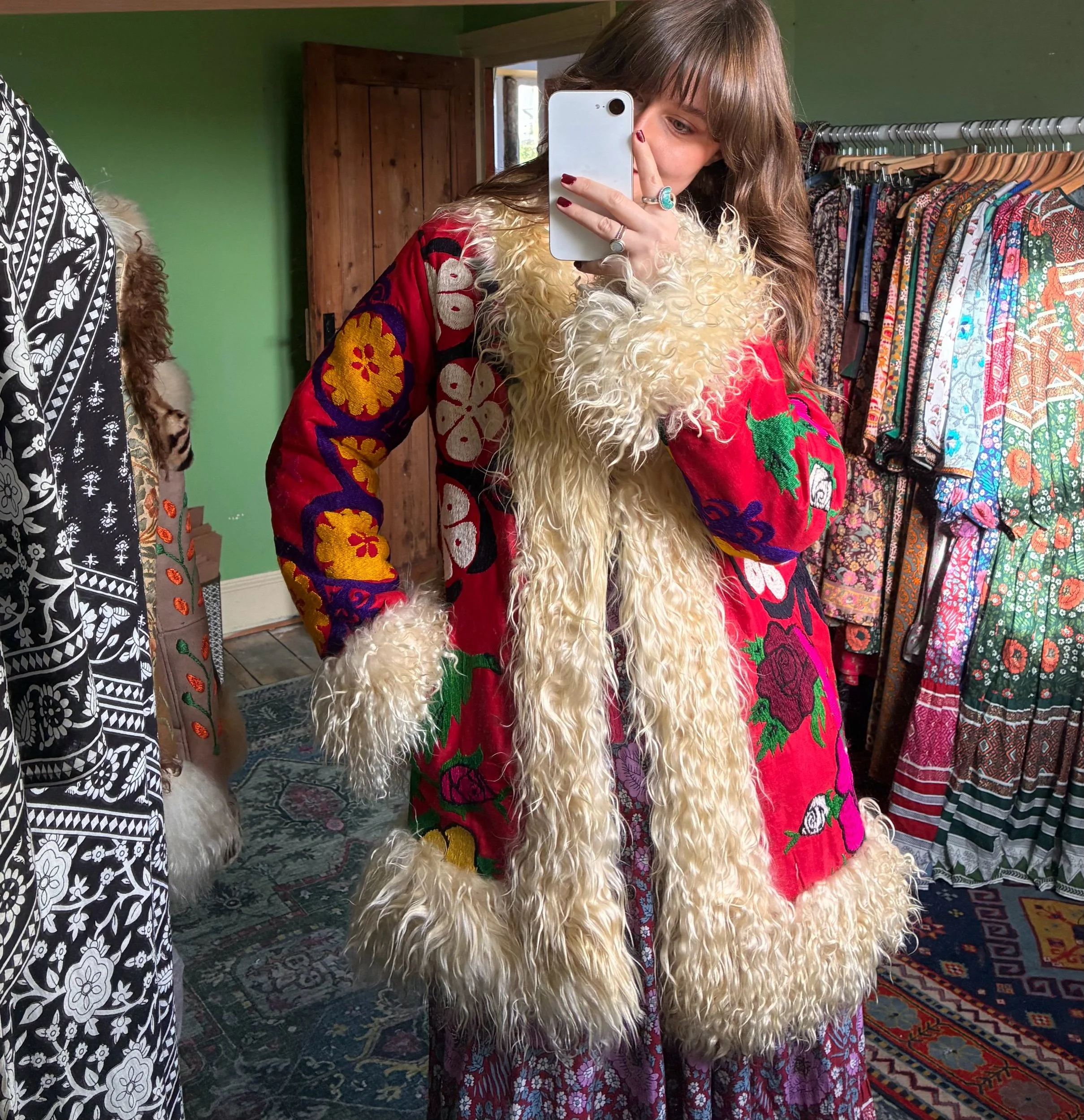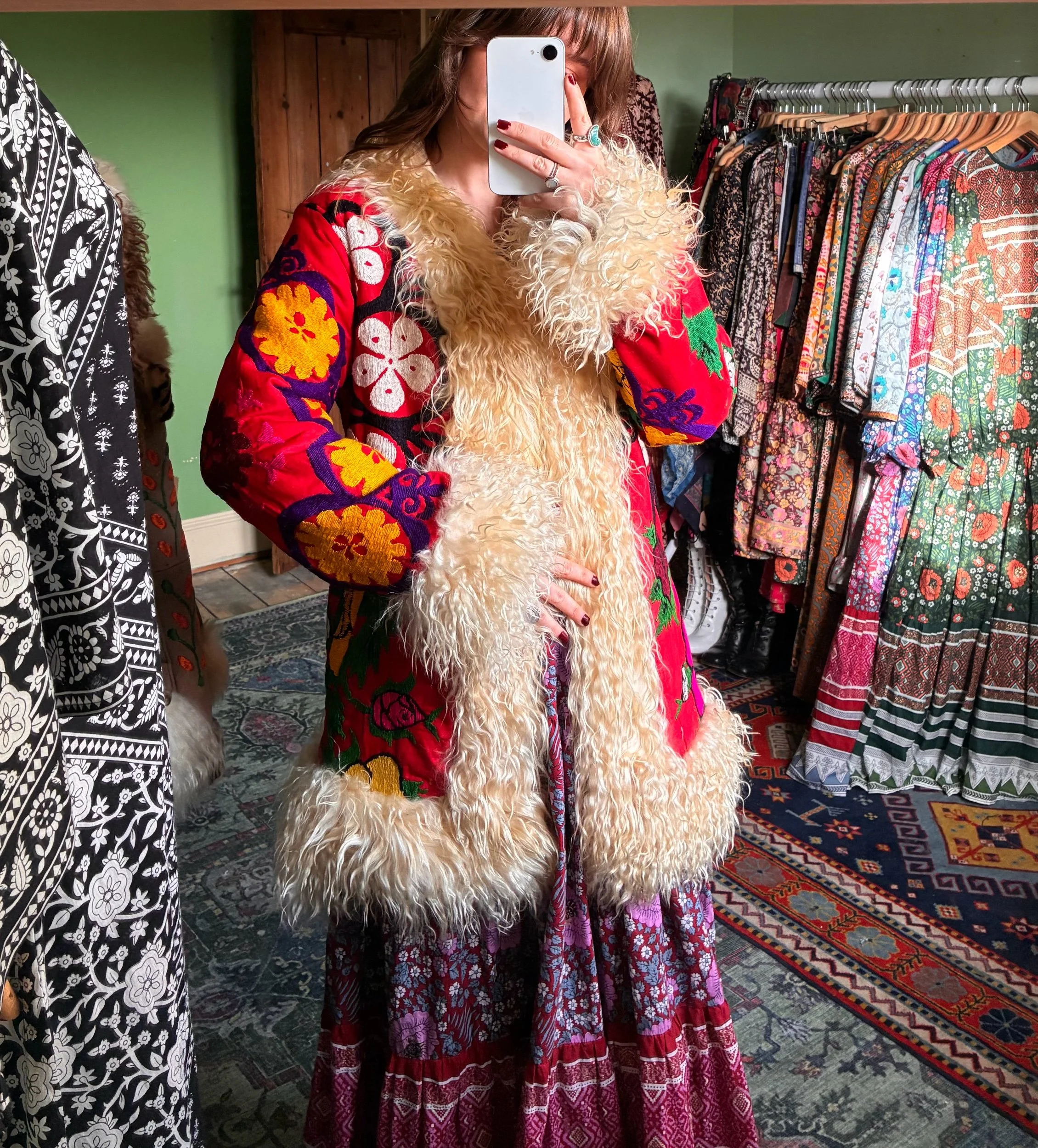 Beautiful Afghan waistcoat, adorned with colourful floral embroidery throughout. Soft, fluffy shearling fur trim and warm fur lining. Two front pockets. One of a kind. This collection is handmade using vintage pre-loved deadstock and reclaimed materials. Don’t let your favourite get away…