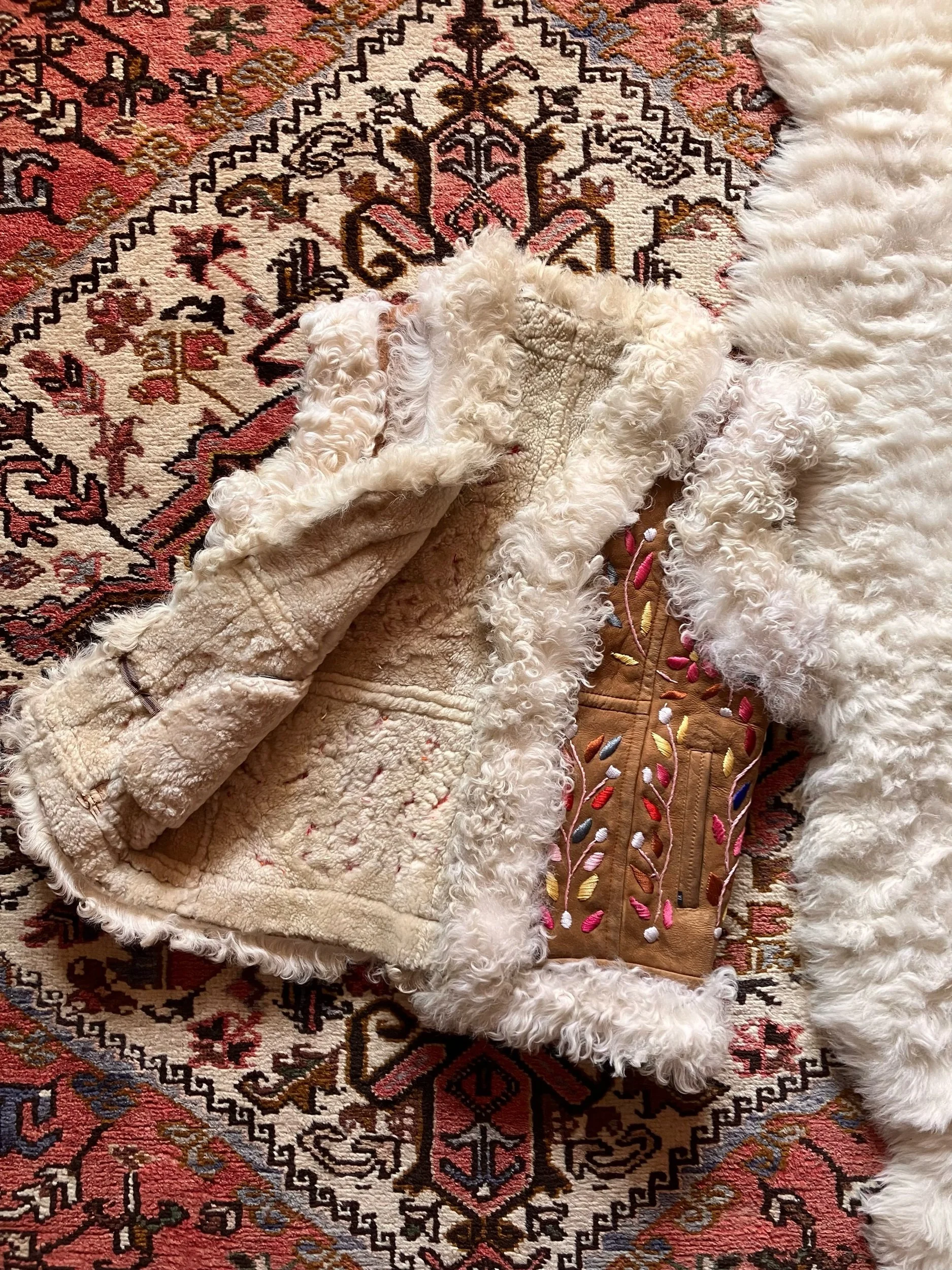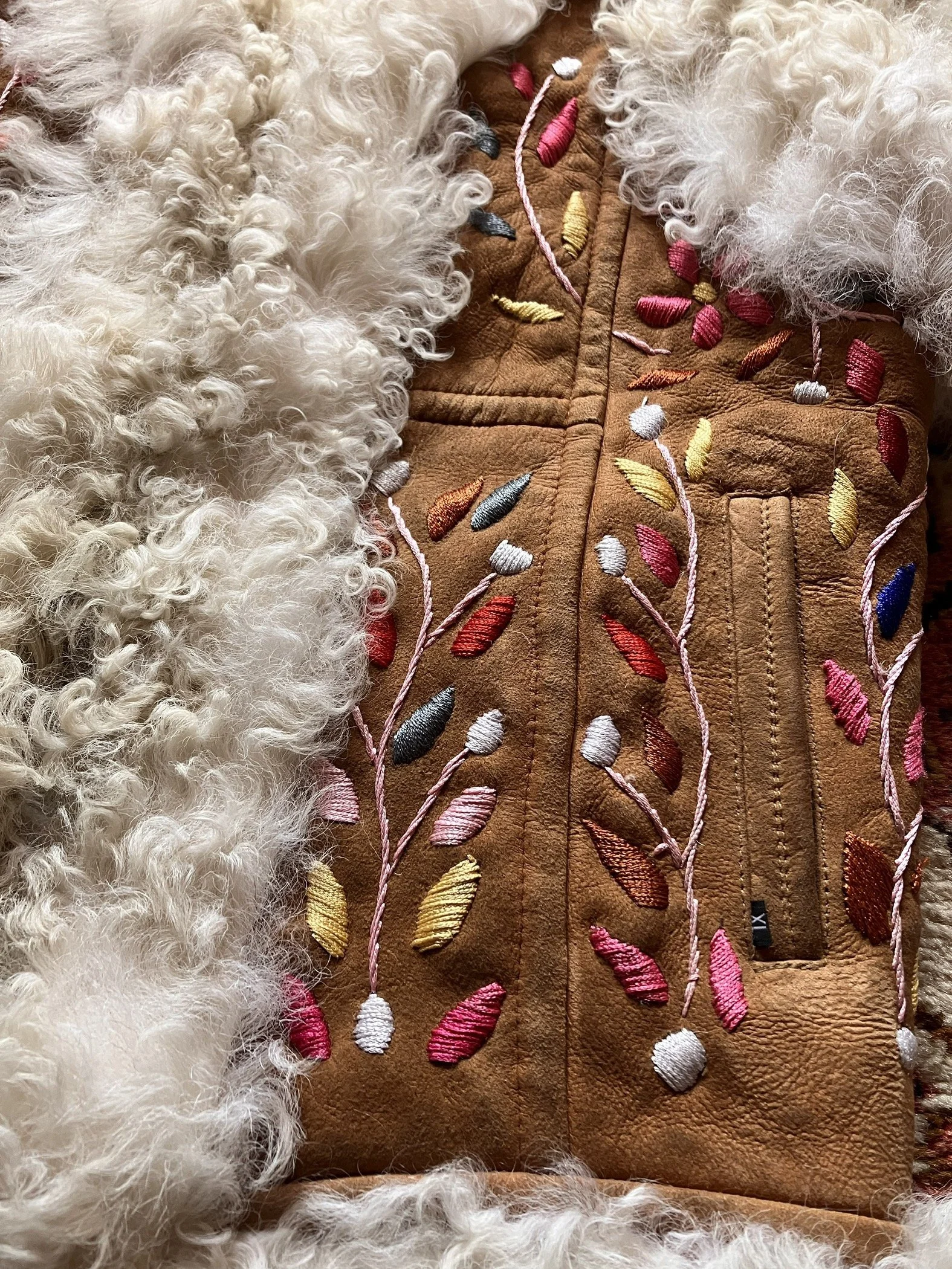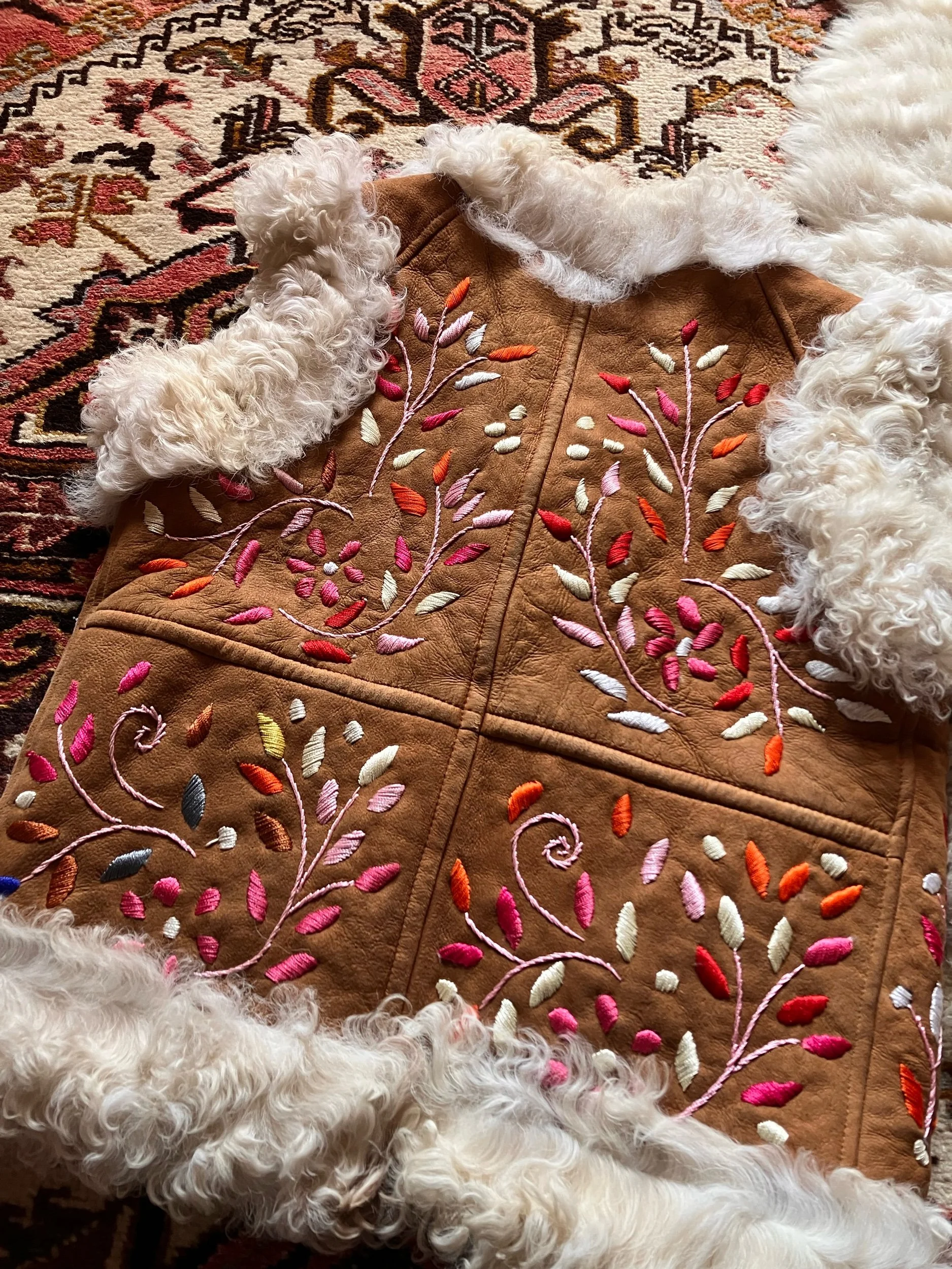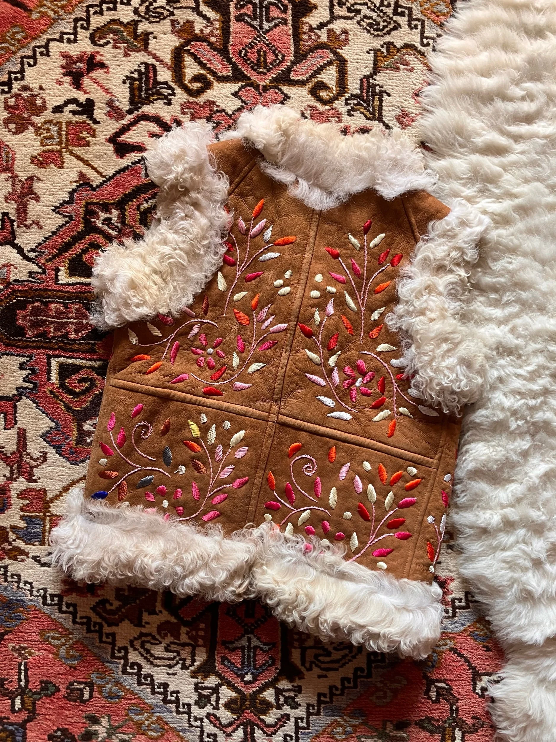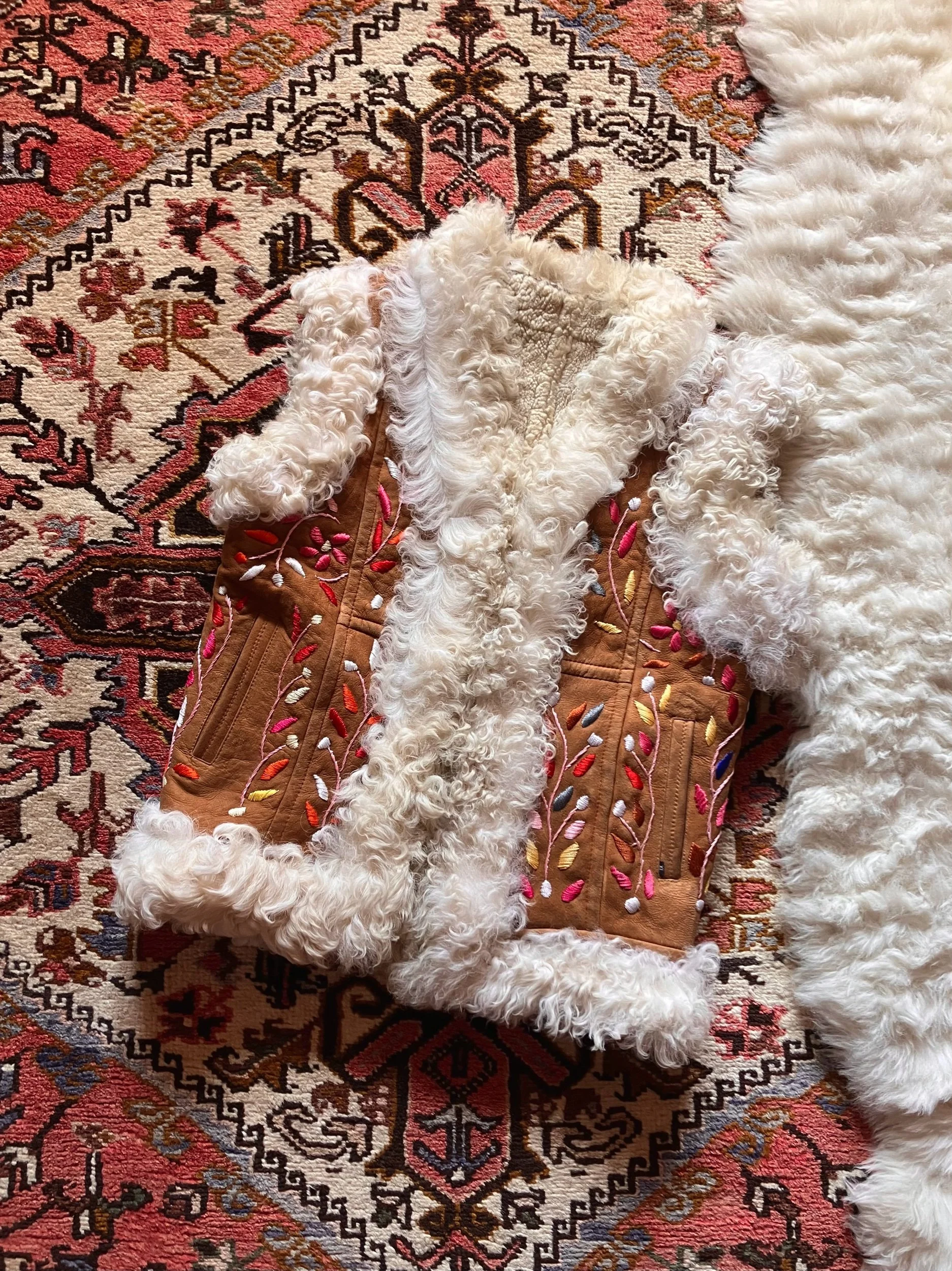 Beautiful Afghan waistcoat, adorned with colourful floral embroidery throughout. Soft, fluffy shearling fur trim and warm fur lining. Two front pockets. One of a kind. This collection is handmade using vintage pre-loved deadstock and reclaimed materials. Don’t let your favourite get away…