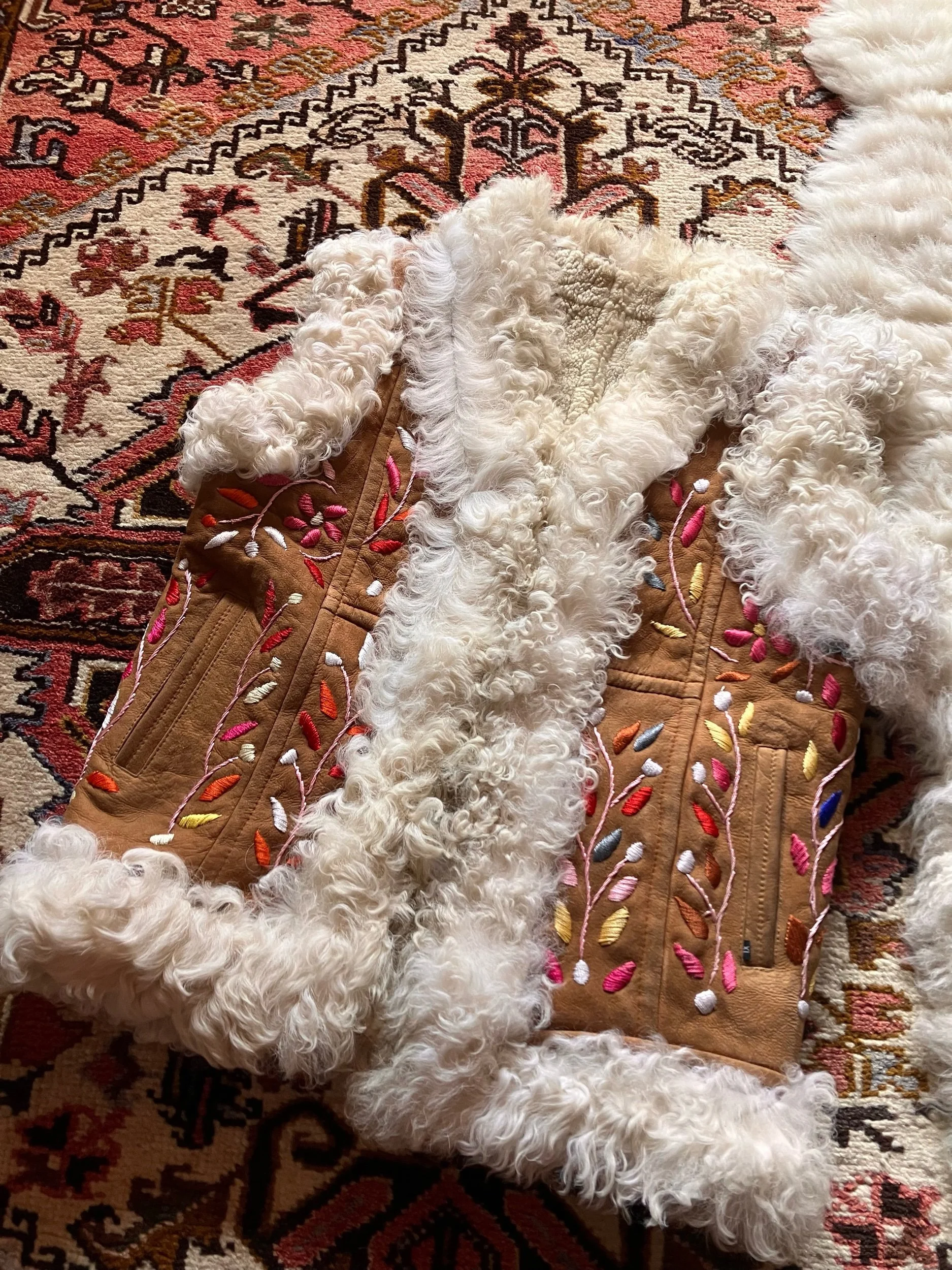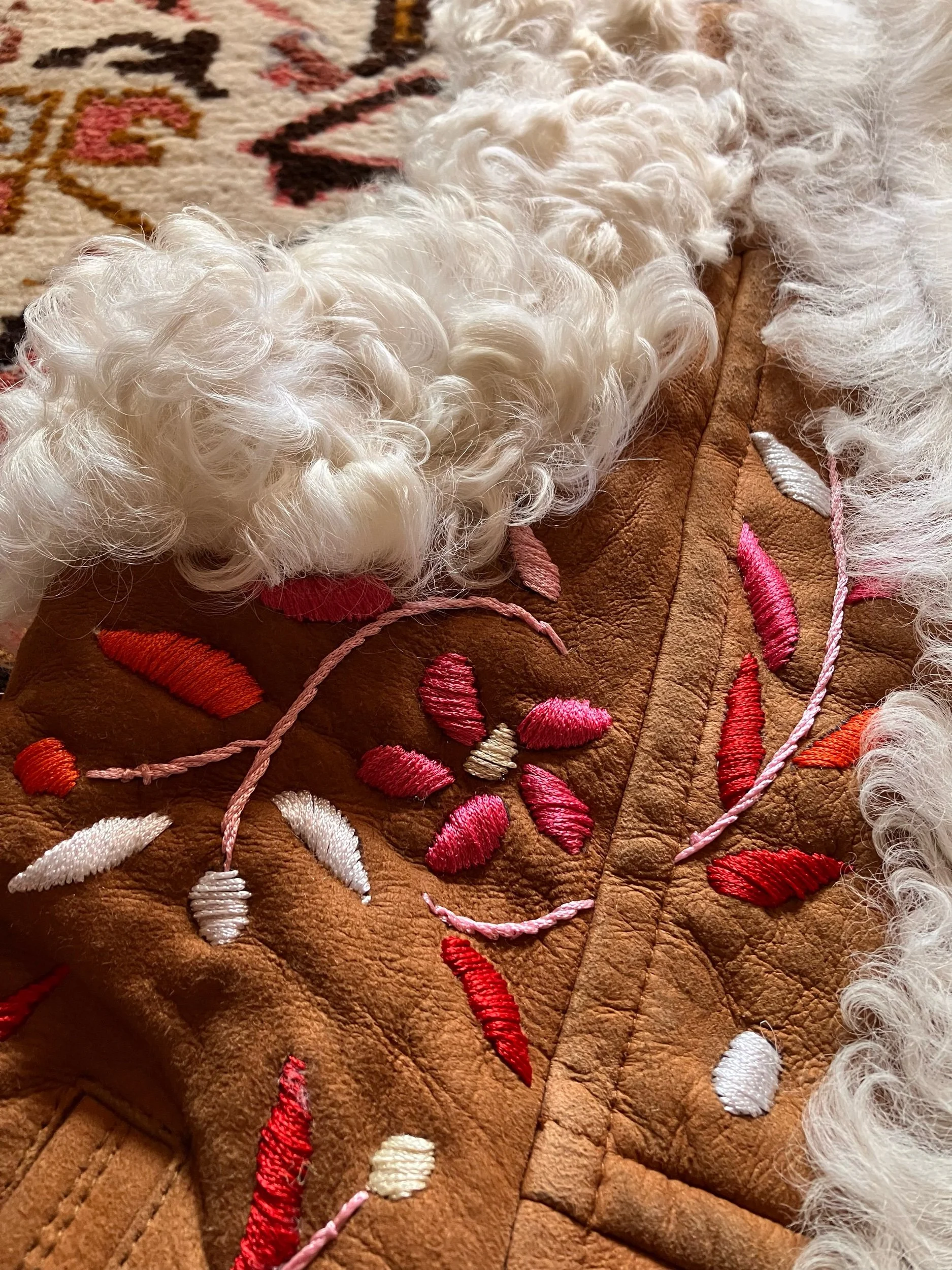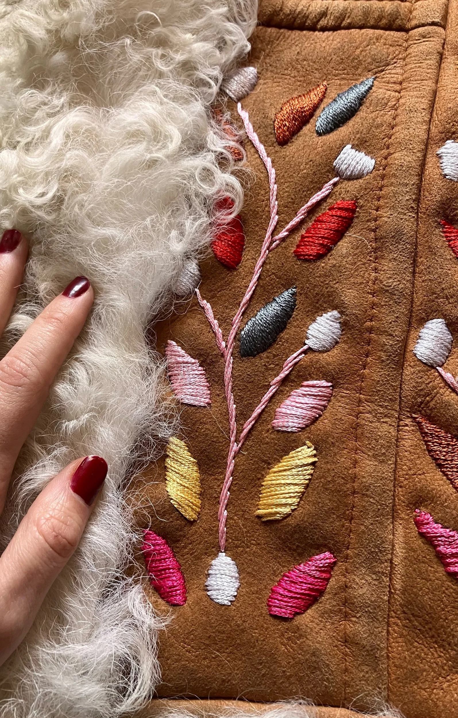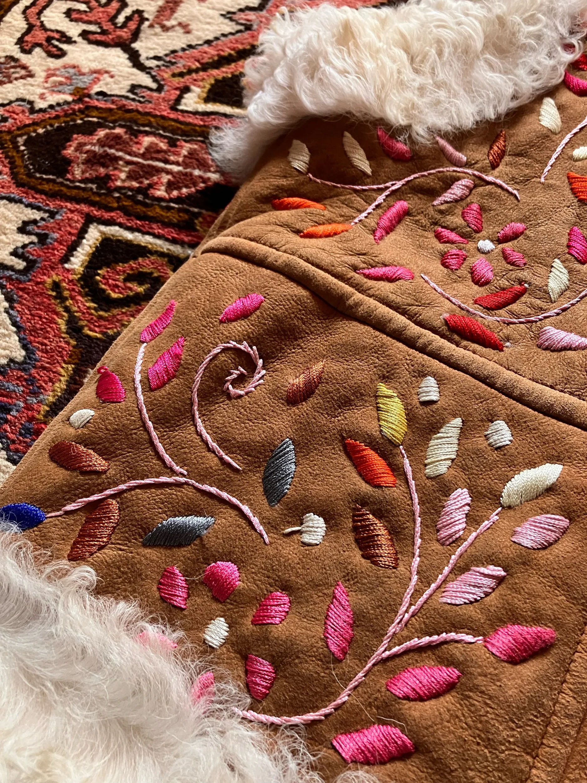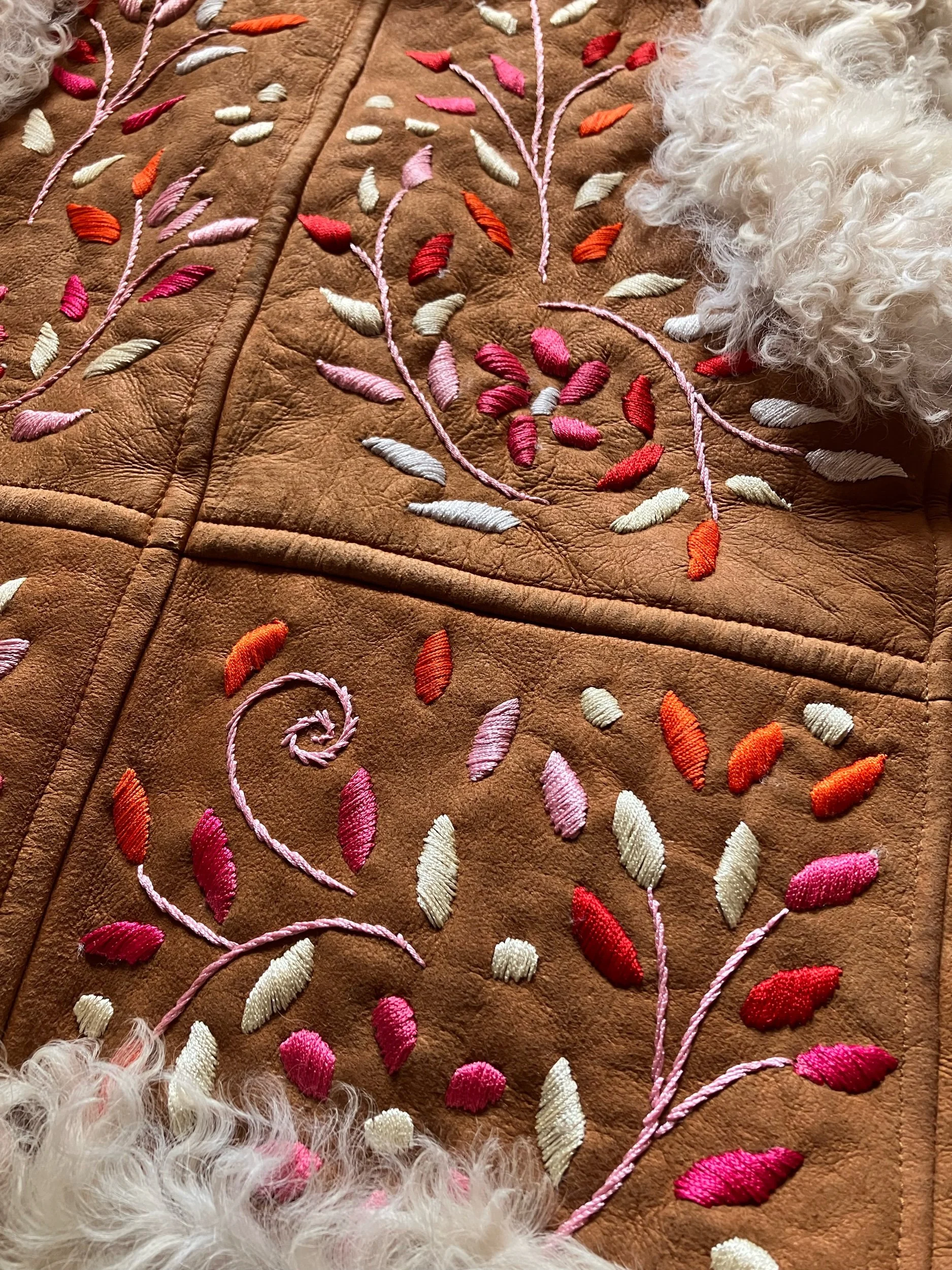 Beautiful Afghan waistcoat, adorned with colourful floral embroidery throughout. Soft, fluffy shearling fur trim and warm fur lining. Two front pockets. One of a kind. This collection is handmade using vintage pre-loved deadstock and reclaimed materials. Don’t let your favourite get away…
