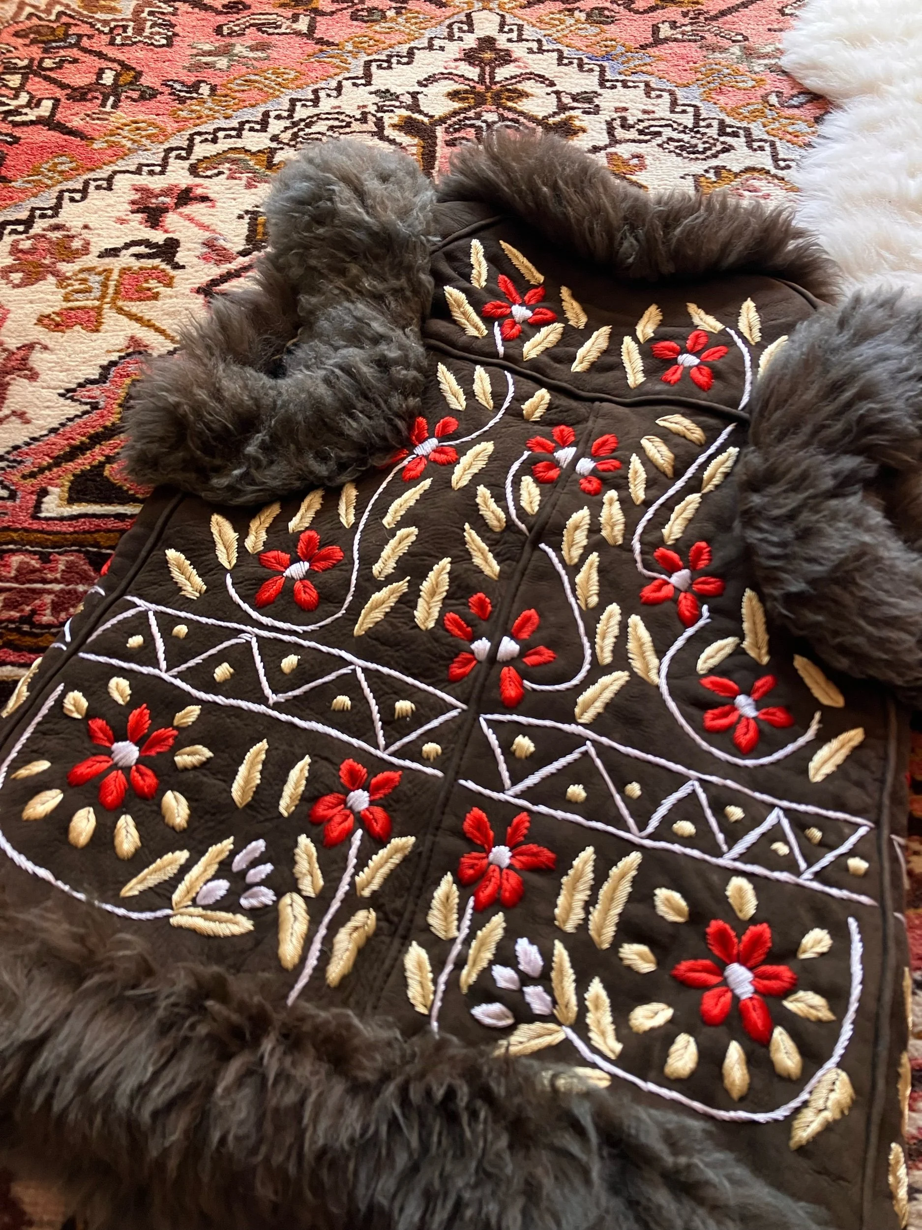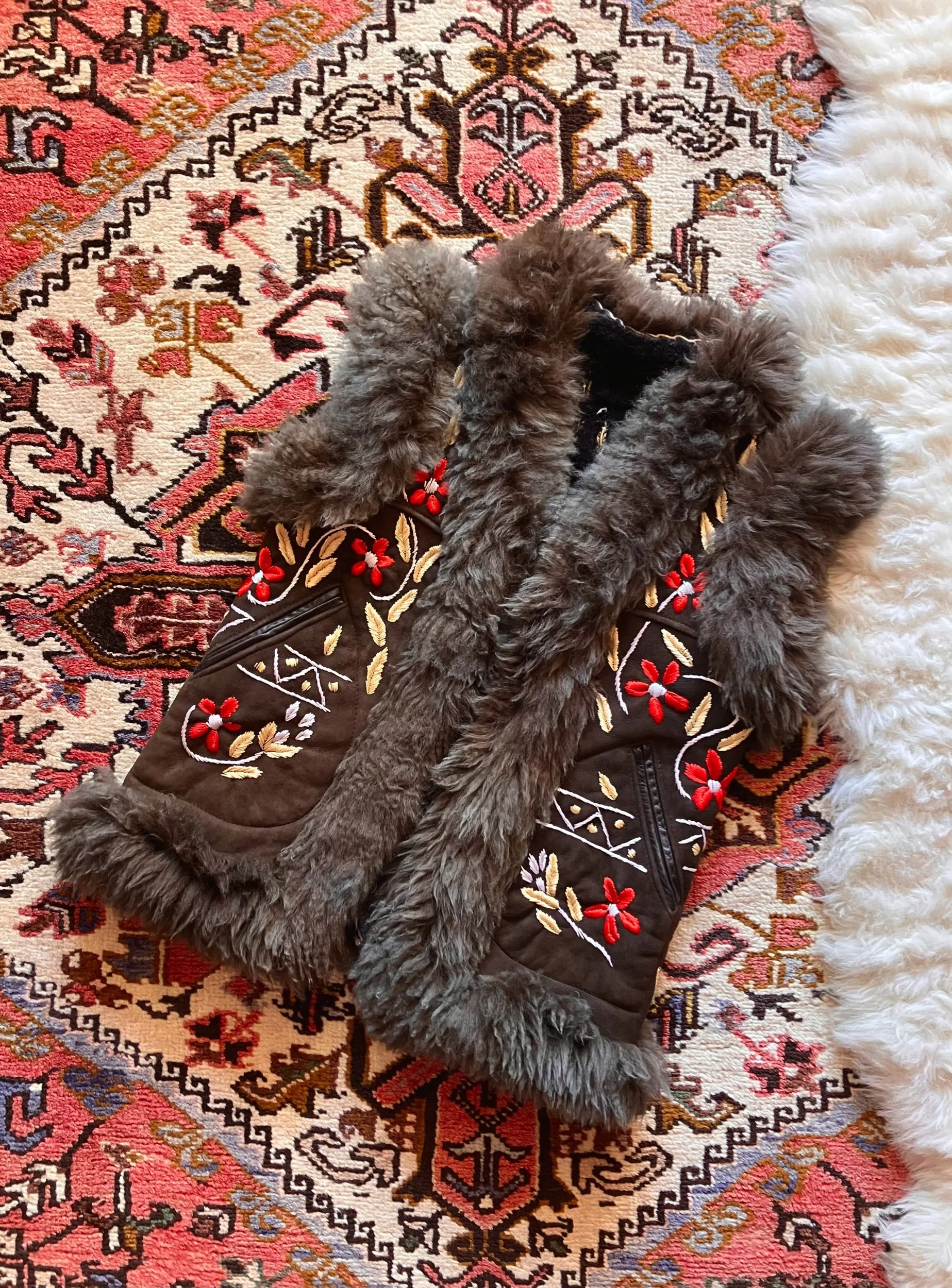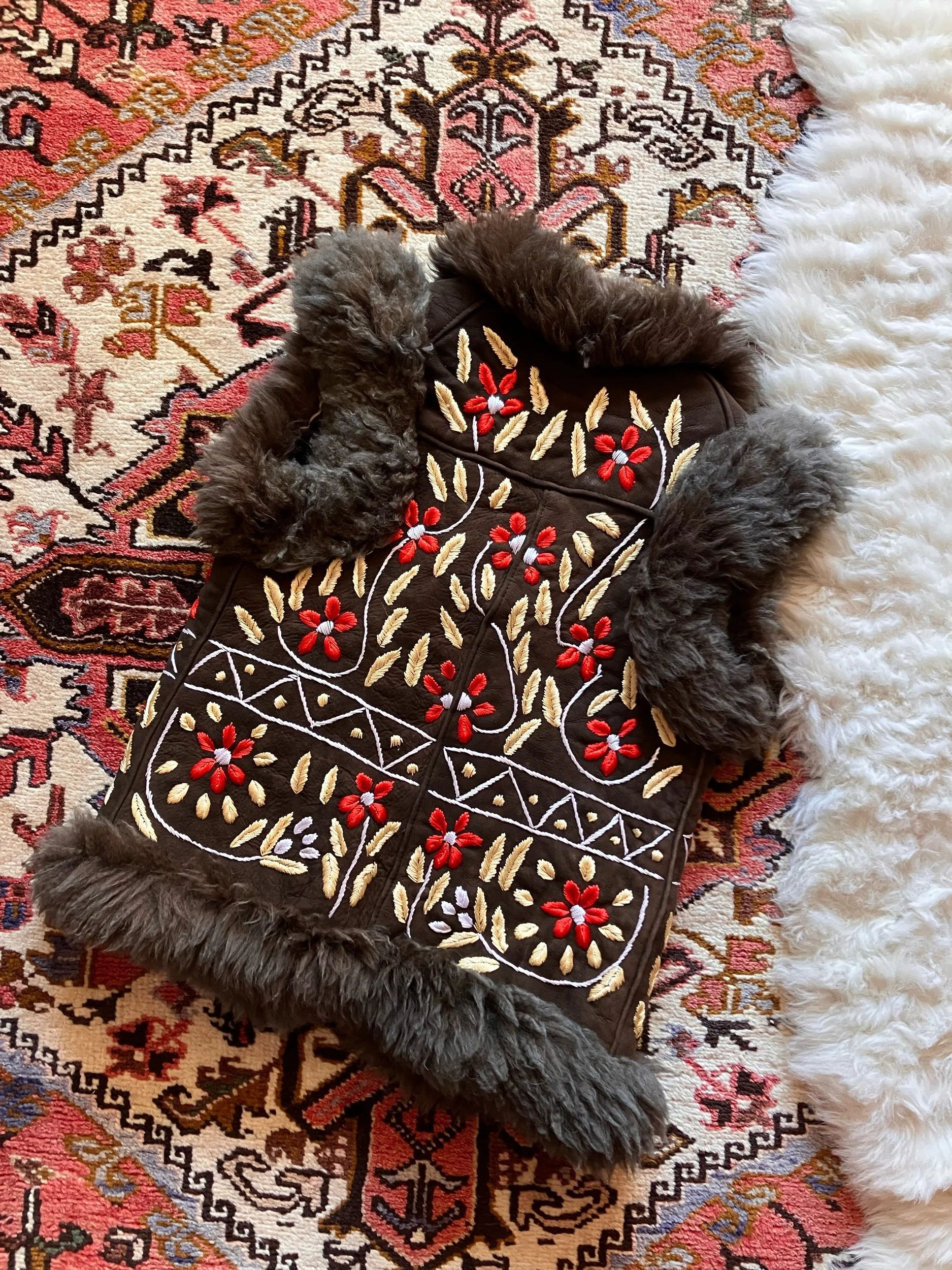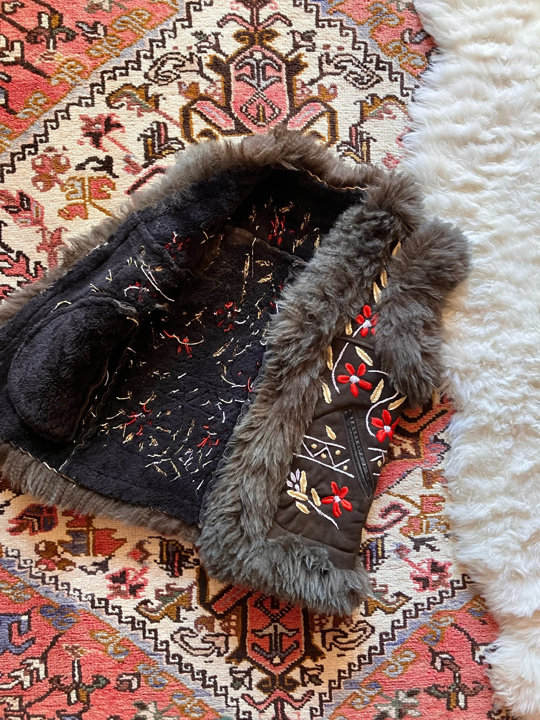 Beautiful Afghan waistcoat, adorned with colourful floral embroidery throughout. Soft, fluffy shearling fur trim and warm fur lining. Two front pockets. One of a kind. This collection is handmade using vintage pre-loved deadstock and reclaimed materials. Don’t let your favourite get away…