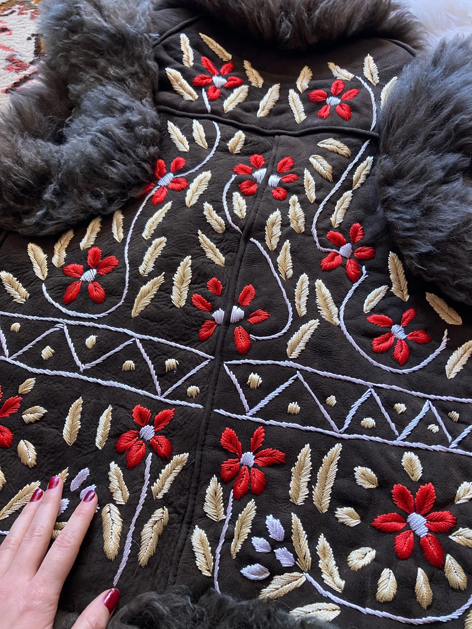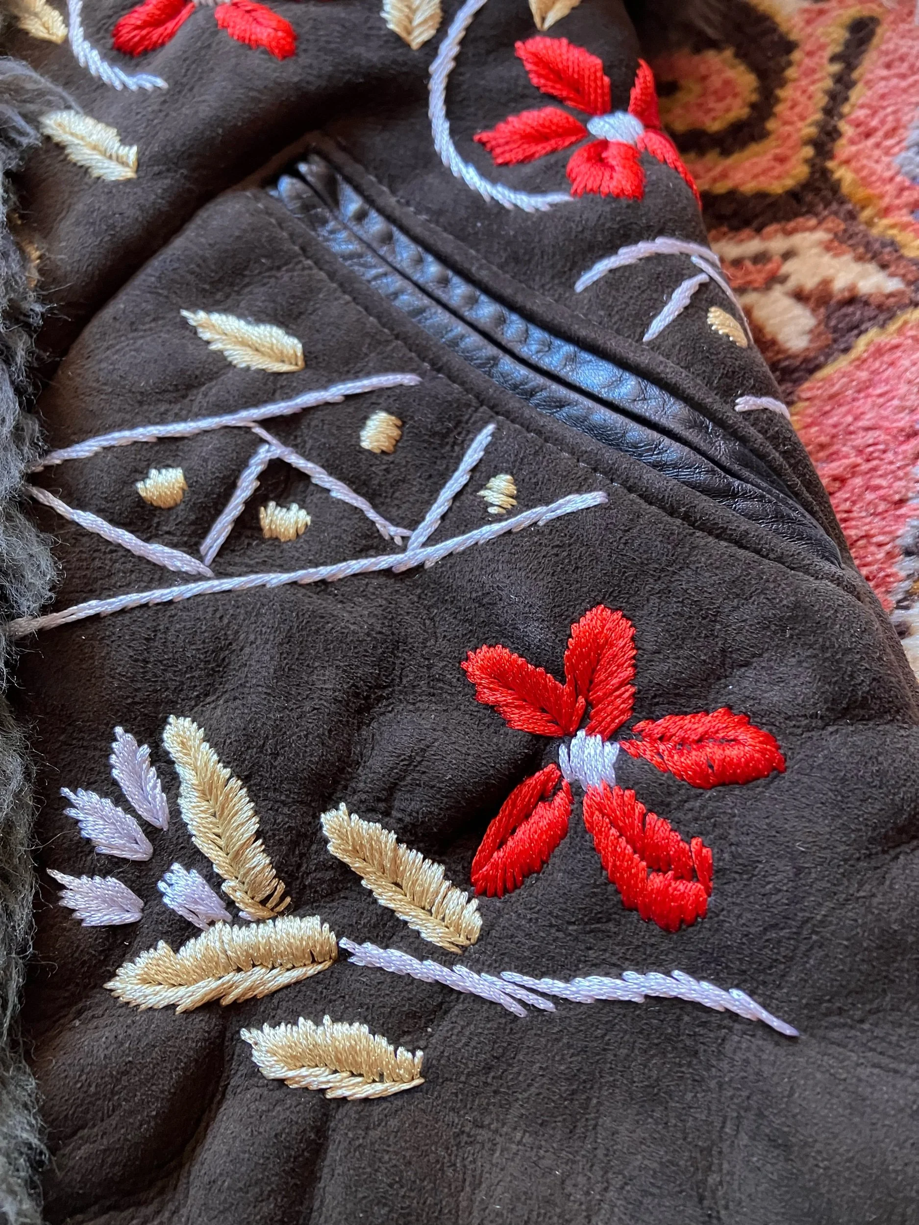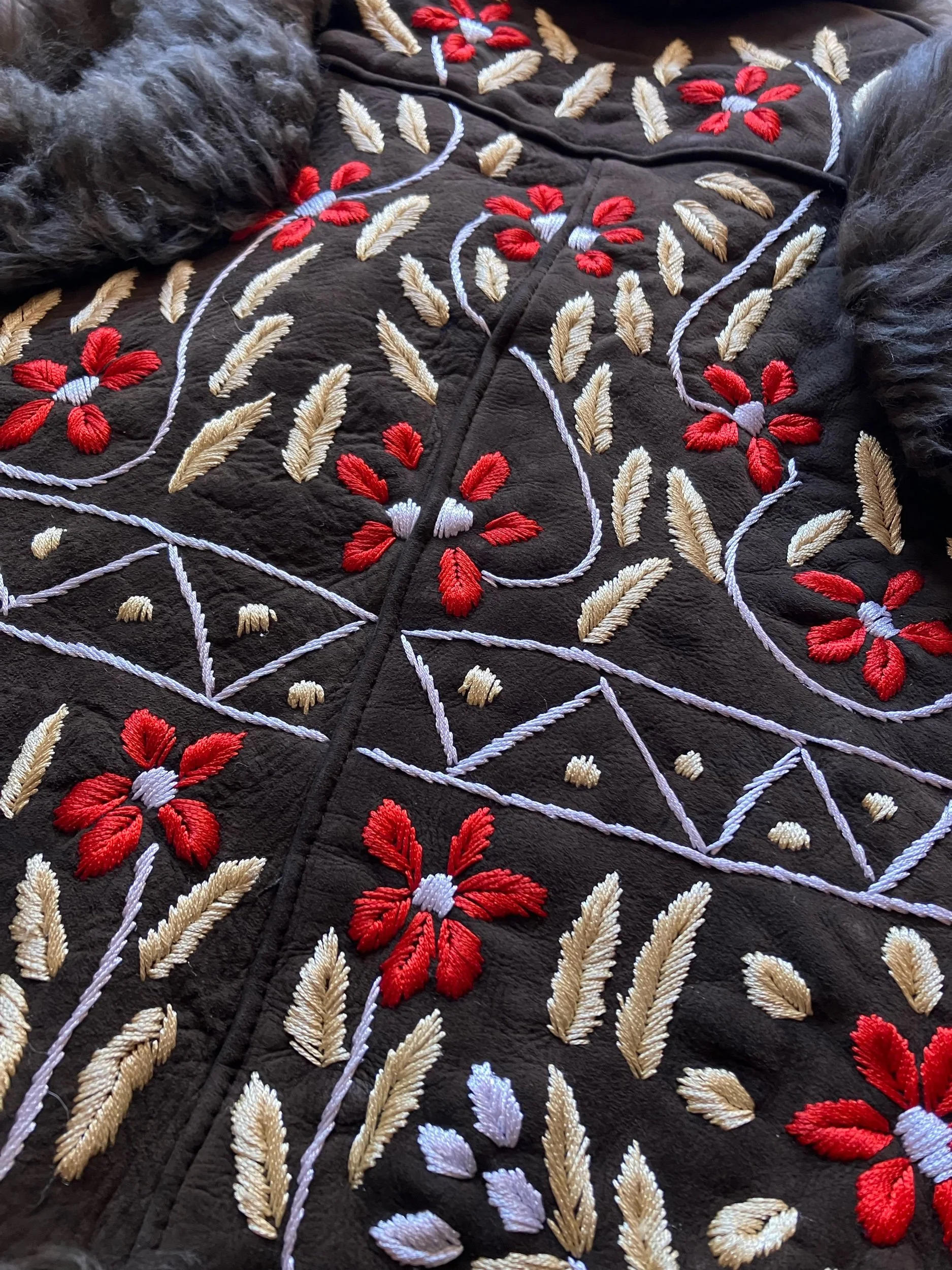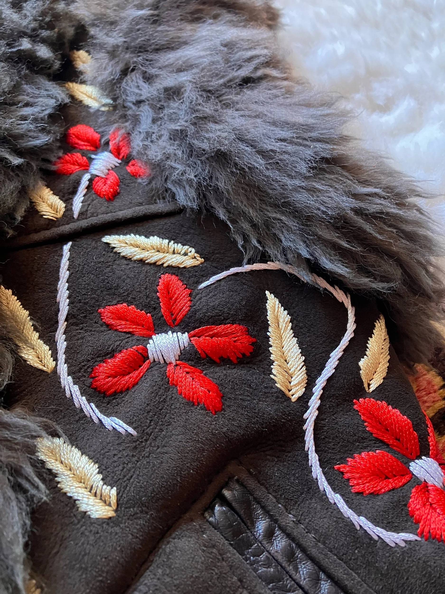 Beautiful Afghan waistcoat, adorned with colourful floral embroidery throughout. Soft, fluffy shearling fur trim and warm fur lining. Two front pockets. One of a kind. This collection is handmade using vintage pre-loved deadstock and reclaimed materials. Don’t let your favourite get away…