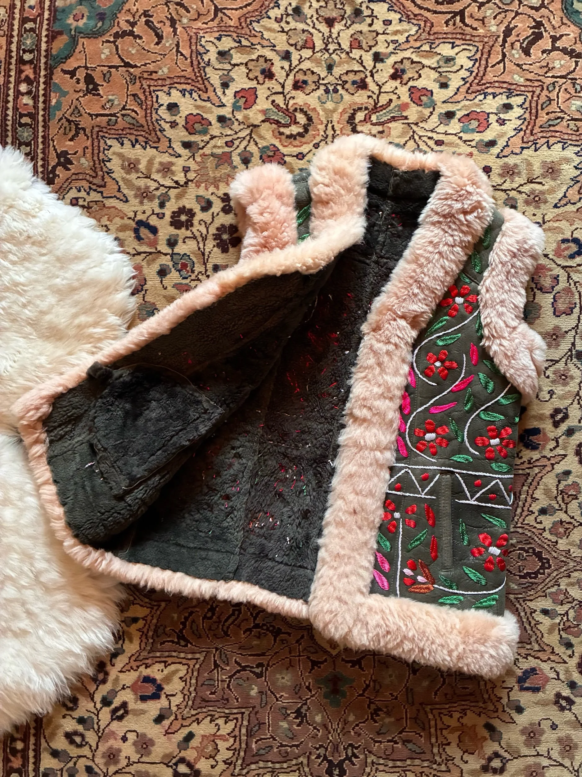 Beautiful Afghan waistcoat, adorned with colourful floral embroidery throughout. Soft, fluffy shearling fur trim and warm fur lining. Two front pockets. One of a kind. This collection is handmade using vintage pre-loved deadstock and reclaimed materials. Don’t let your favourite get away…
