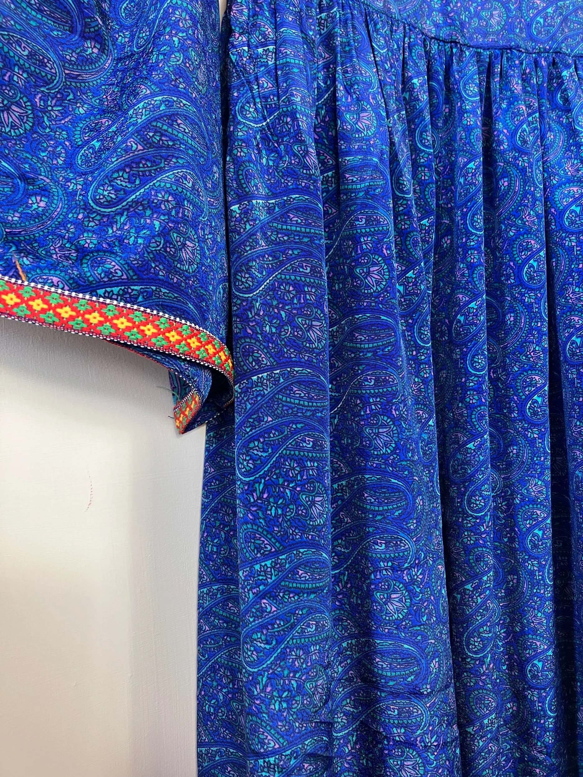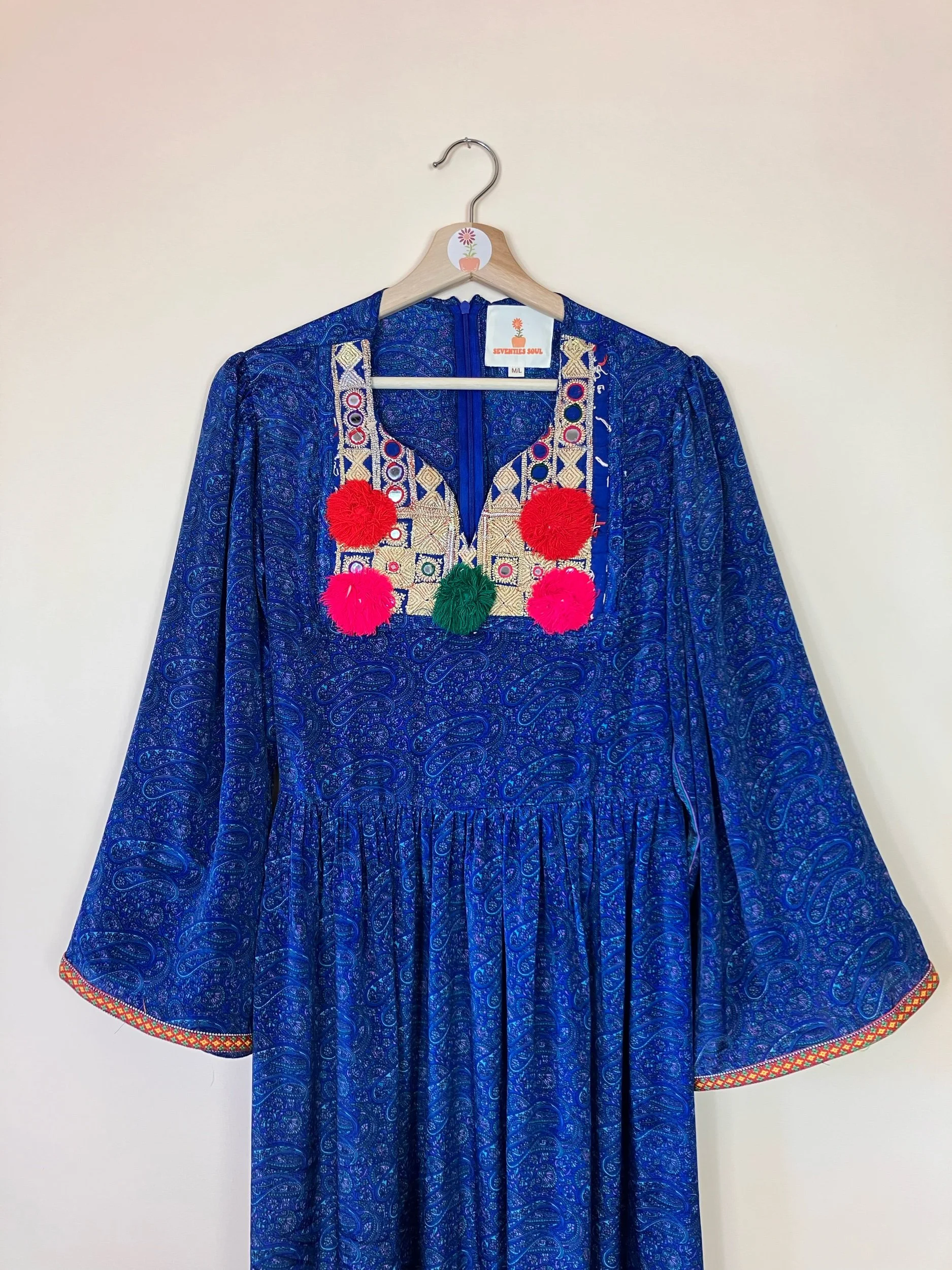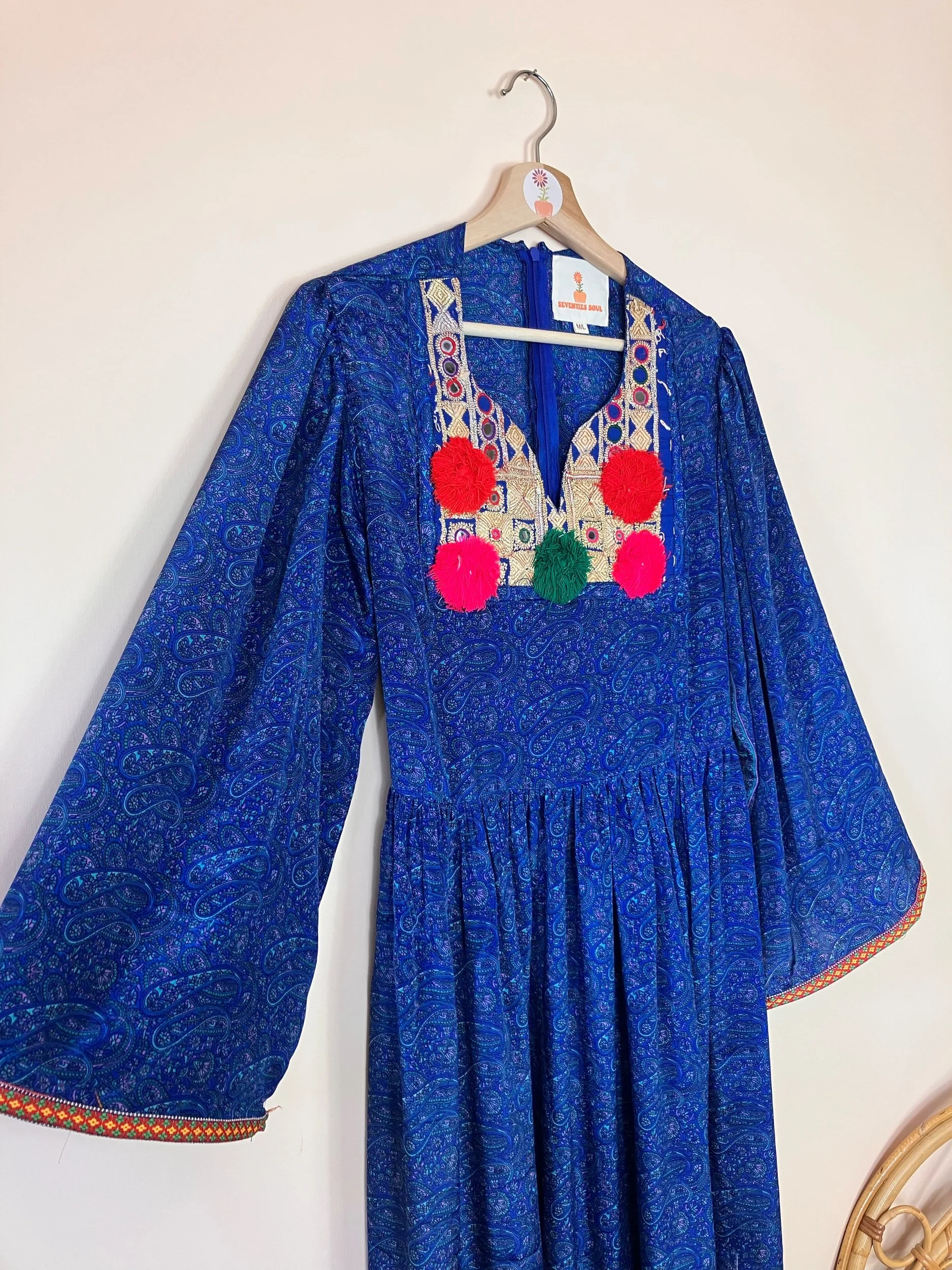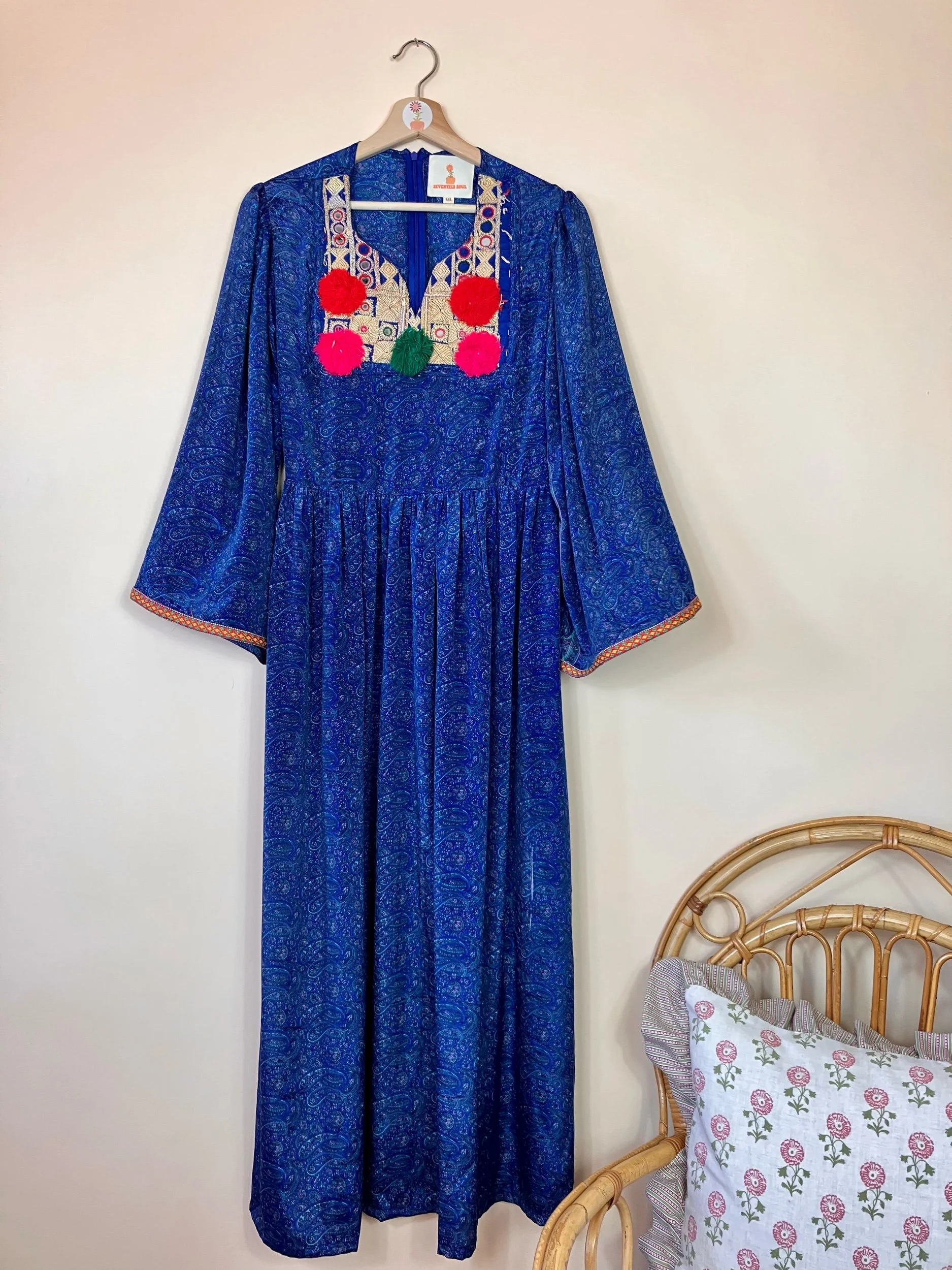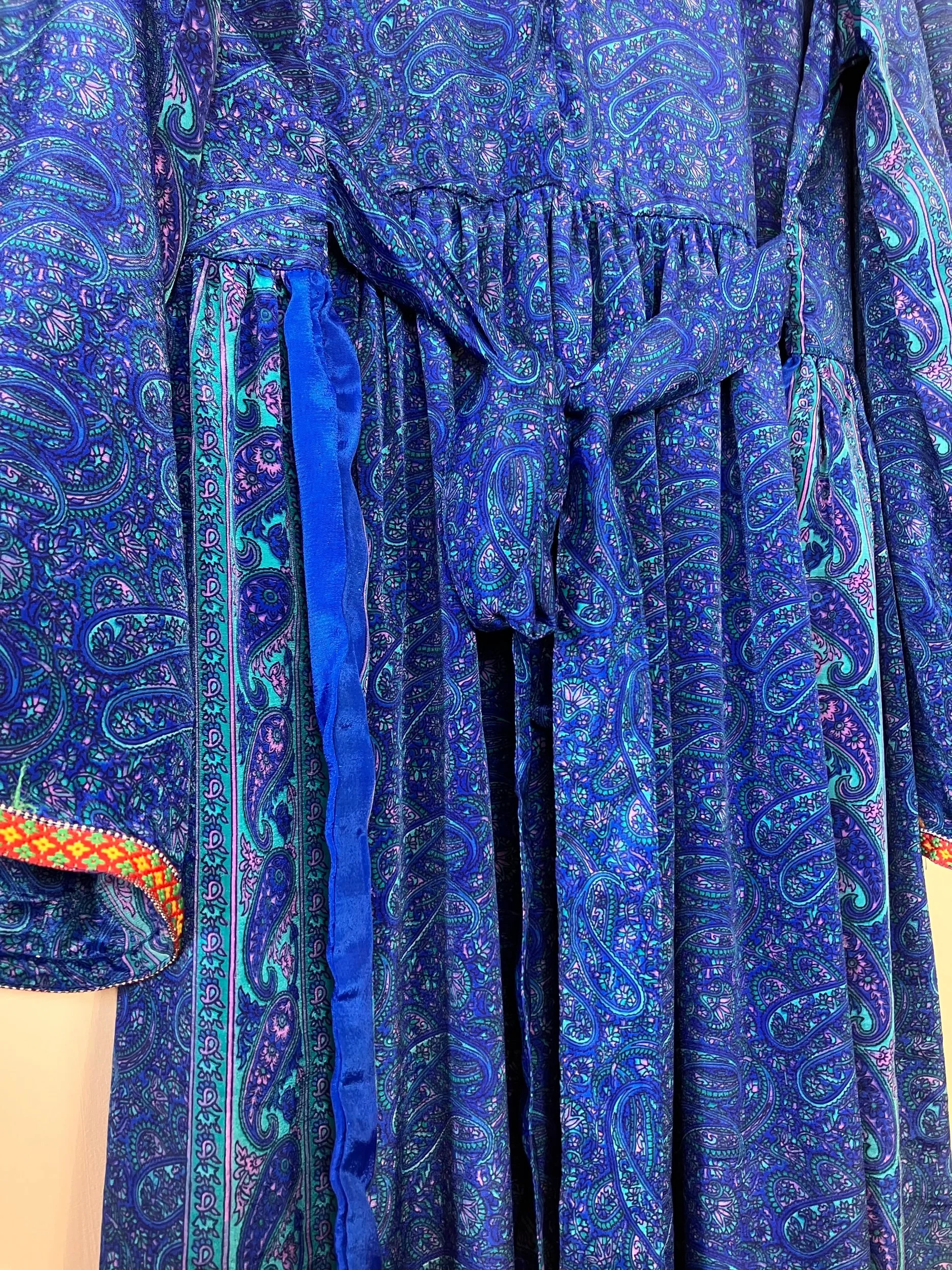 Handmade with 100% recycled and pre-loved saree silk. One of a kind dress adorned with a vintage embroidered bib. Inspired by traditional afghani dresses.