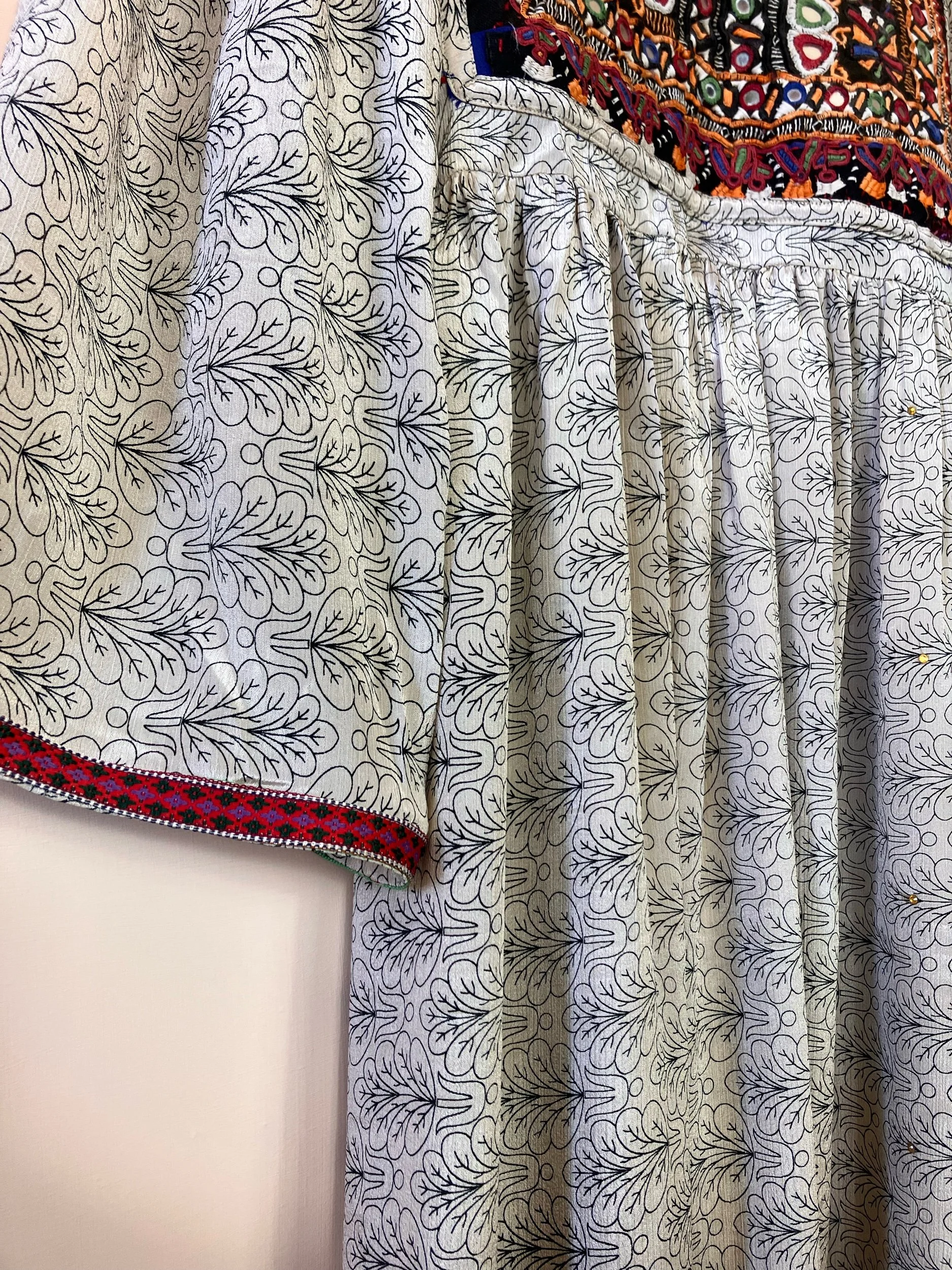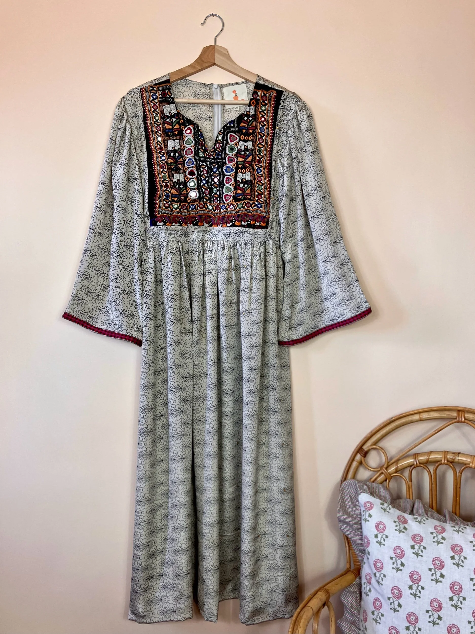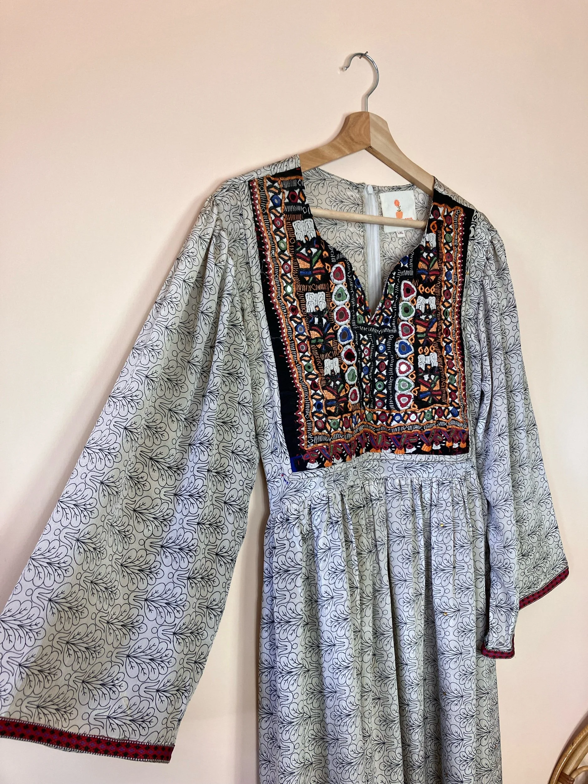 Handmade with 100% recycled and pre-loved saree silk. One of a kind dress adorned with a vintage embroidered bib. Inspired by traditional afghani dresses.