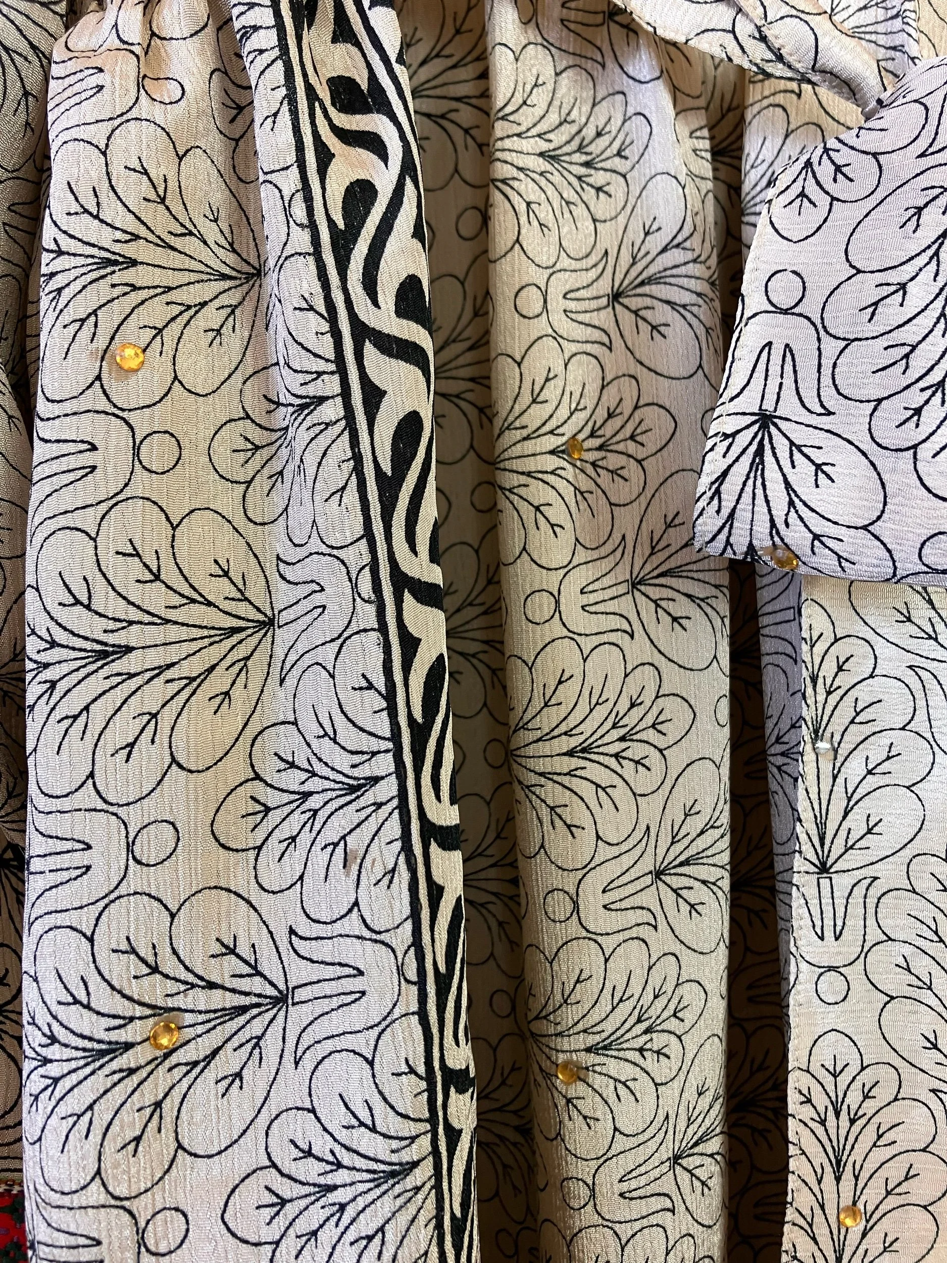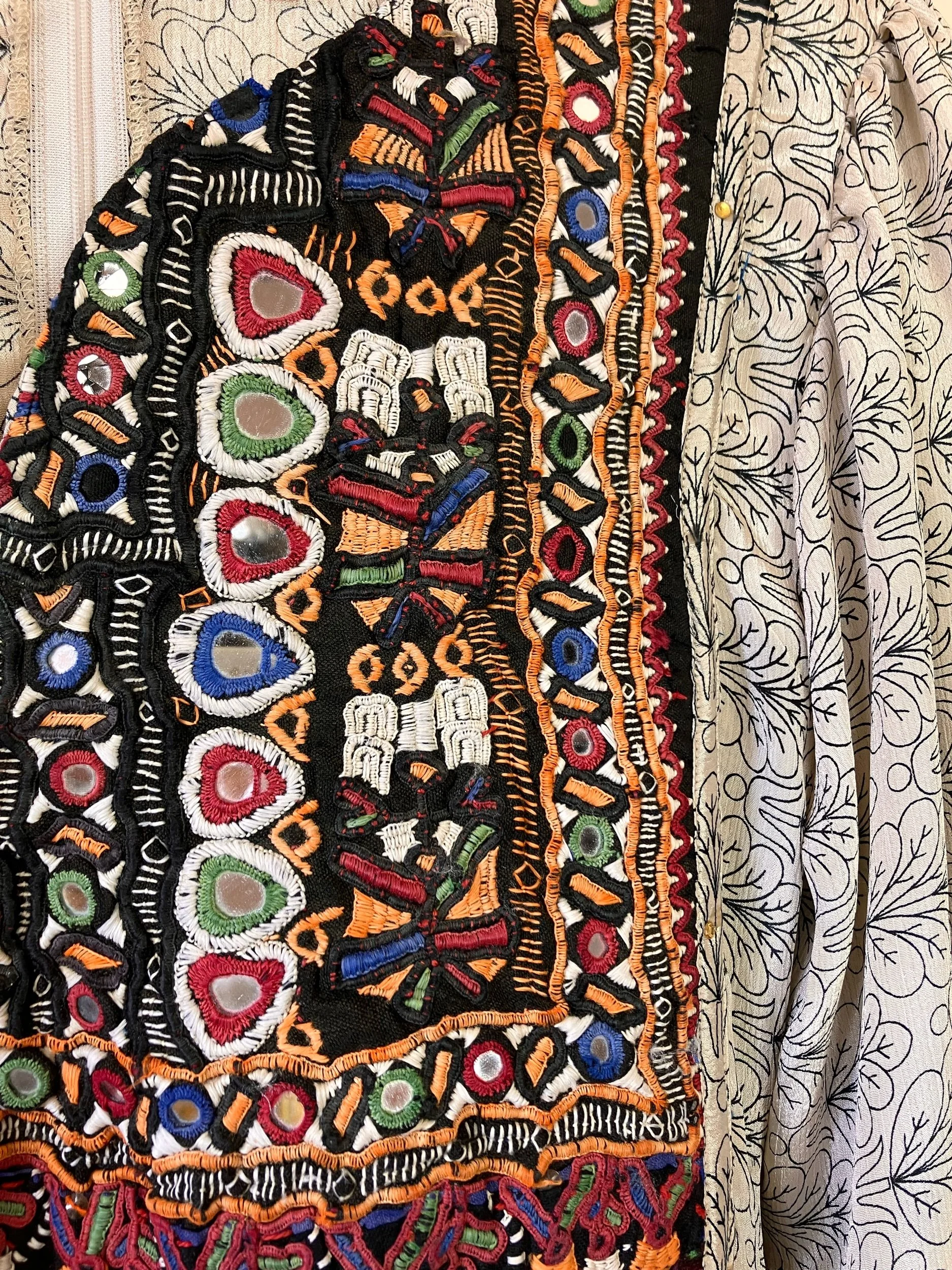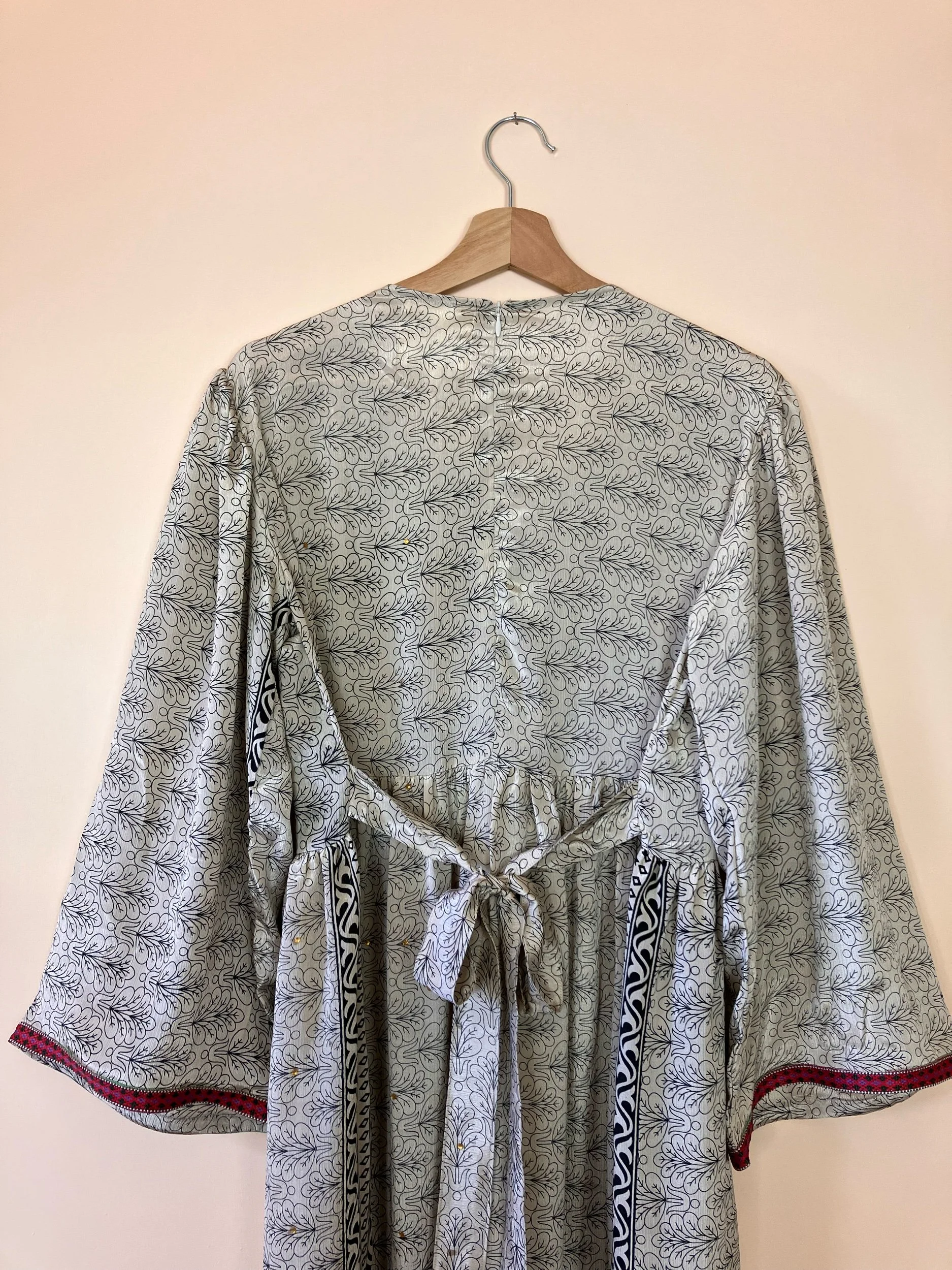 Handmade with 100% recycled and pre-loved saree silk. One of a kind dress adorned with a vintage embroidered bib. Inspired by traditional afghani dresses.