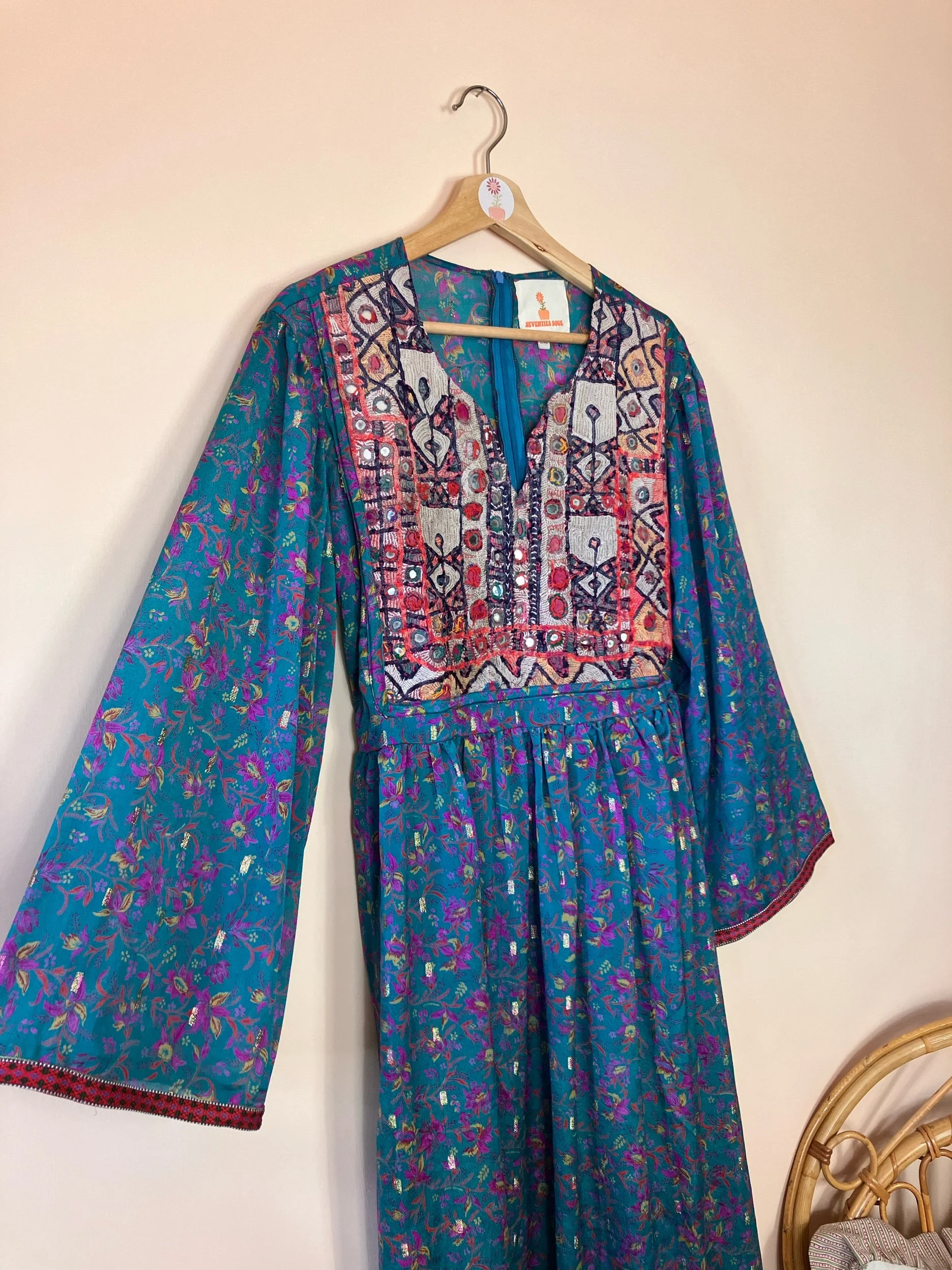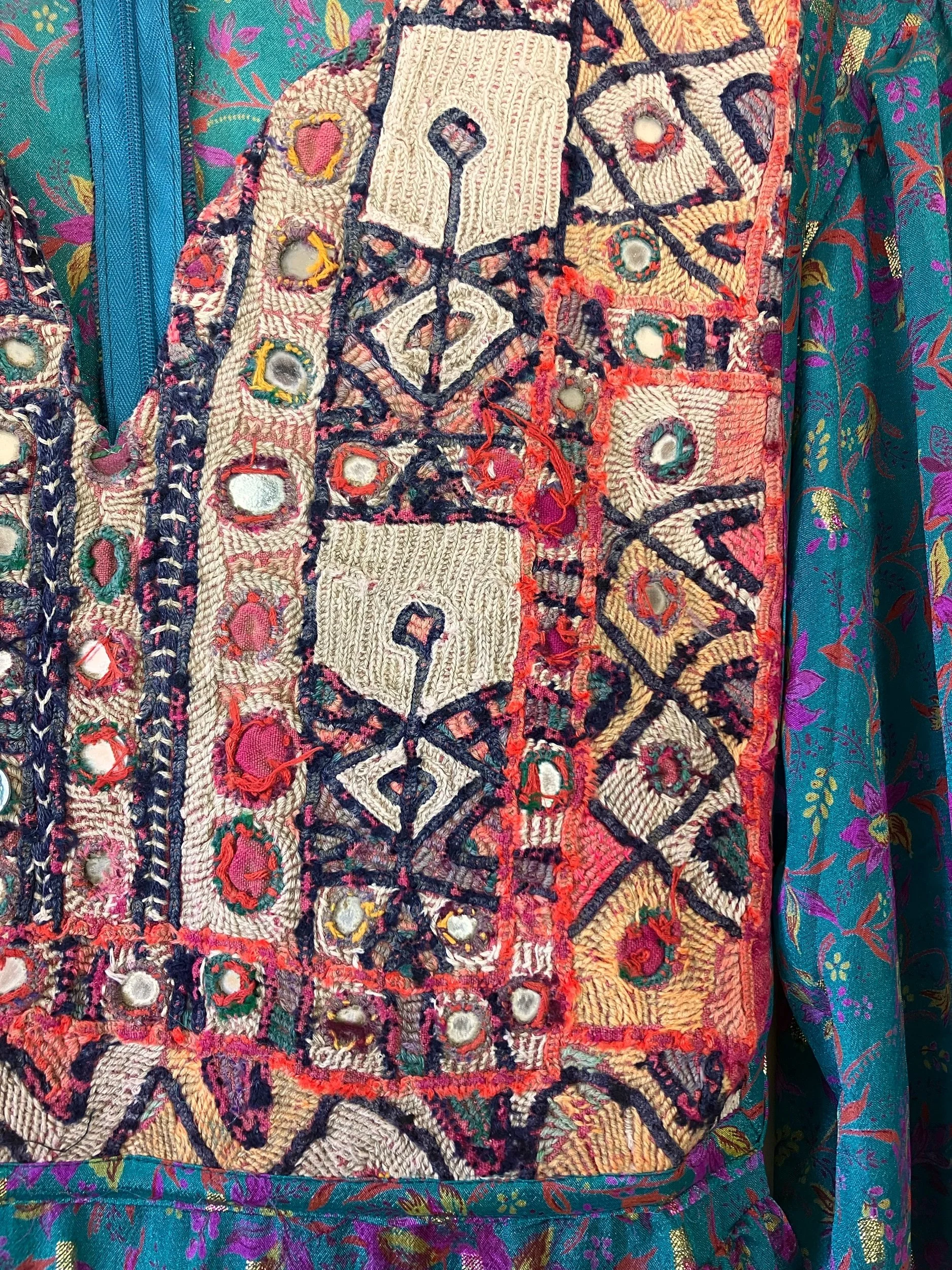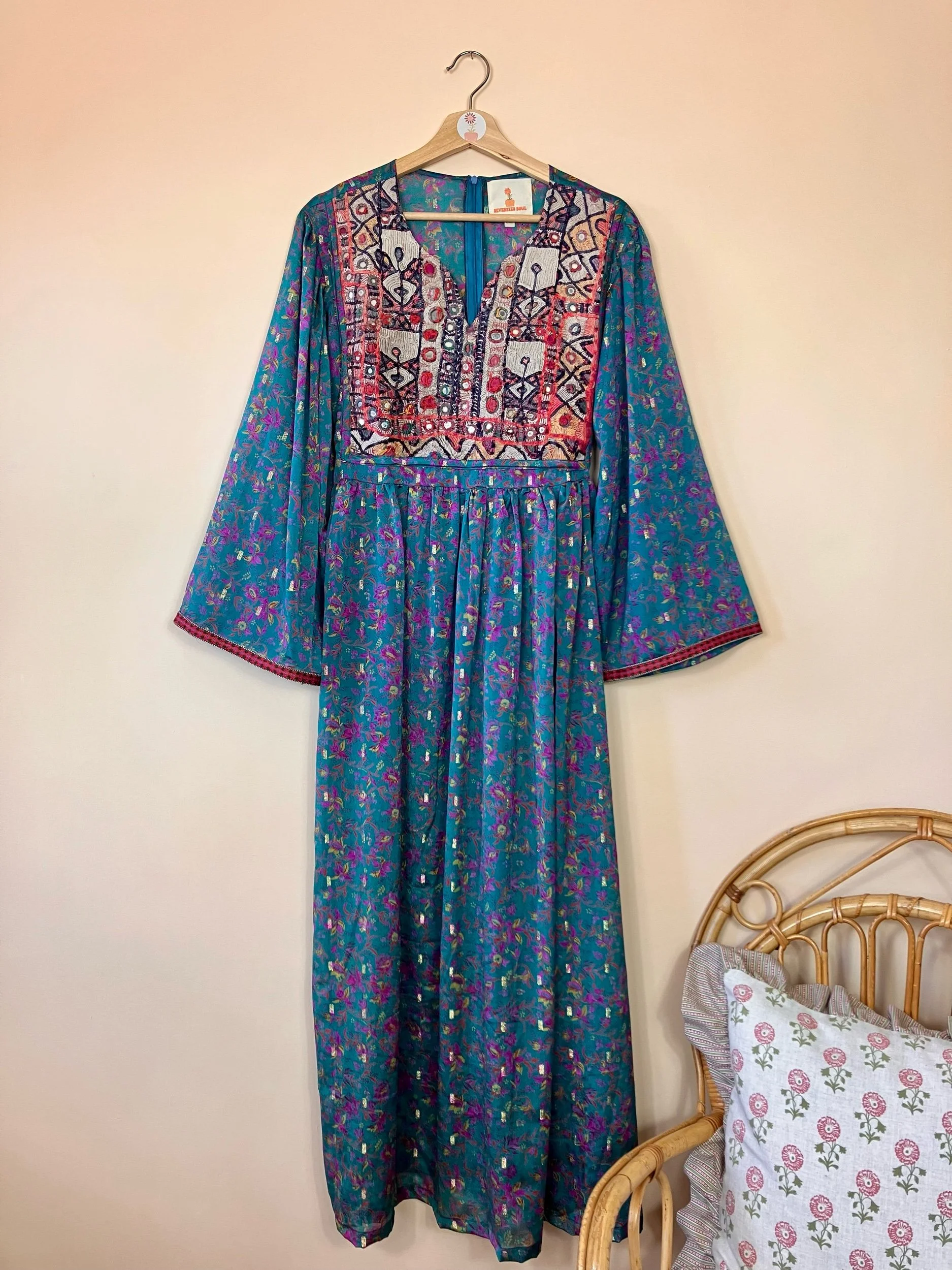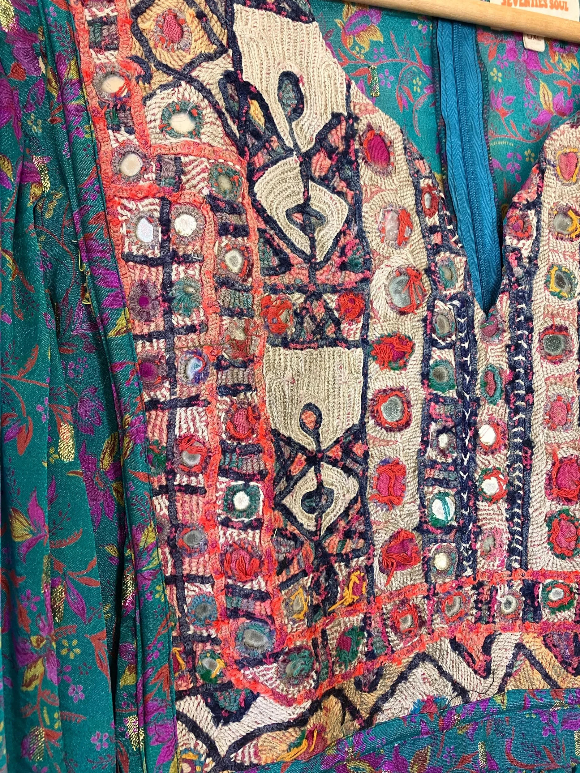 Handmade with 100% recycled and pre-loved saree silk. One of a kind dress adorned with a vintage embroidered bib. Inspired by traditional afghani dresses.