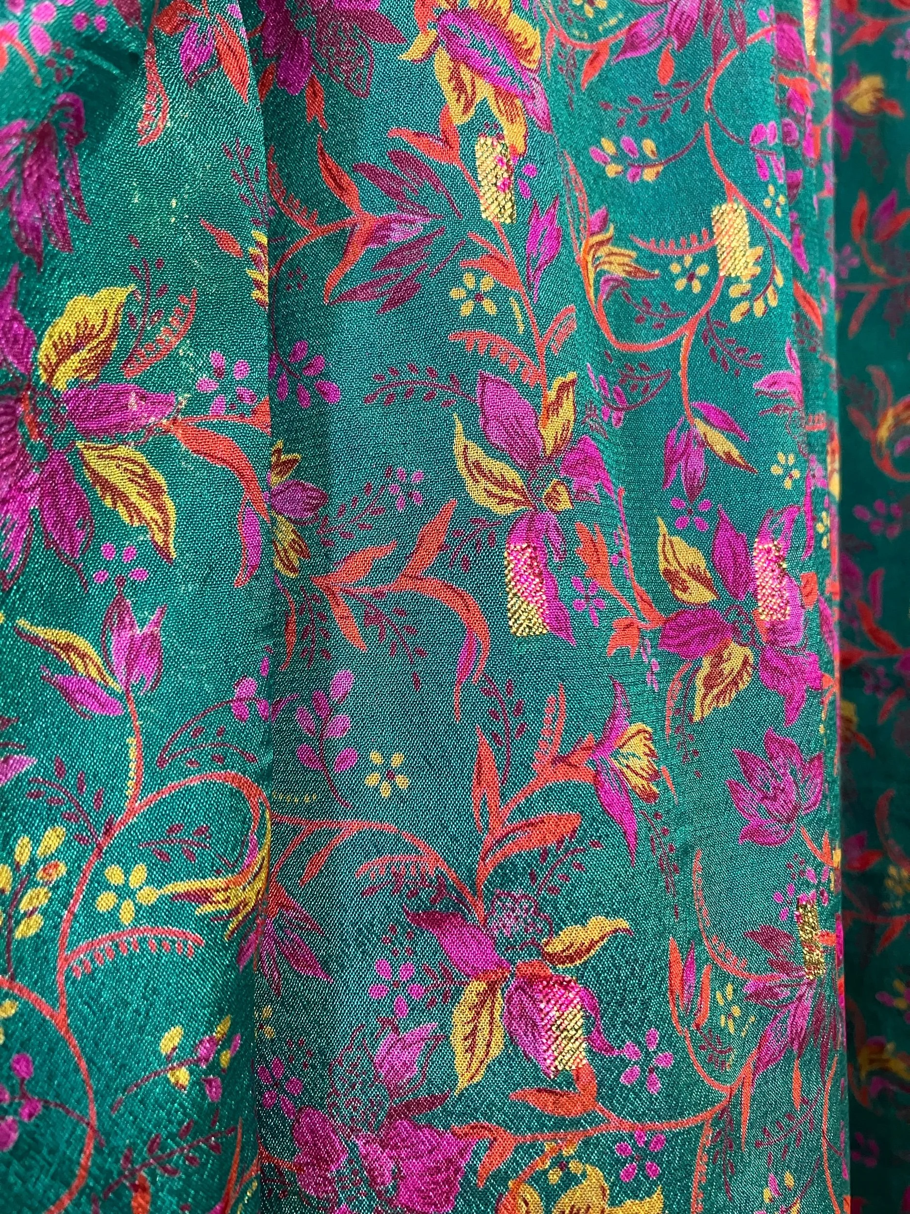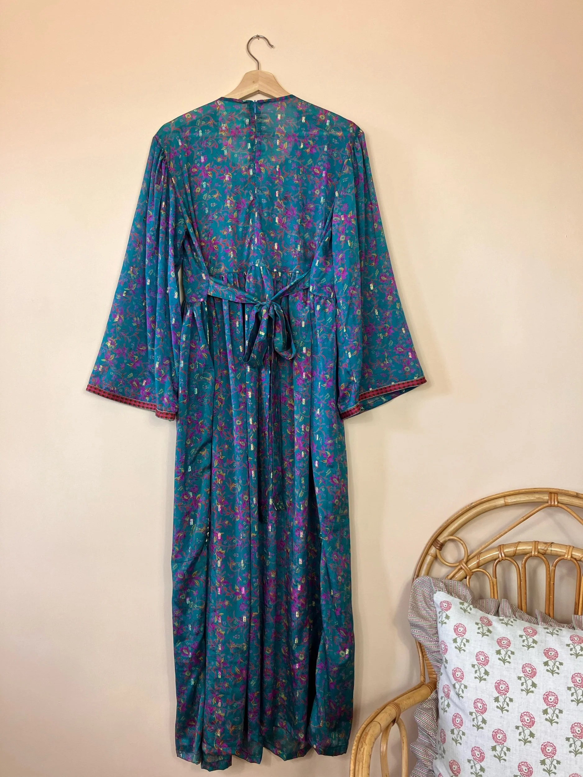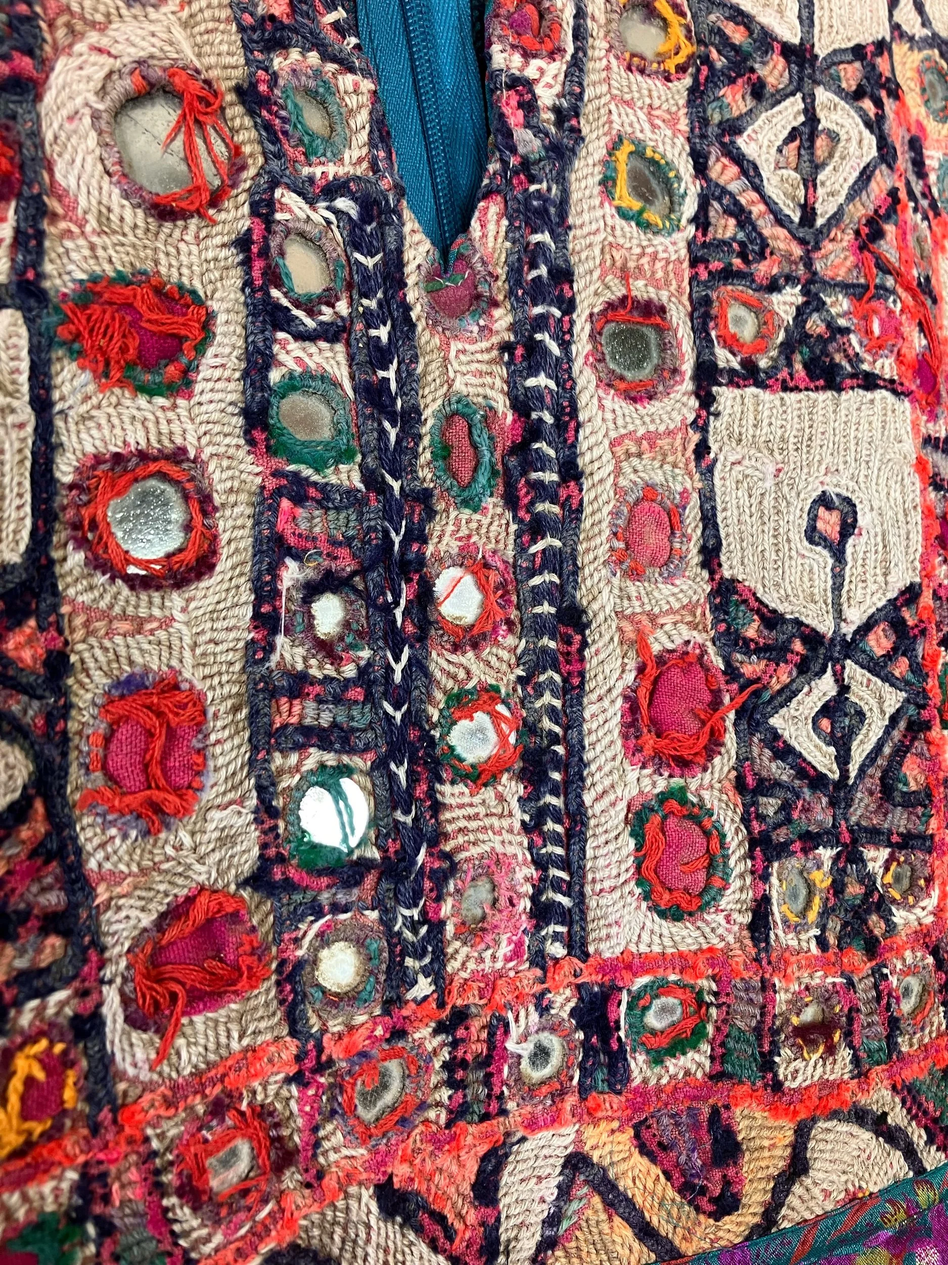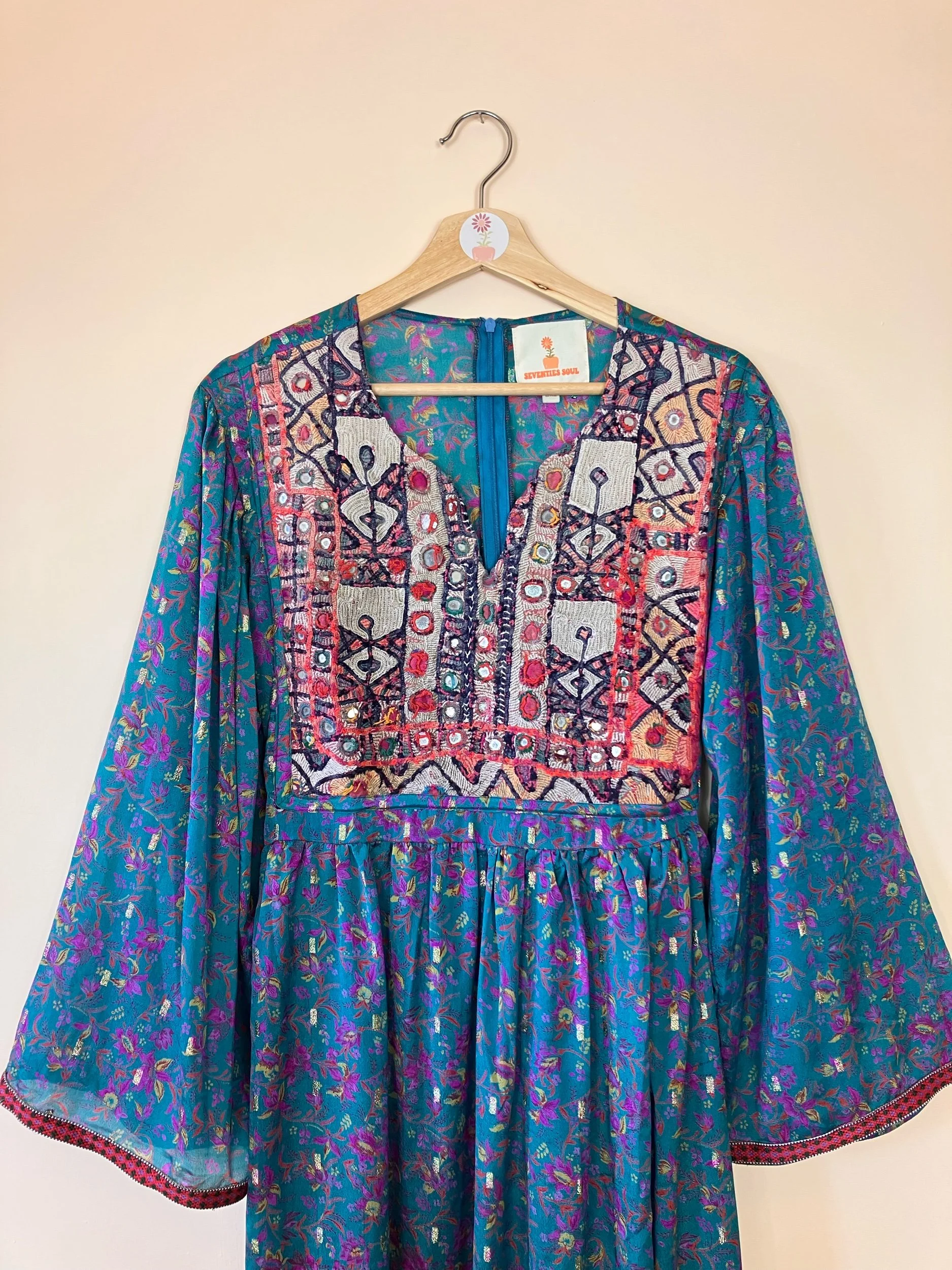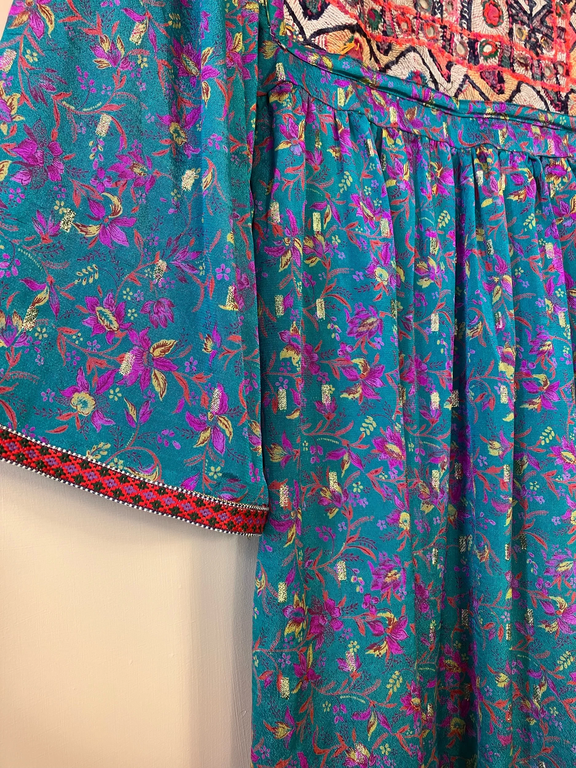 Handmade with 100% recycled and pre-loved saree silk. One of a kind dress adorned with a vintage embroidered bib. Inspired by traditional afghani dresses.