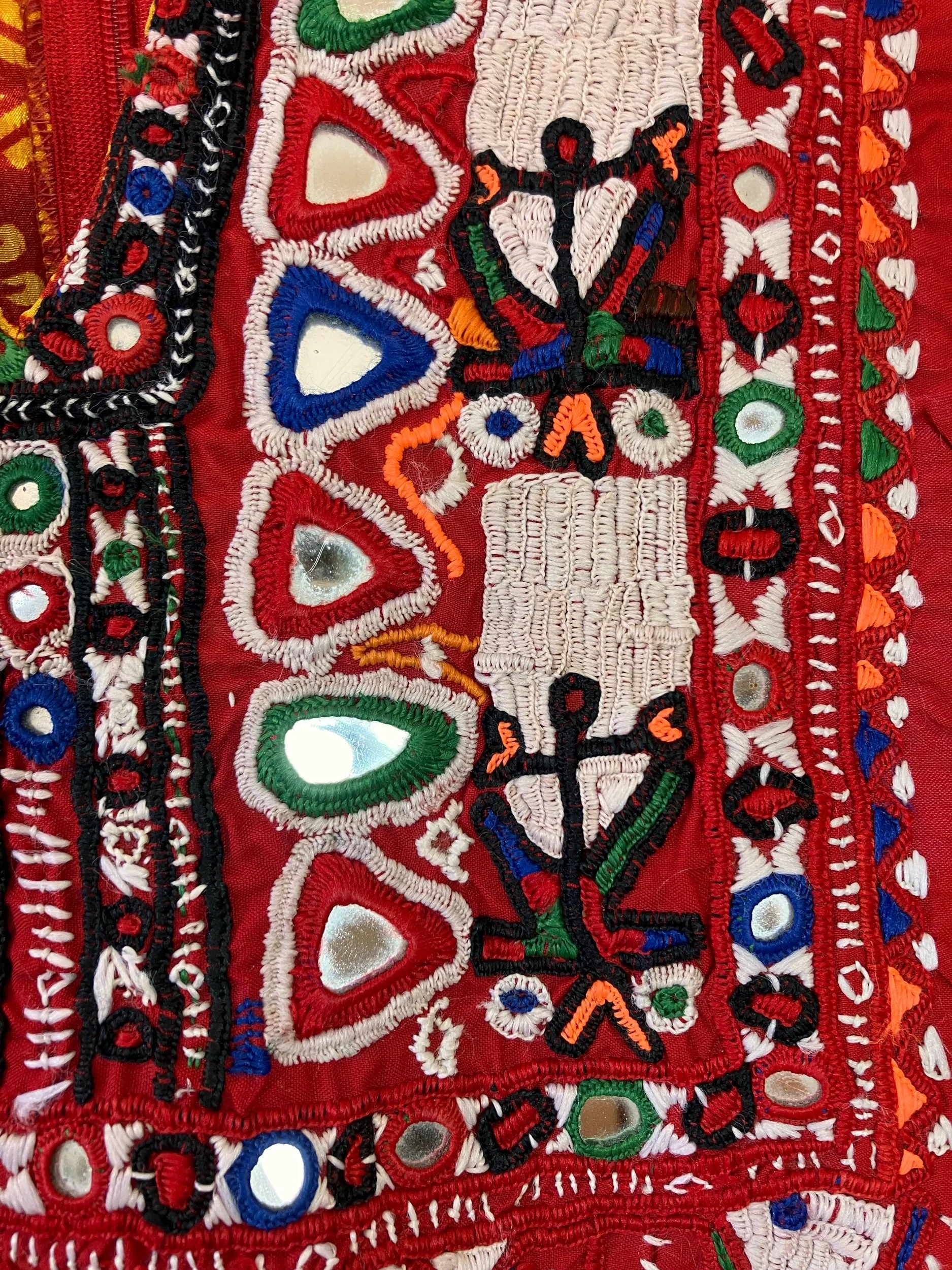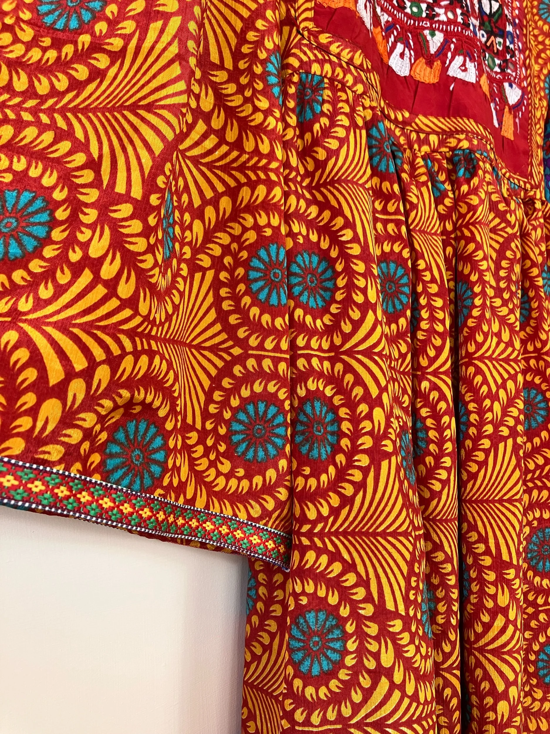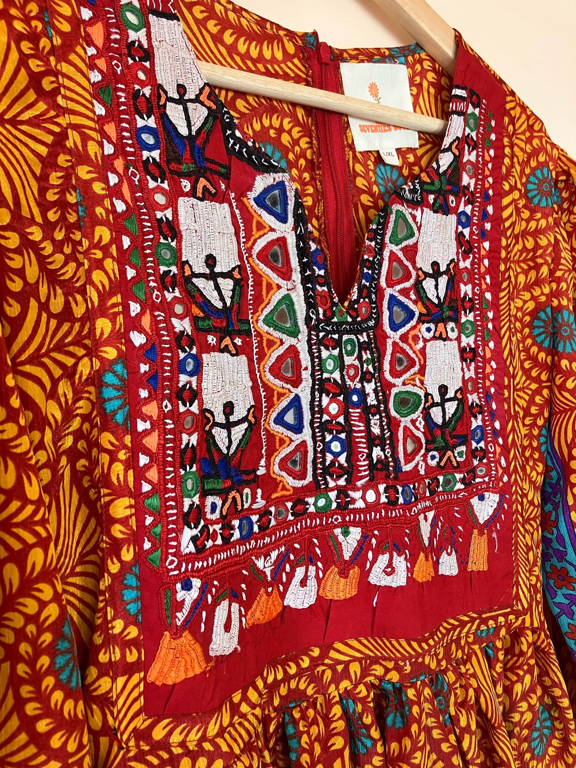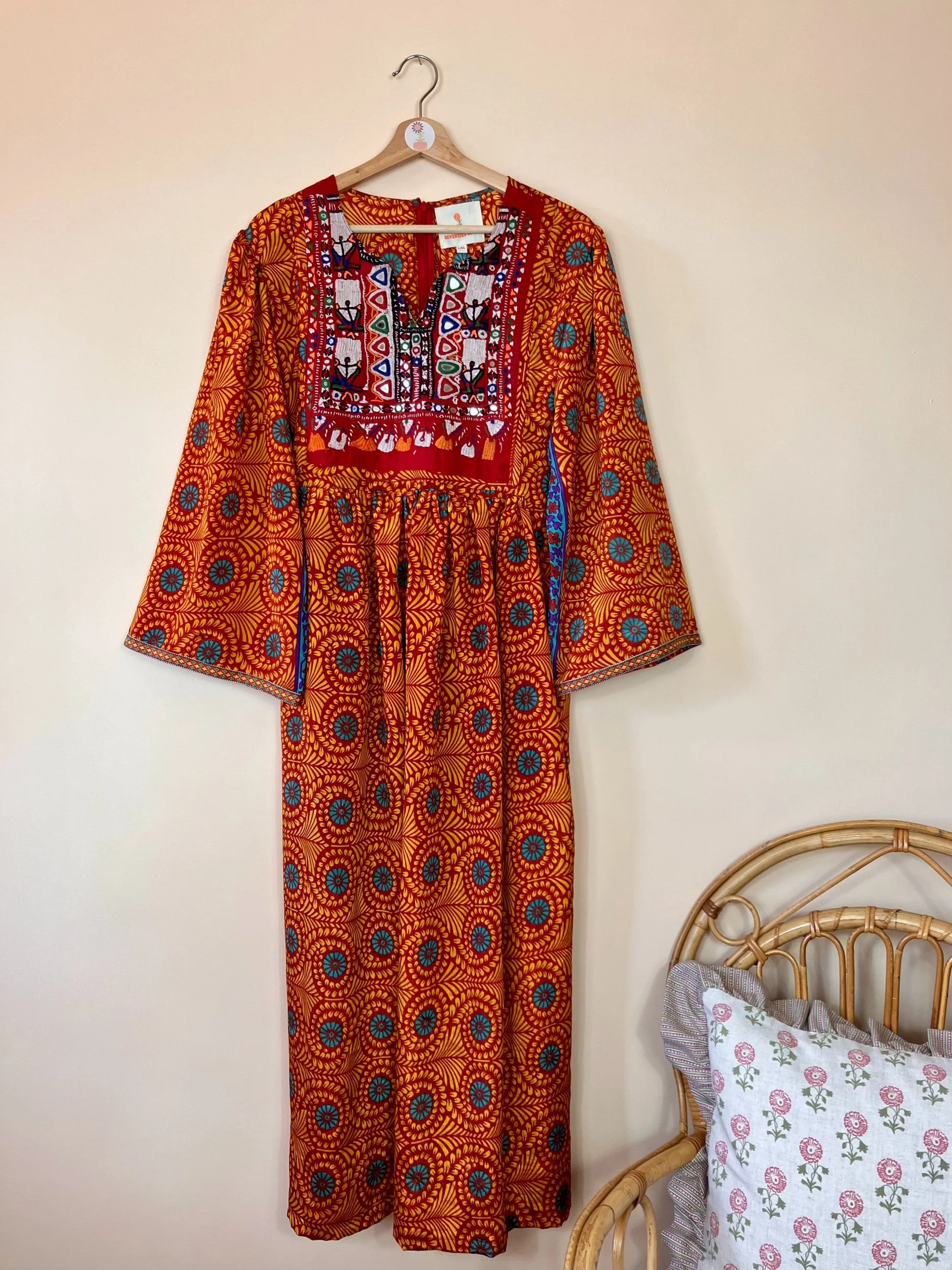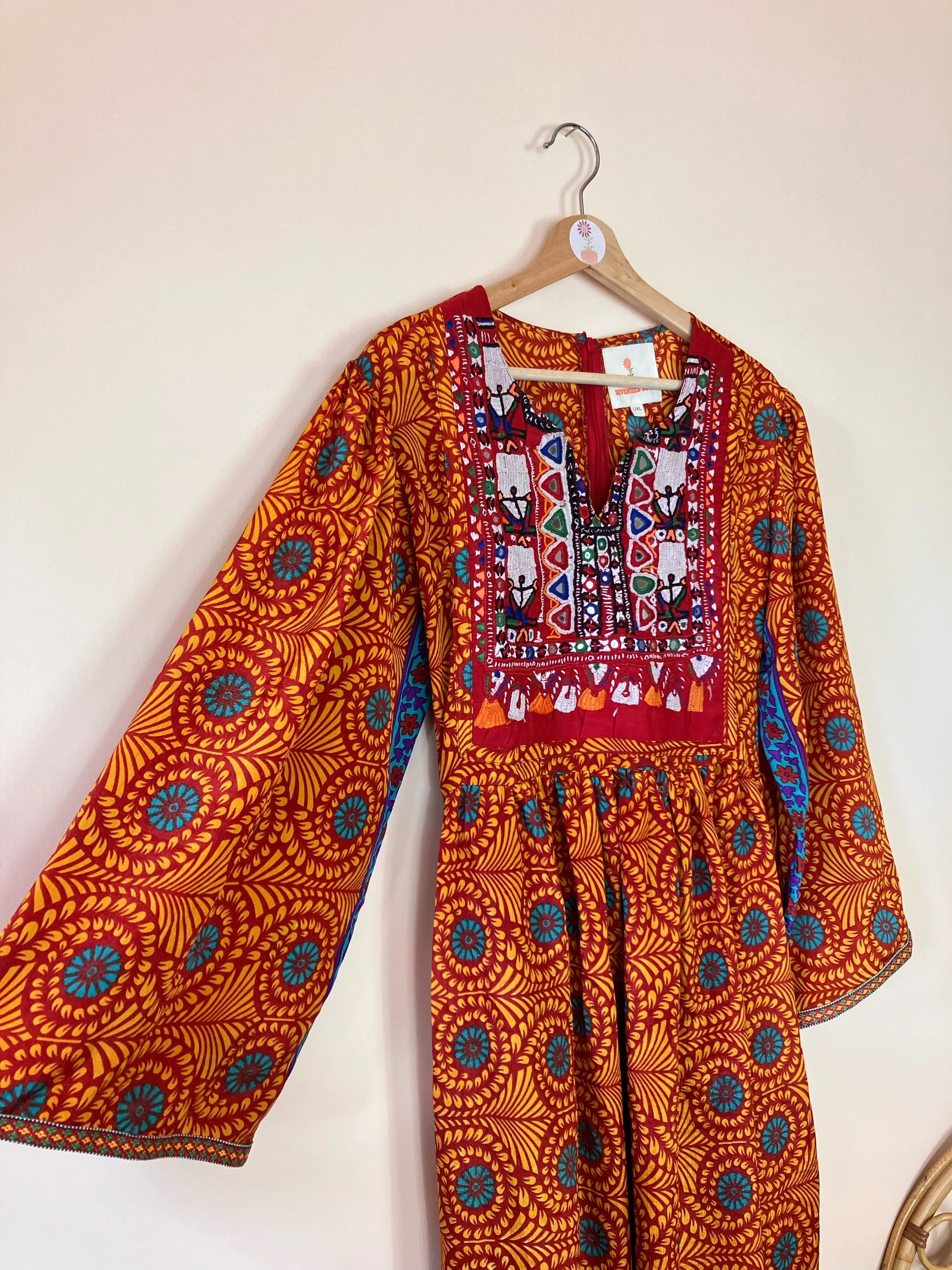 Handmade with 100% recycled and pre-loved saree materials. One of a kind dress adorned with a vintage embroidered bib. Inspired by traditional afghani dresses. Only one available.