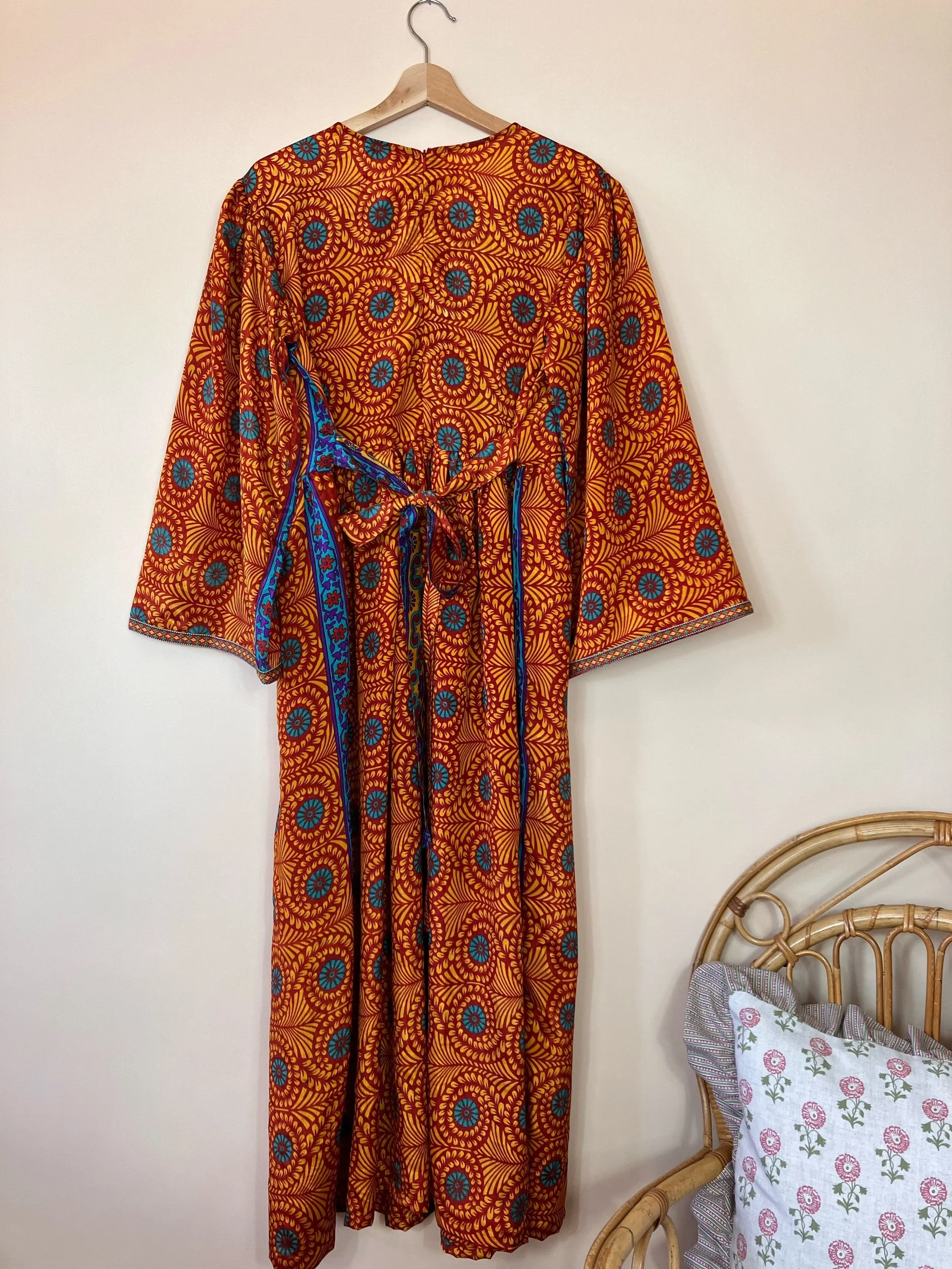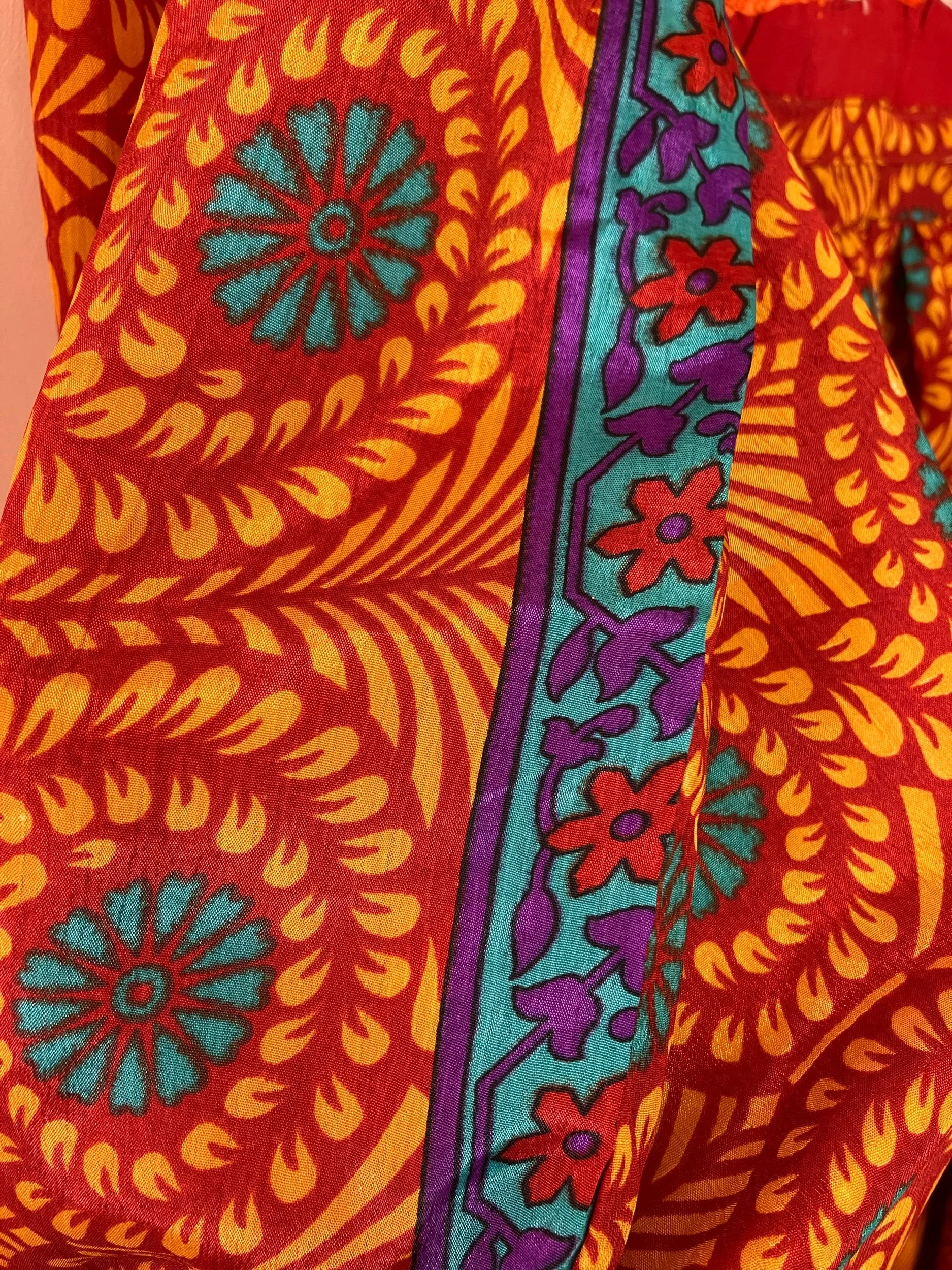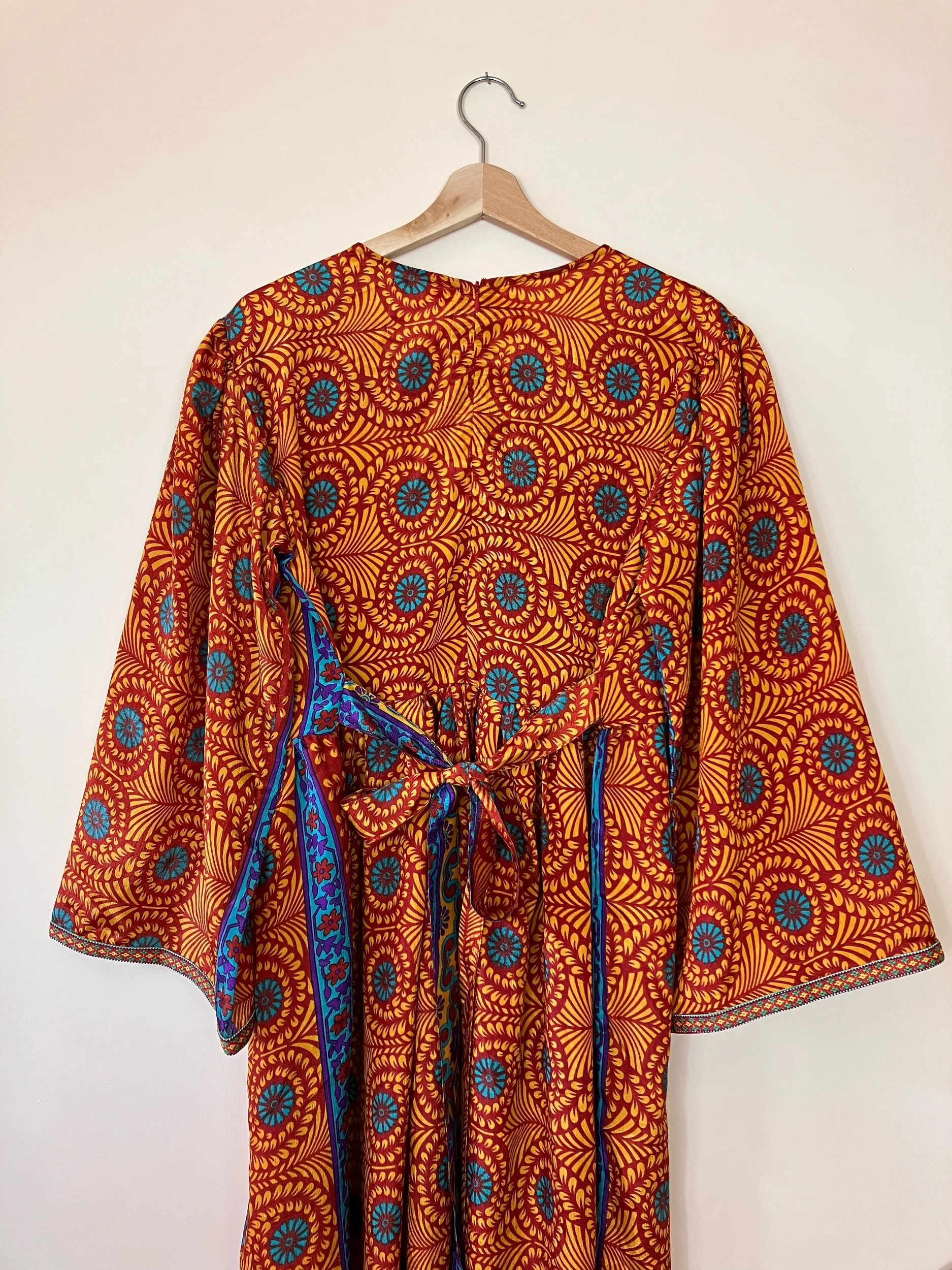 Please note: This dress has been reduced by £20 - this is becuase the pre-loved saree fabric used in this particular dress isn’t a buttery soft silk like the other dresses in this collection - it is a slightly coarser material. Due to nature of the pre-loved textiles used to make these dresses it’s possible some pieces may display small signs of wear or imperfections.