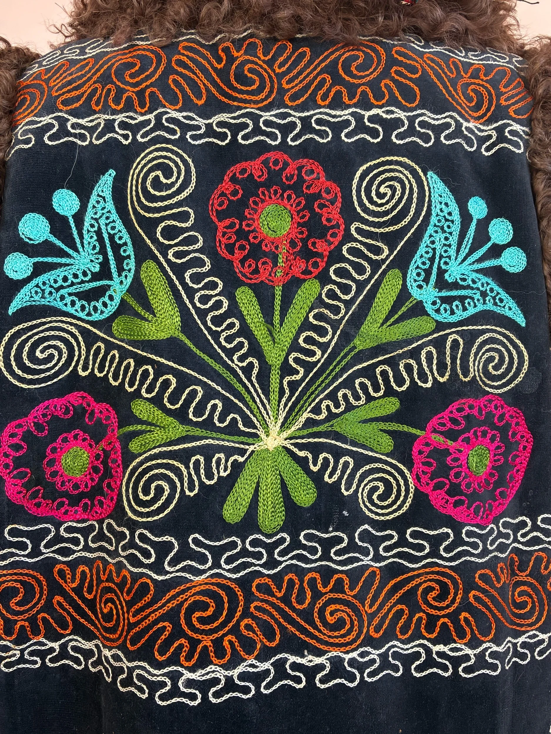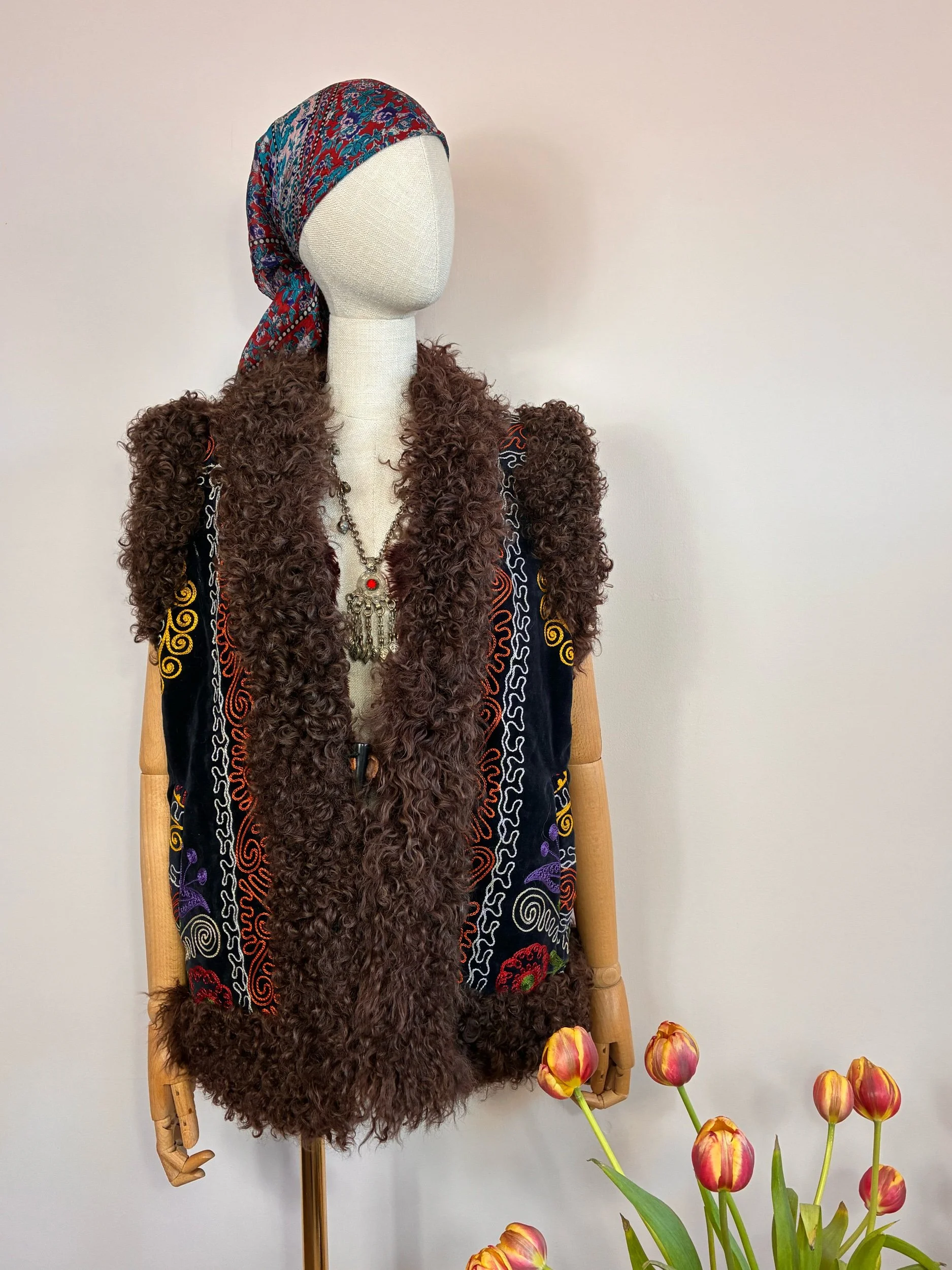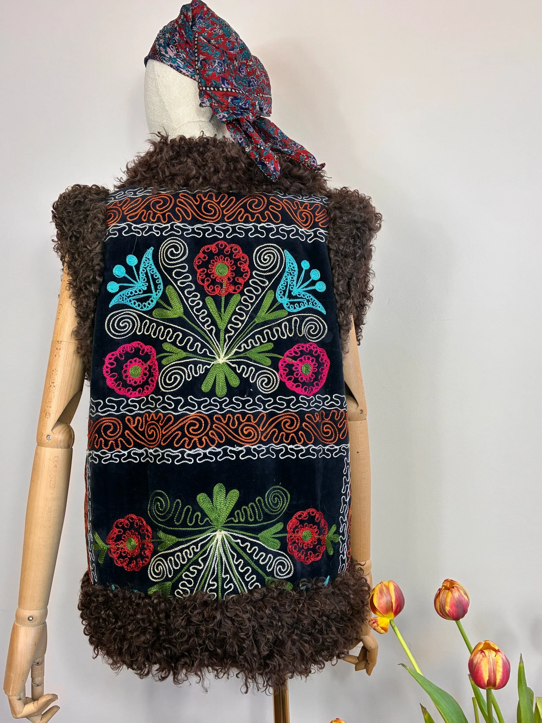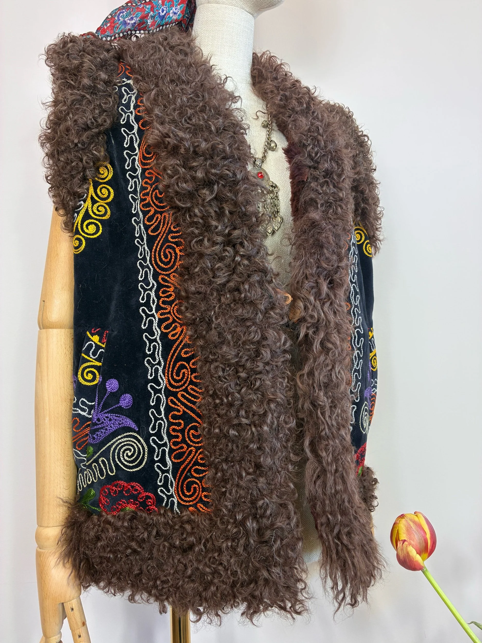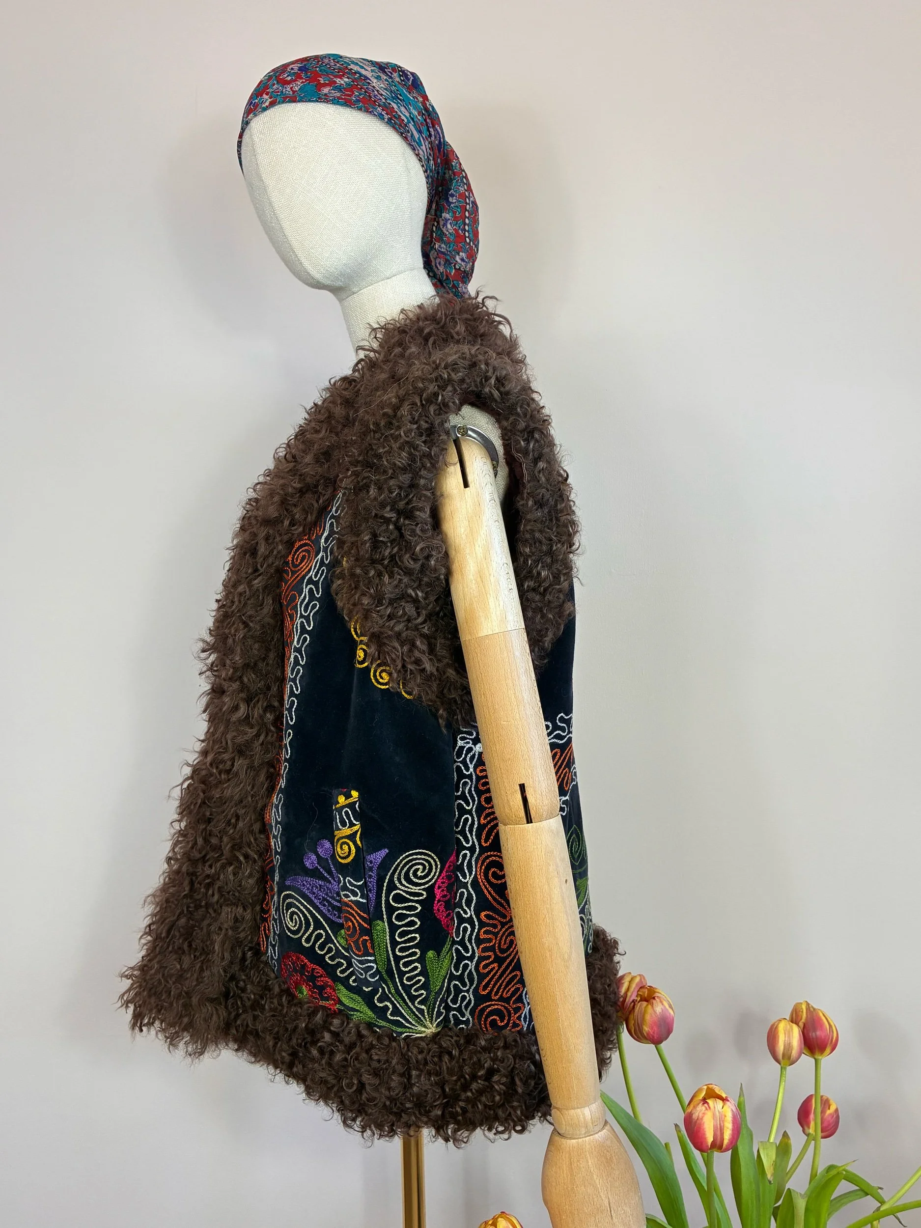 Incredible Afghan inspired coat handmade from vintage embroidered suzani fabric. Adorned with real soft brown curly mongolian fur collar, trim and cuffs. Lined inside for extra warmth. Two pockets, hook and eye fastenings. A one of a kind piece of wearable art. Designed to be cherished and treasured.