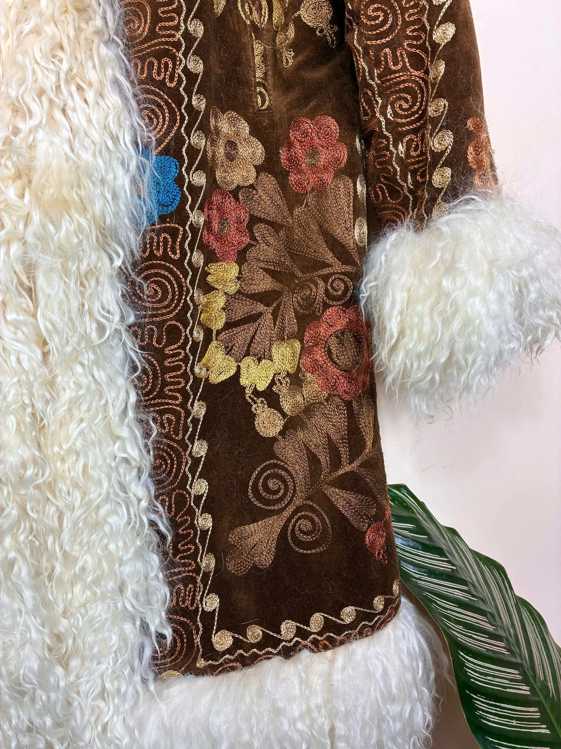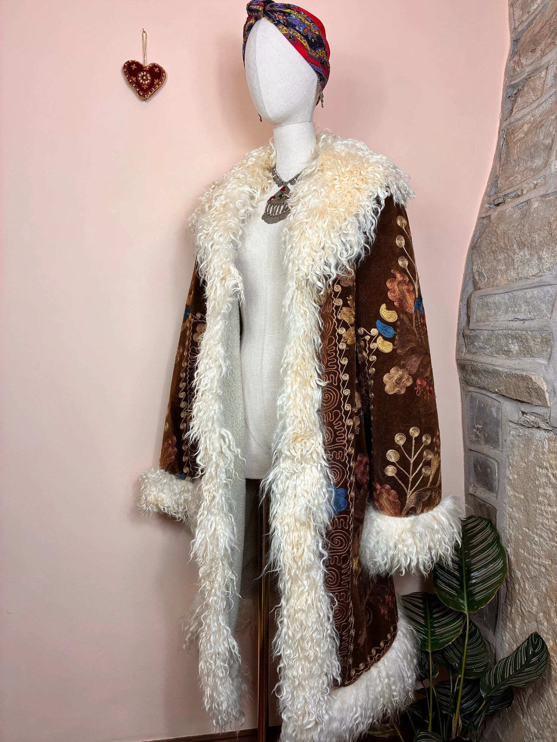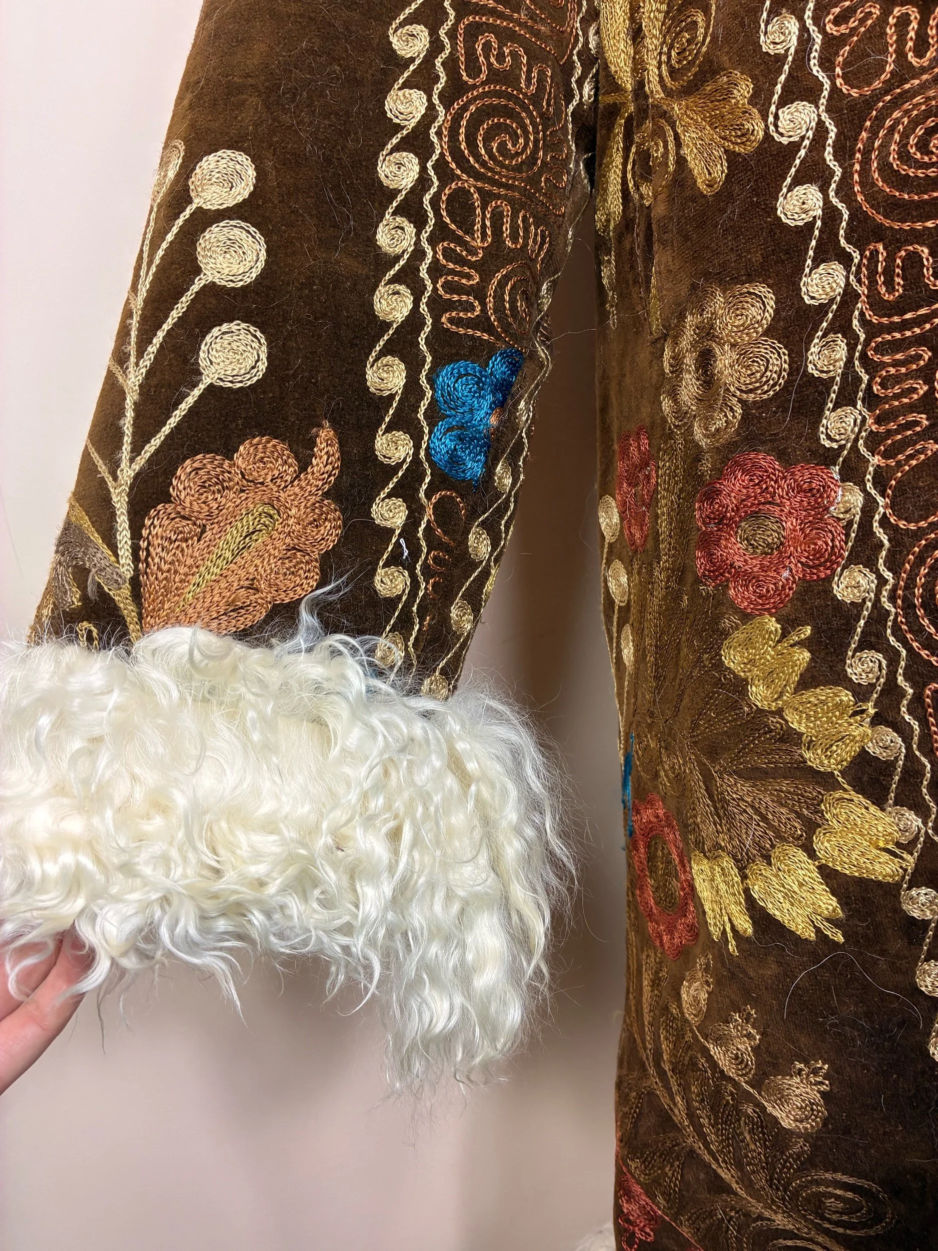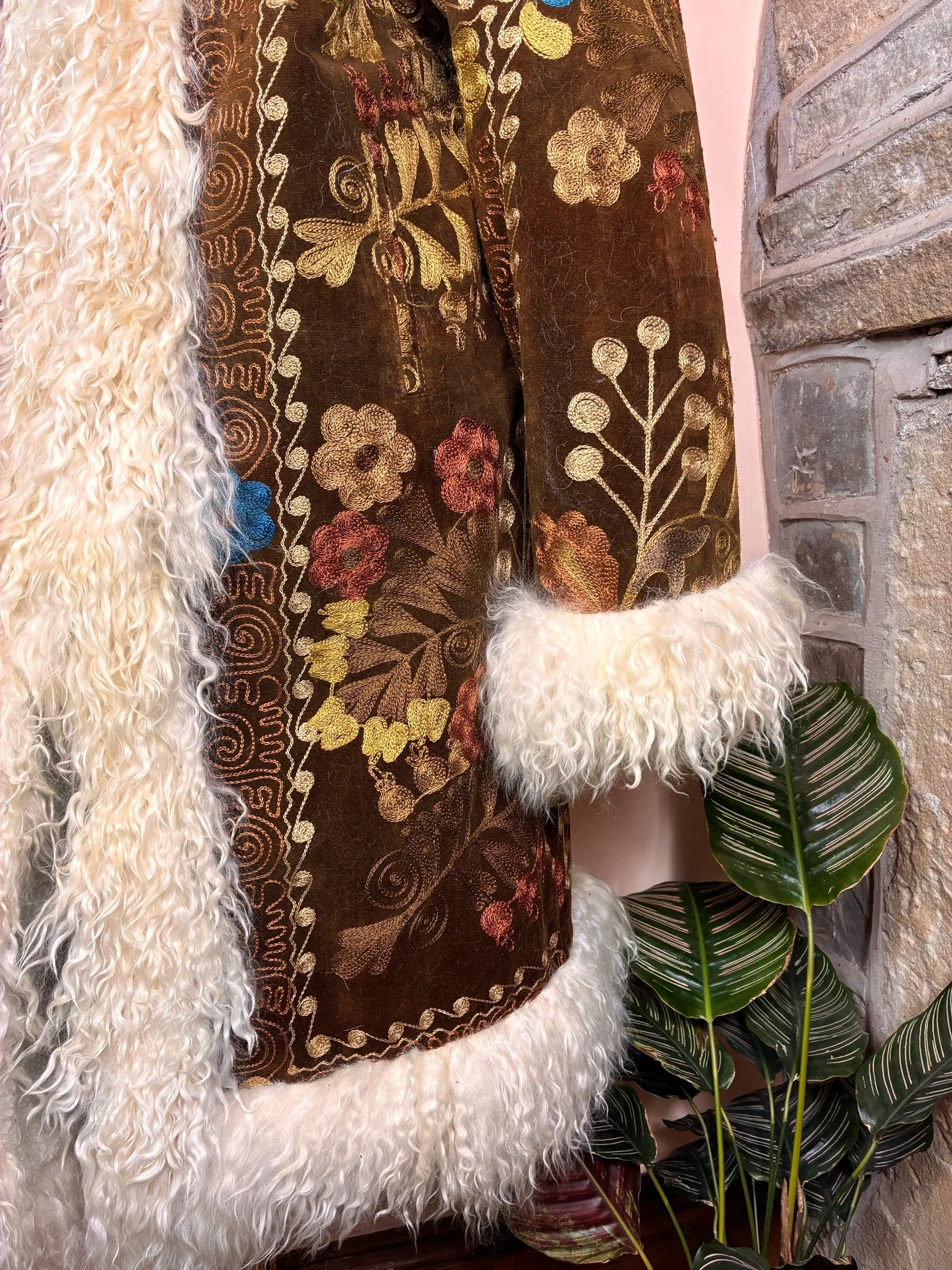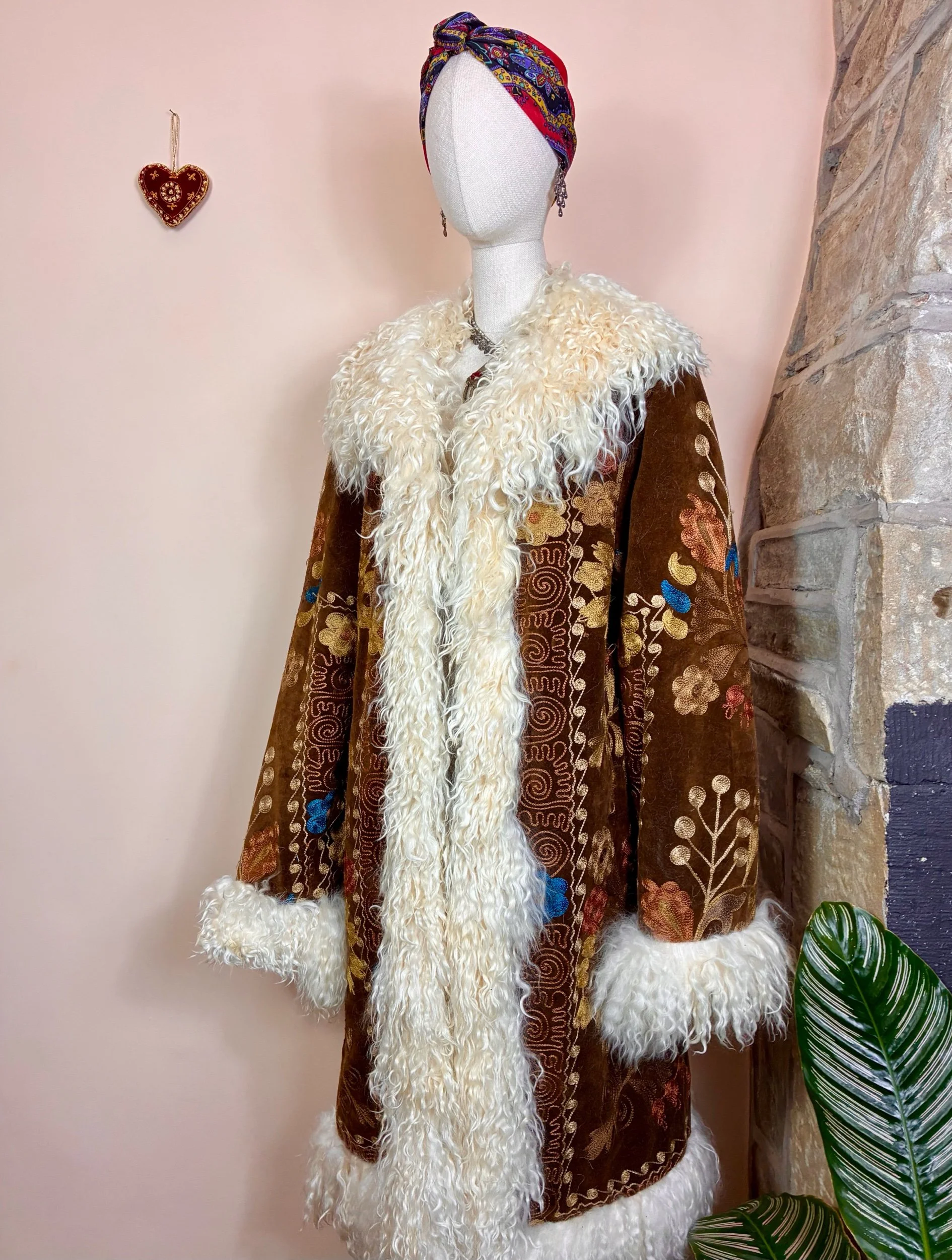 Incredible Afghan inspired coat handmade from vintage embroidered suzani fabric. Adorned with real soft curly mongolian fur collar, trim and cuffs. Lined inside for extra warmth. Two pockets, hook and eye fastenings. A piece of wearable art. Designed to be cherished and treasured.
