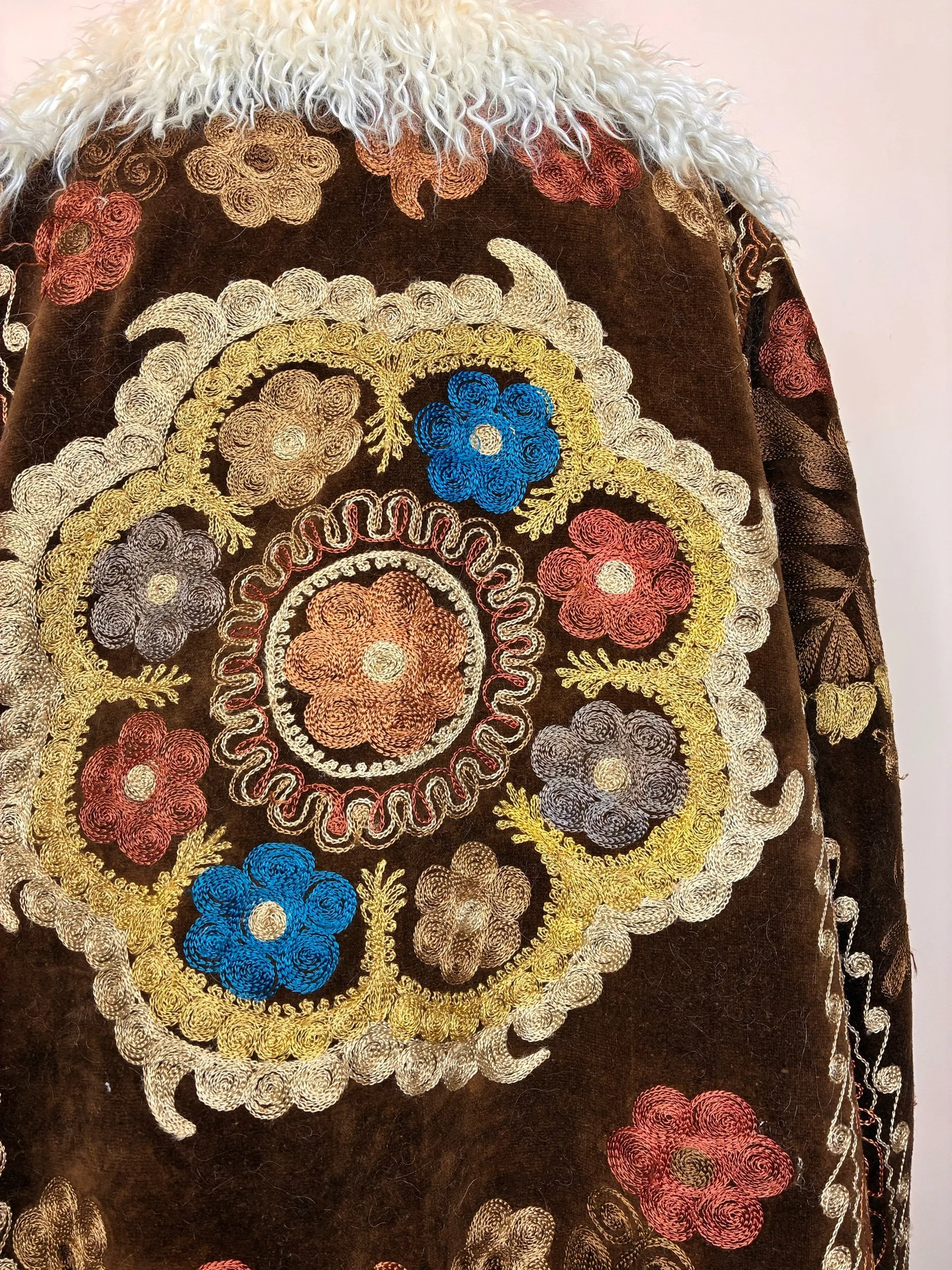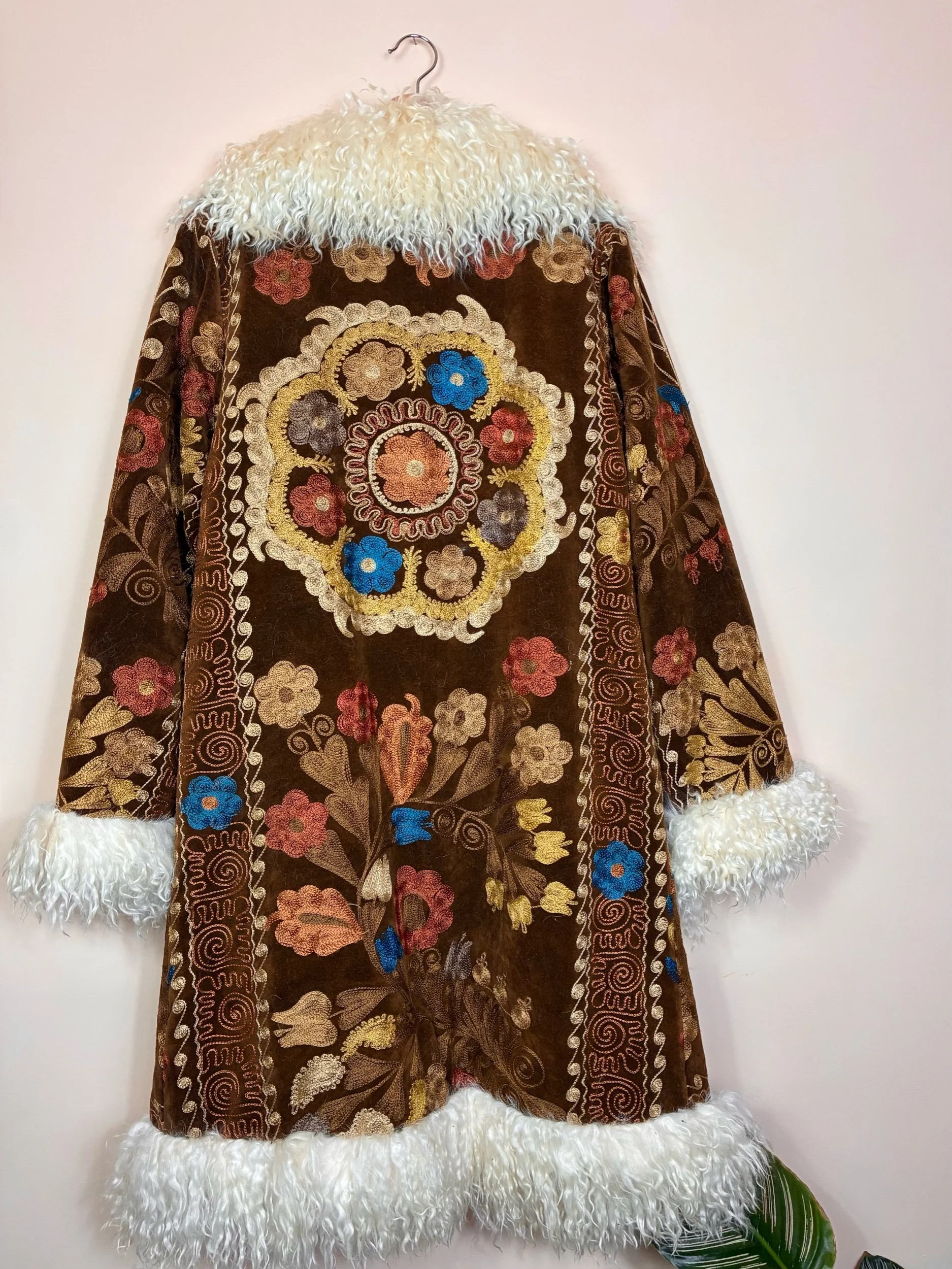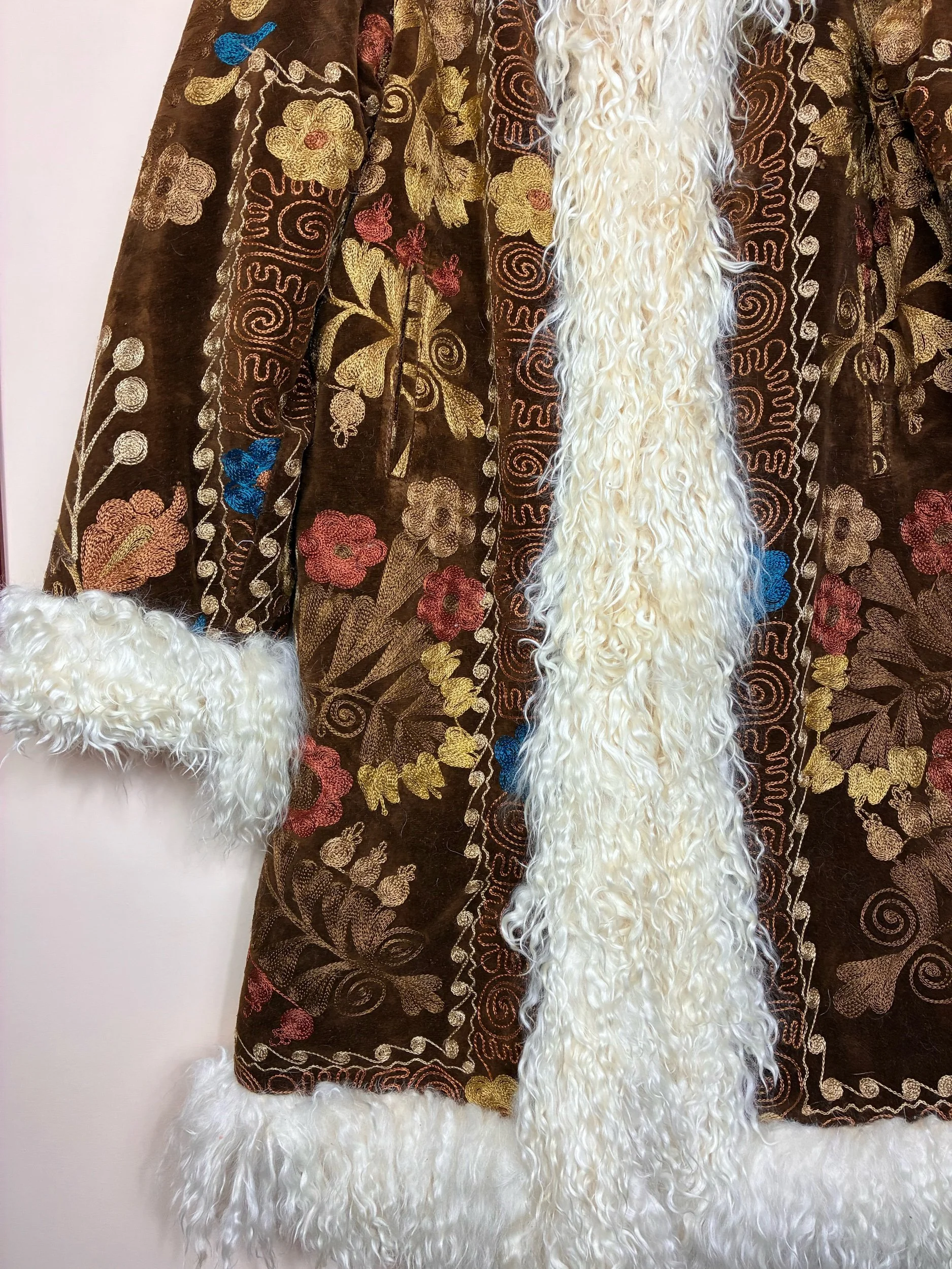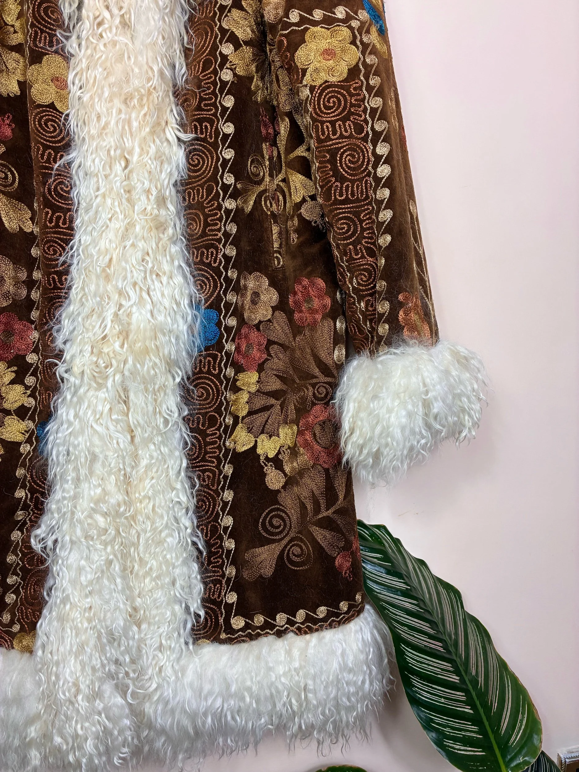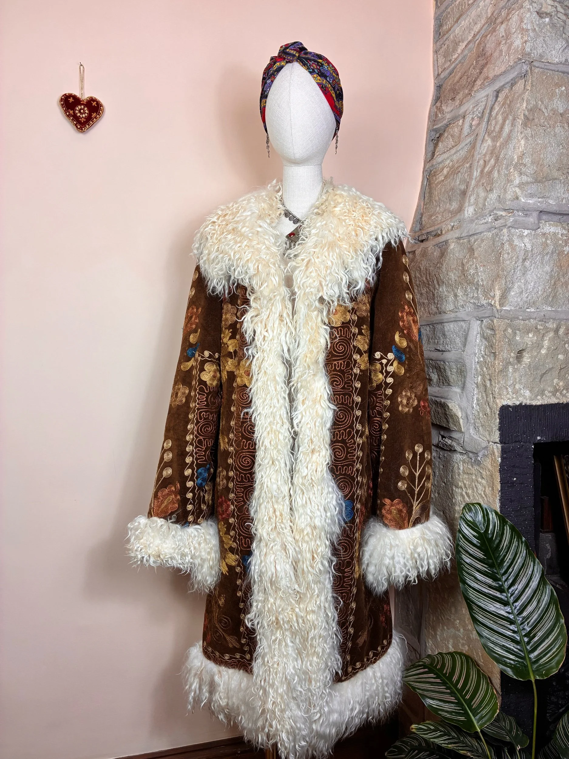 Incredible Afghan inspired coat handmade from vintage embroidered suzani fabric. Adorned with real soft curly mongolian fur collar, trim and cuffs. Lined inside for extra warmth. Two pockets, hook and eye fastenings. A piece of wearable art. Designed to be cherished and treasured.