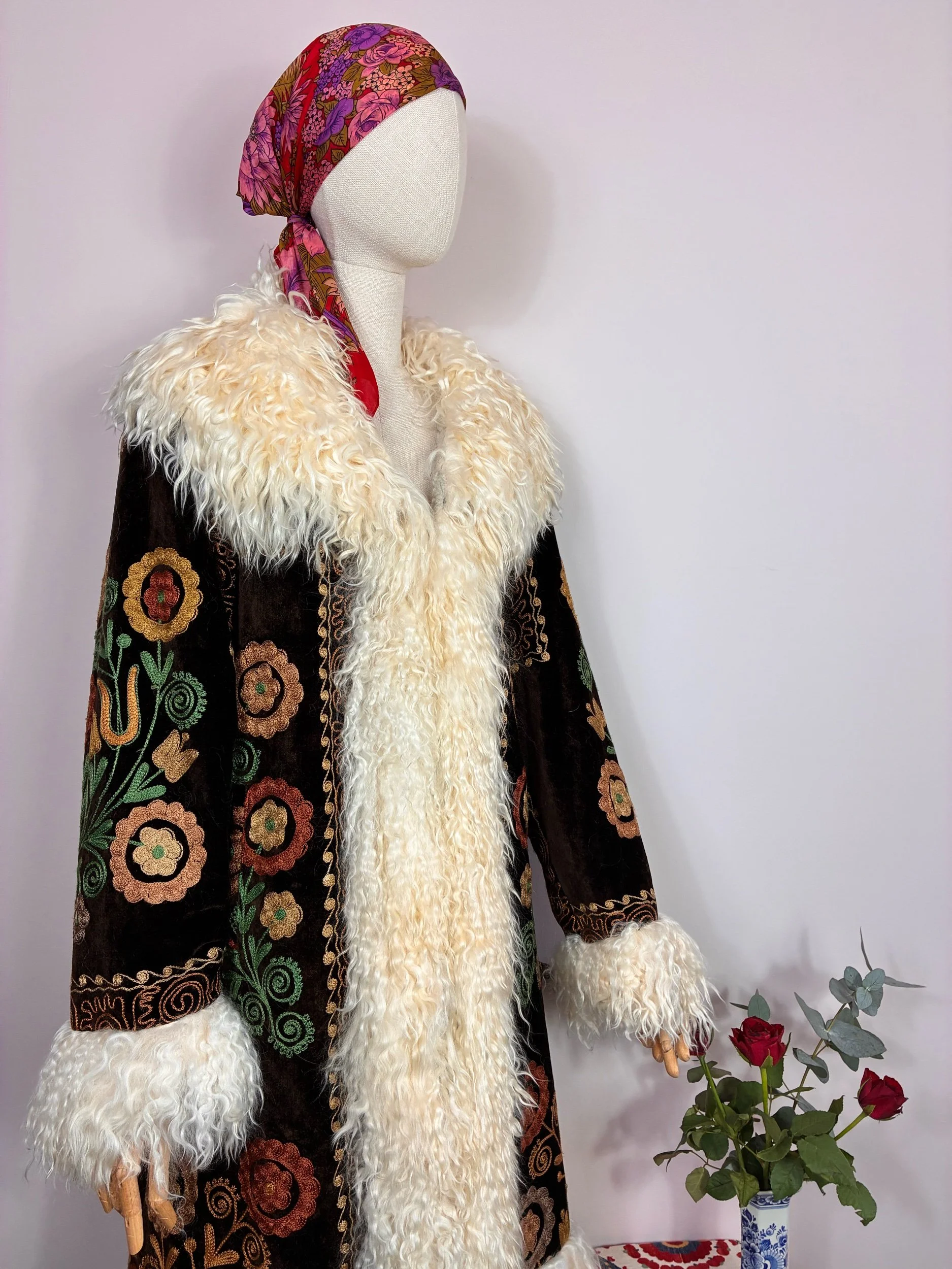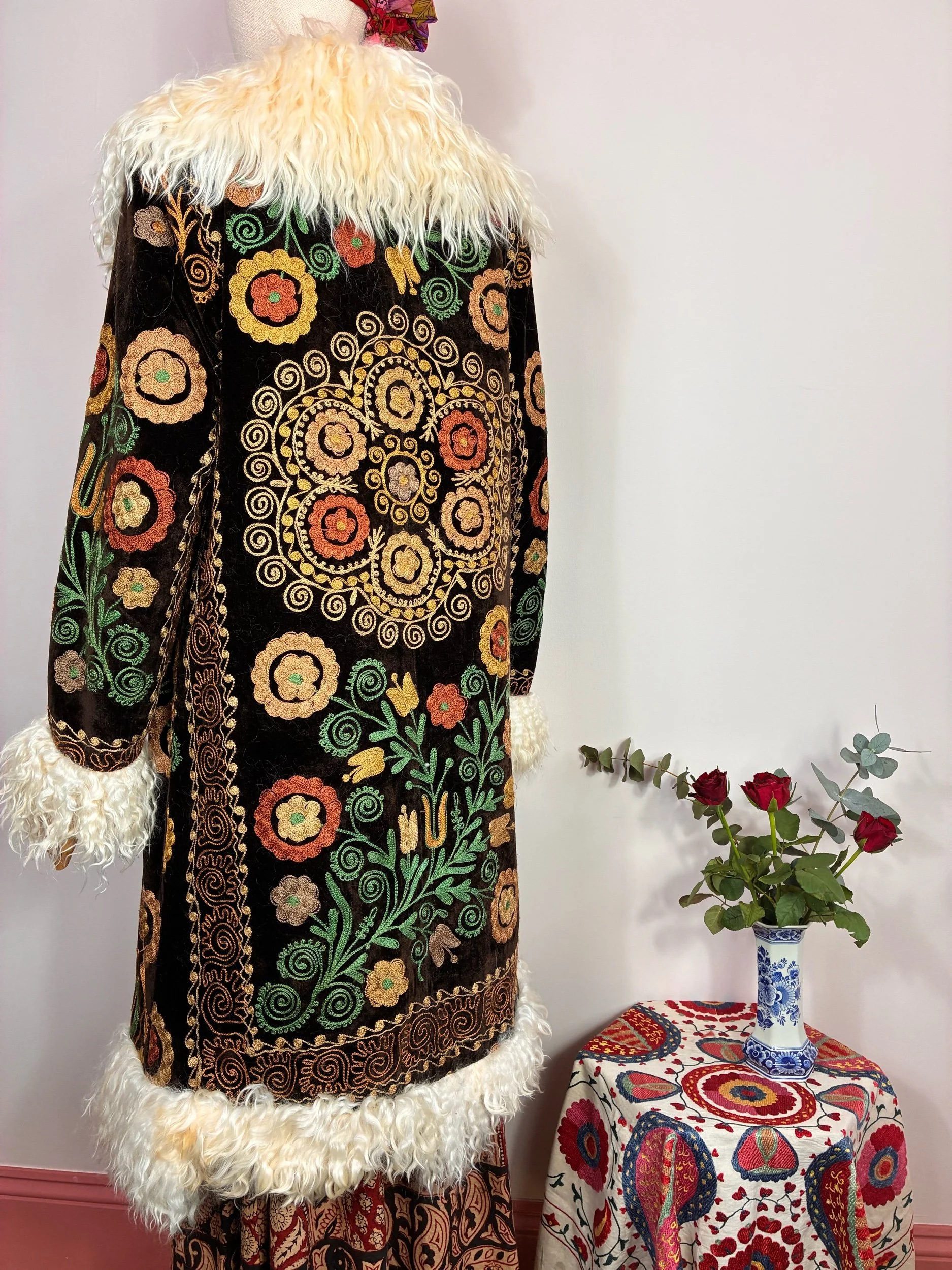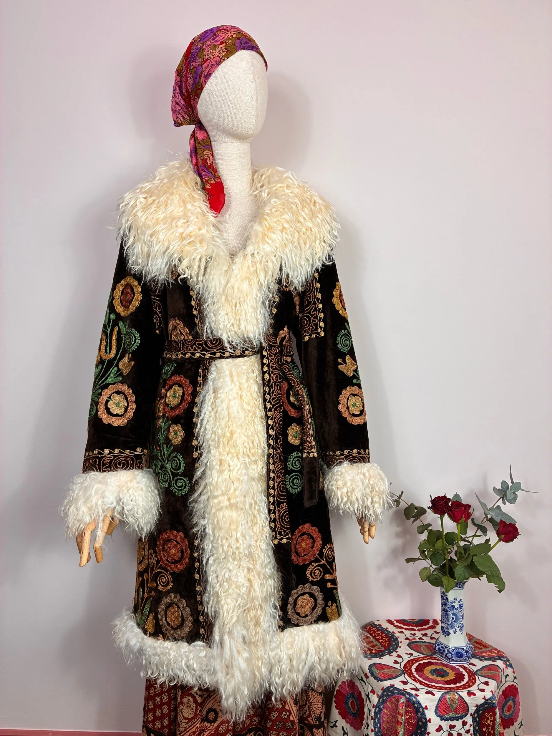Incredible Afghan inspired coat handmade from vintage velvet embroidered suzani fabric. Adorned with real soft curly mongolian fur collar, trim and cuffs. Lightghtweight, lining inside. Two pockets, hook and eye fastenings and comes with a matching detached belt. A piece of wearable art. Designed to be cherished and treasured.