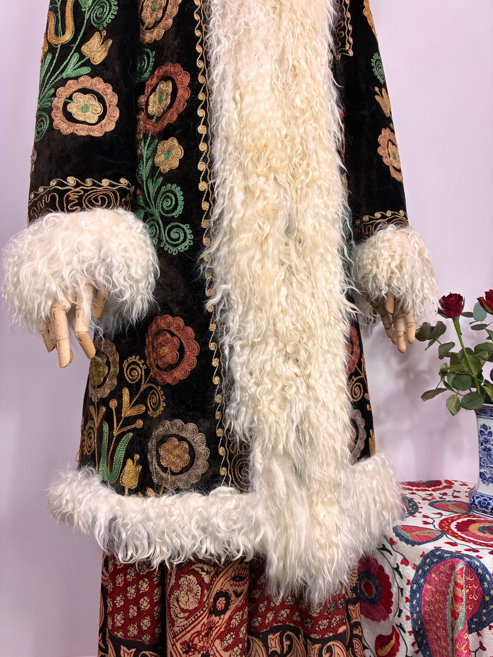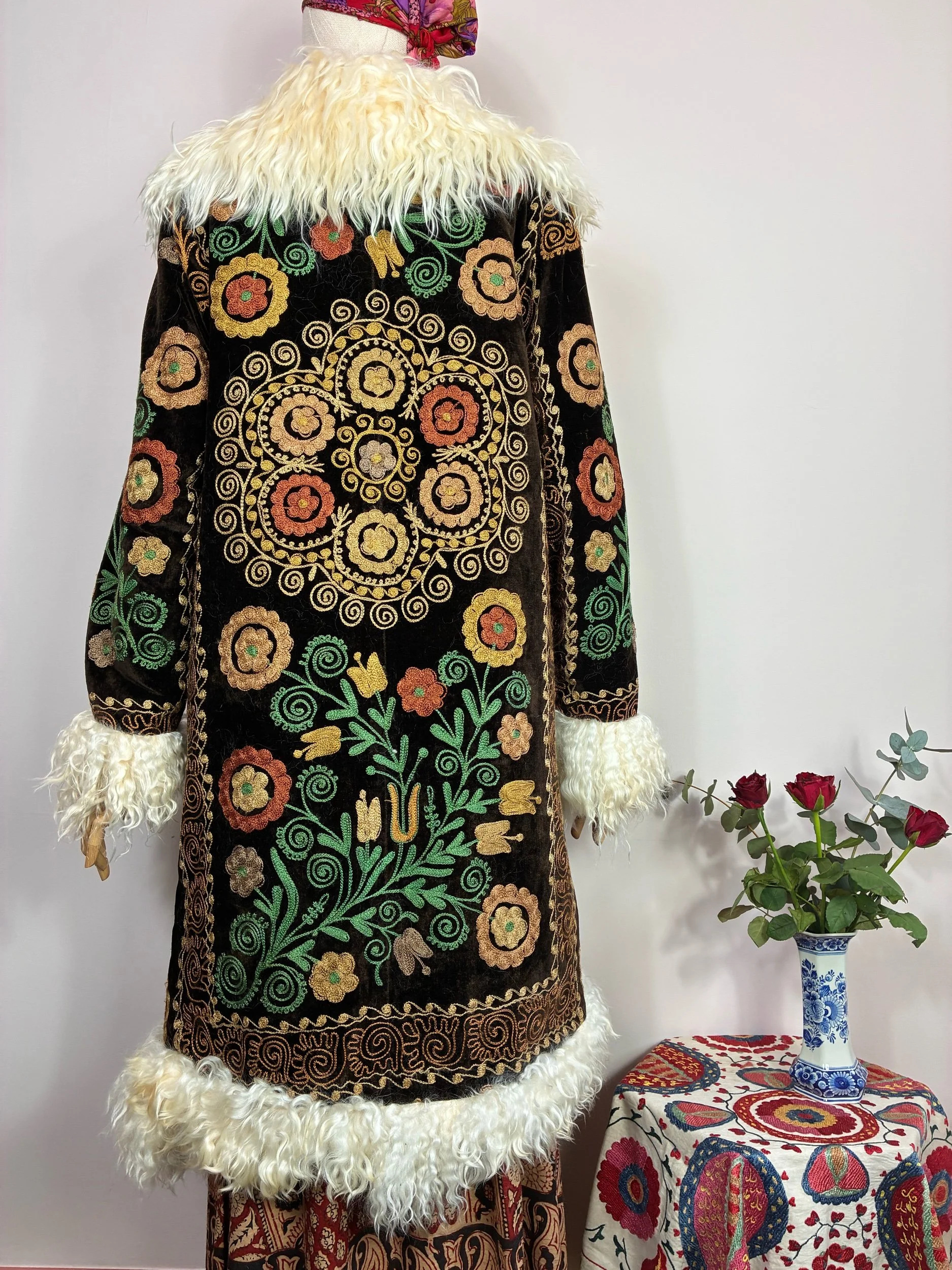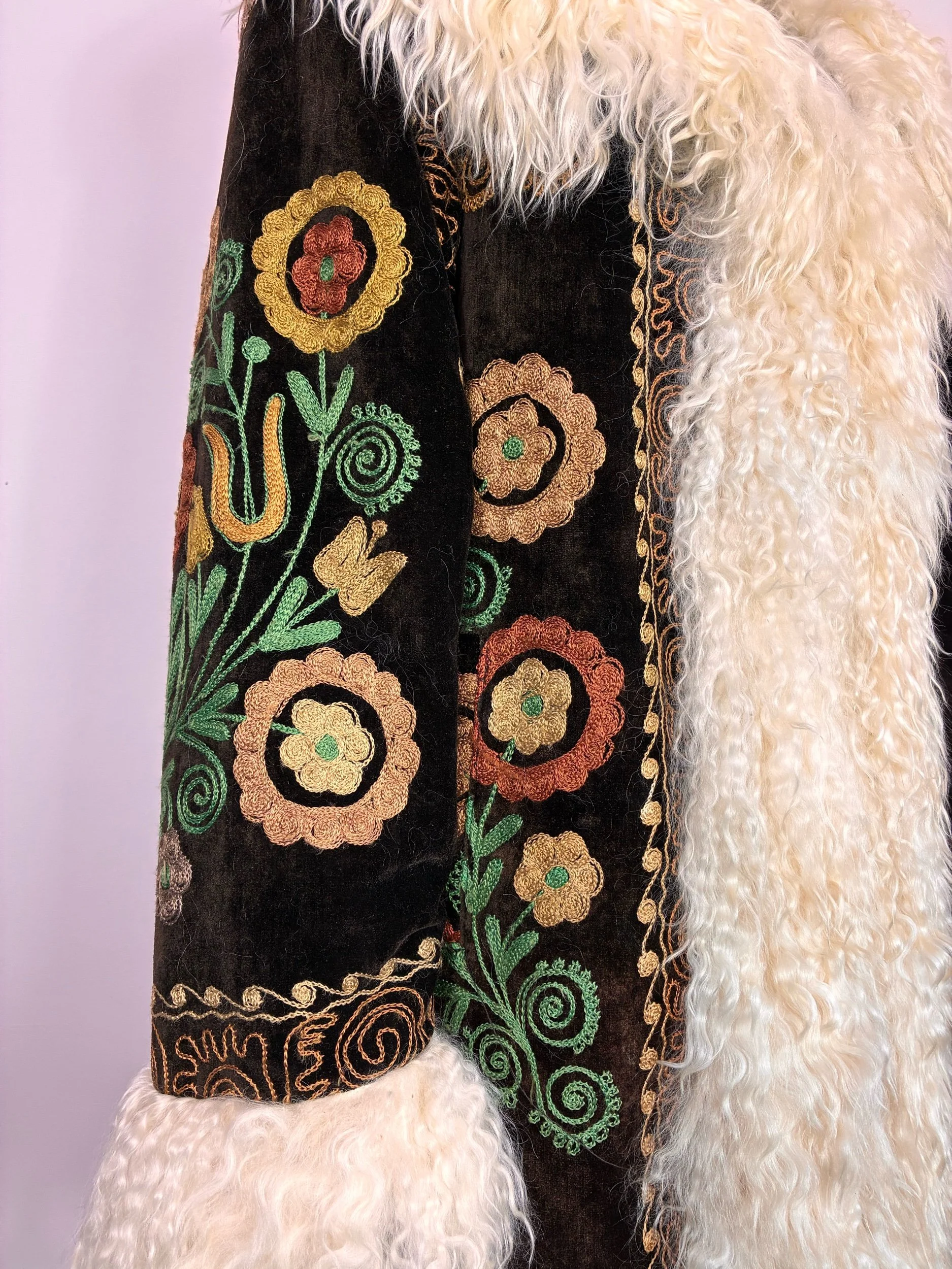Incredible Afghan inspired coat handmade from vintage velvet embroidered suzani fabric. Adorned with real soft curly mongolian fur collar, trim and cuffs. Lightghtweight, lining inside. Two pockets, hook and eye fastenings and comes with a matching detached belt. A piece of wearable art. Designed to be cherished and treasured.