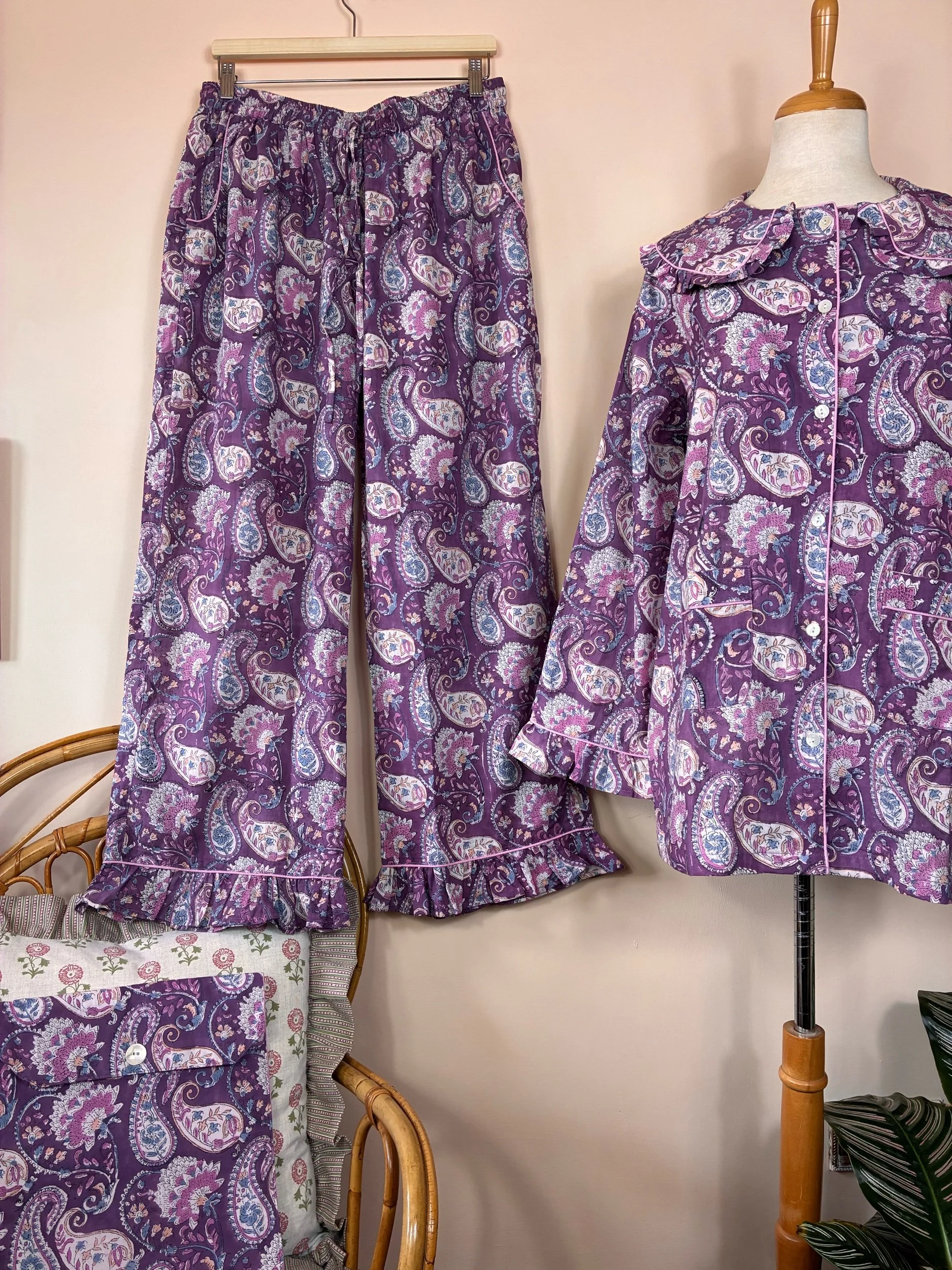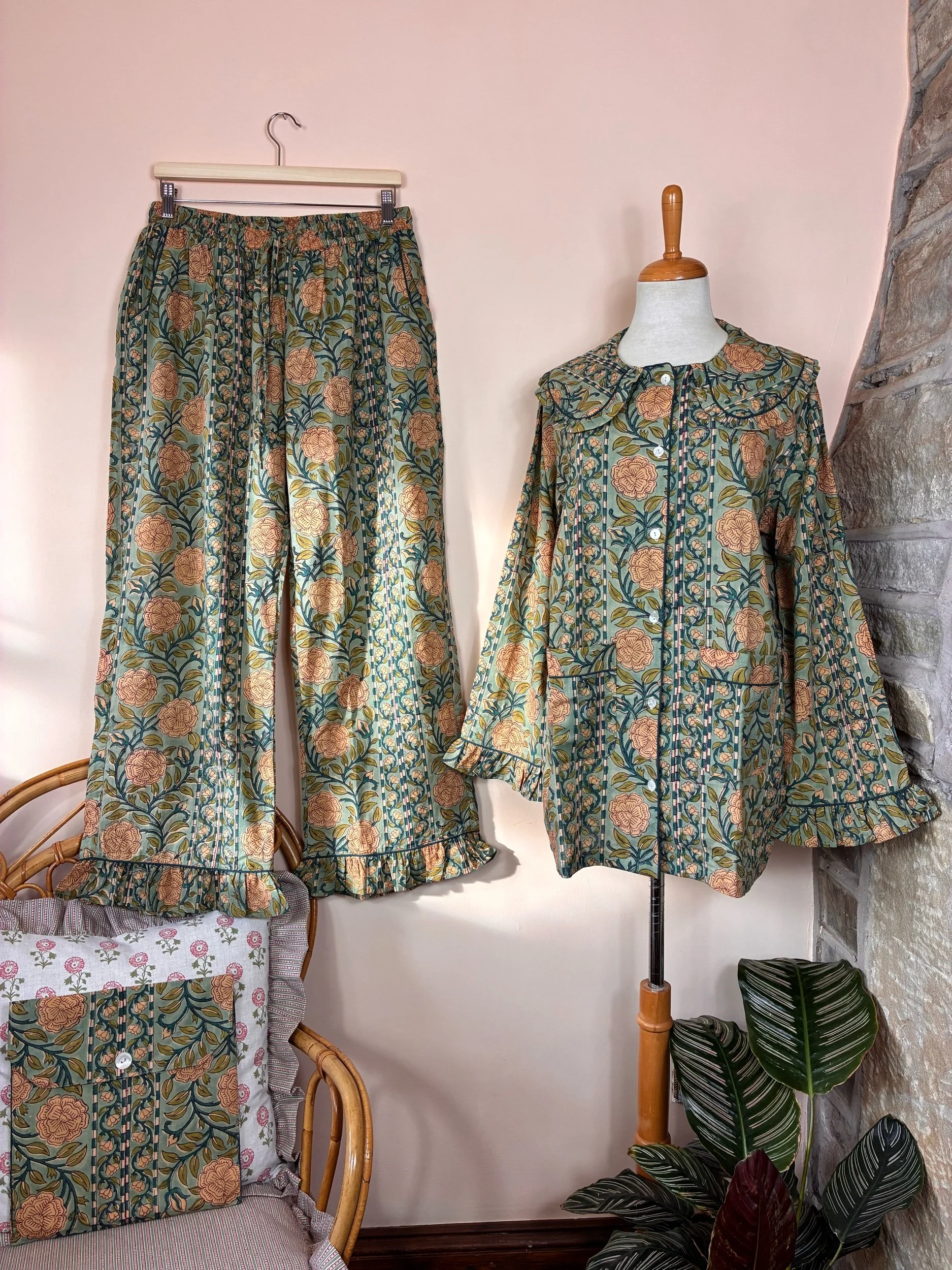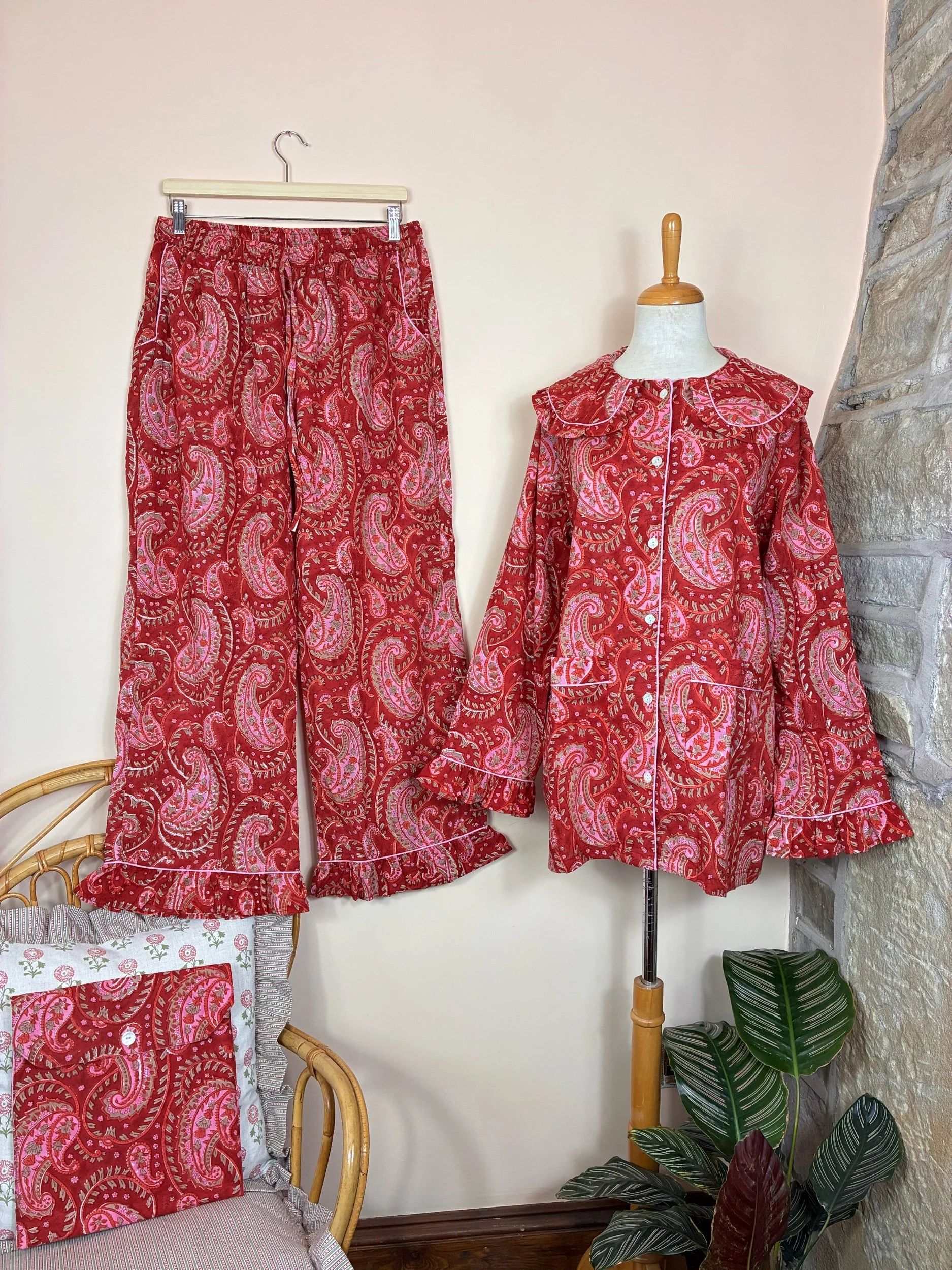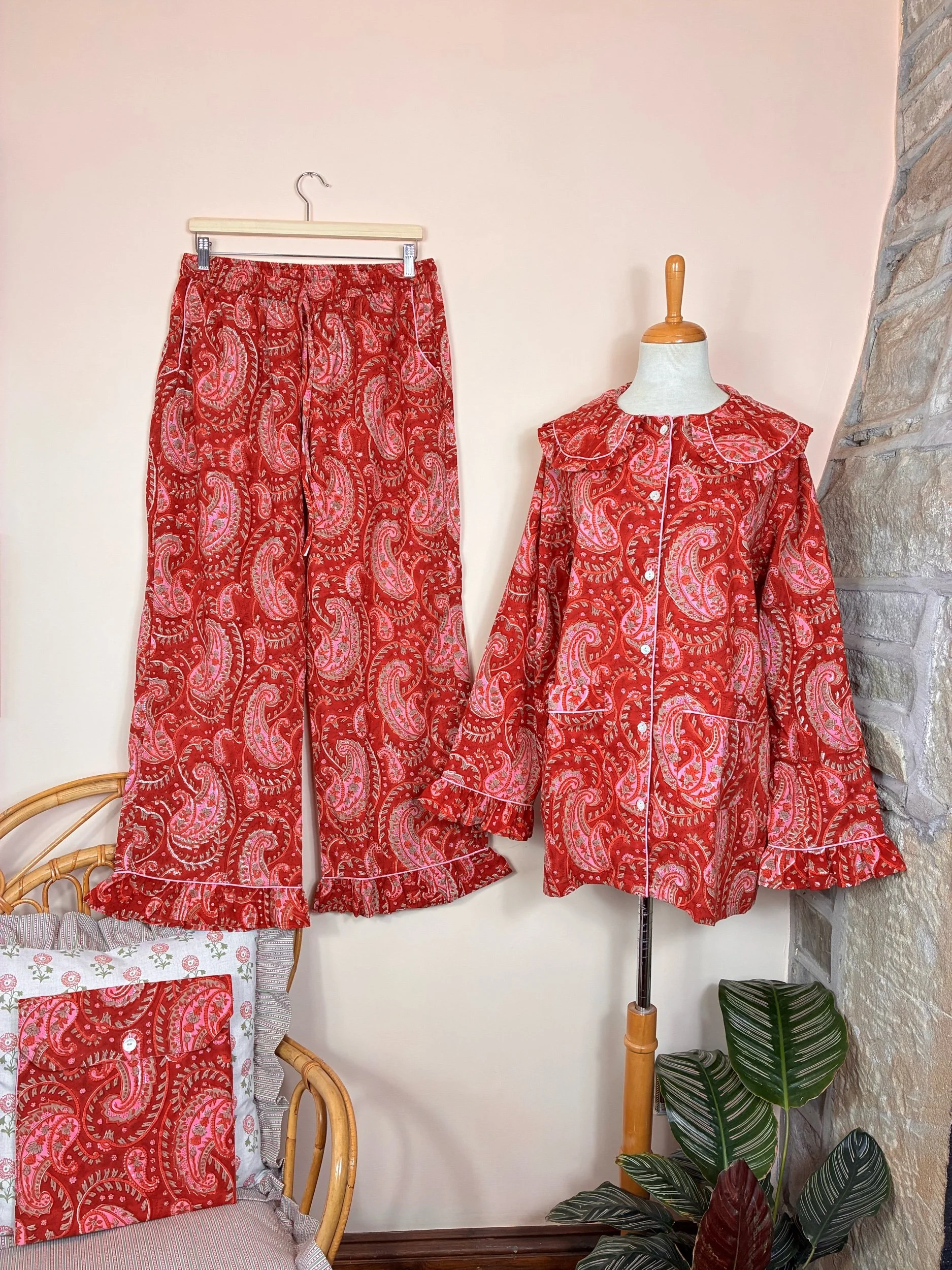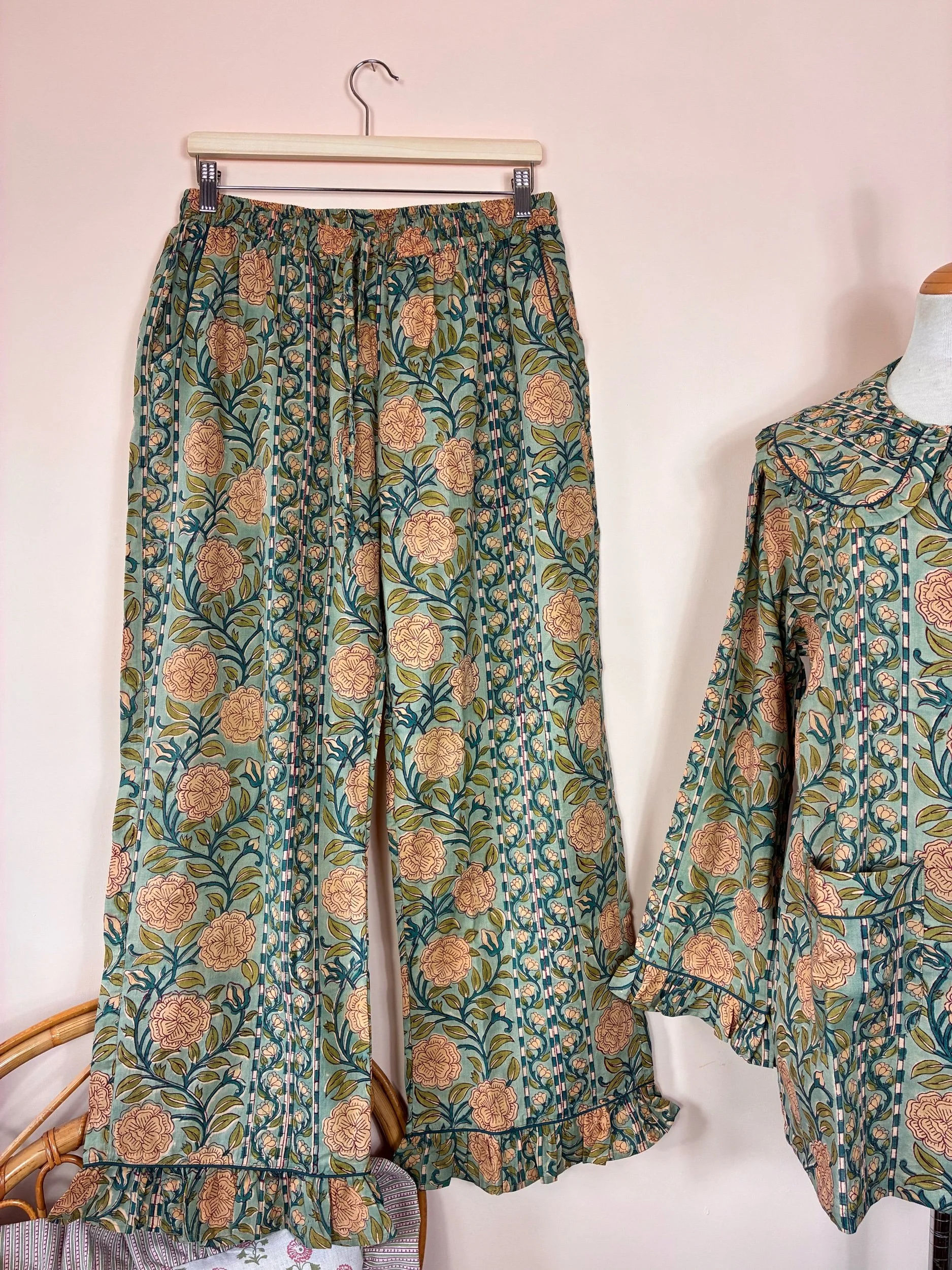 Handmade with love. Our limited edition selfcare loungewear collection is hand block printed using natural pigments and dyes from nature. This 100% cotton set is lightweight, breathable, comfortable and super adorable. The oversied blouse features a rounded collar adorned with ruffled edges, two front square pockets, ruffled cuffs and seashell buttons. The lounge pants are a wide leg relaxed fit with an elasticated waistband, drawstring ties, two side pockets and have a cute ruffled hem.