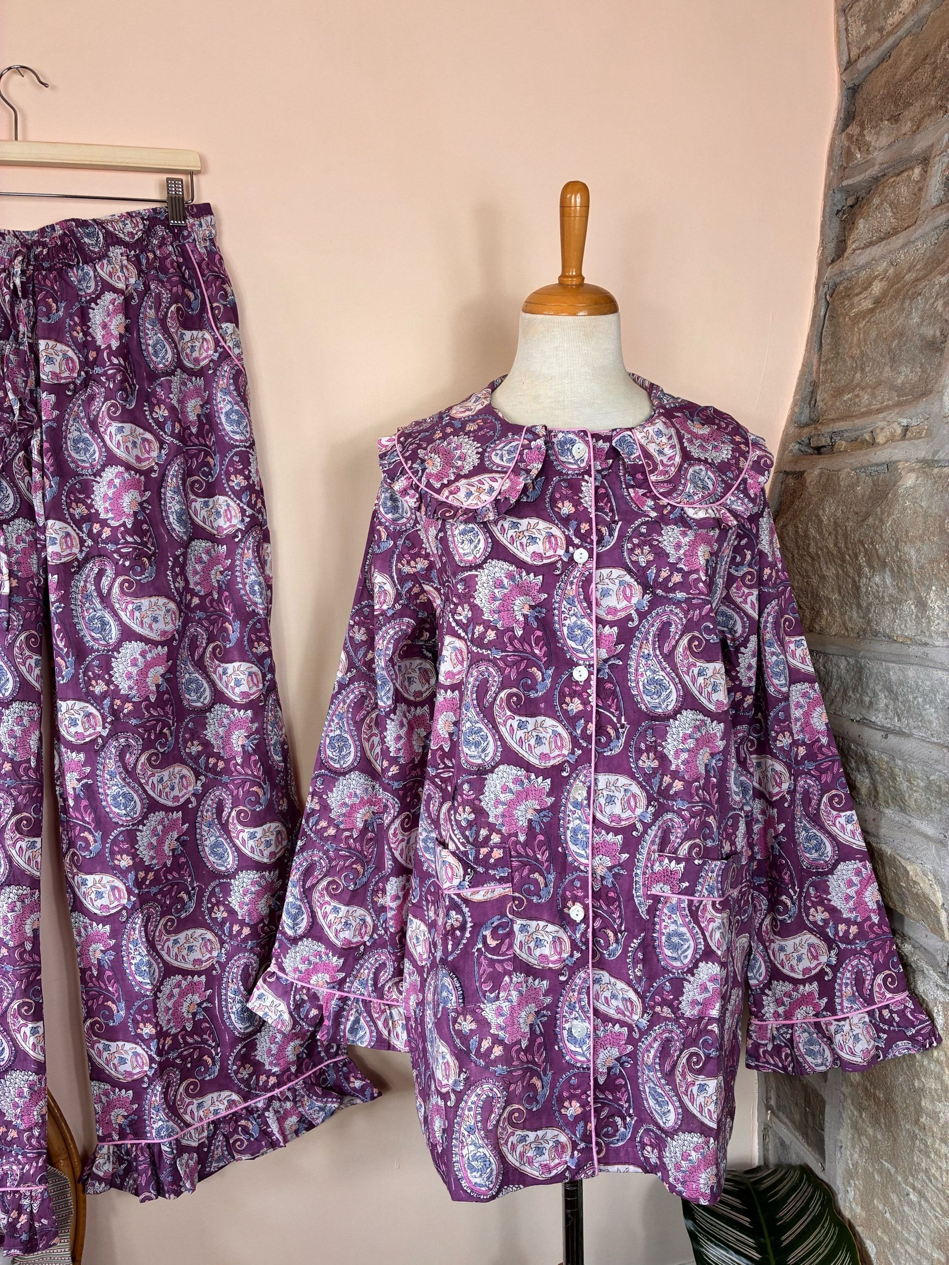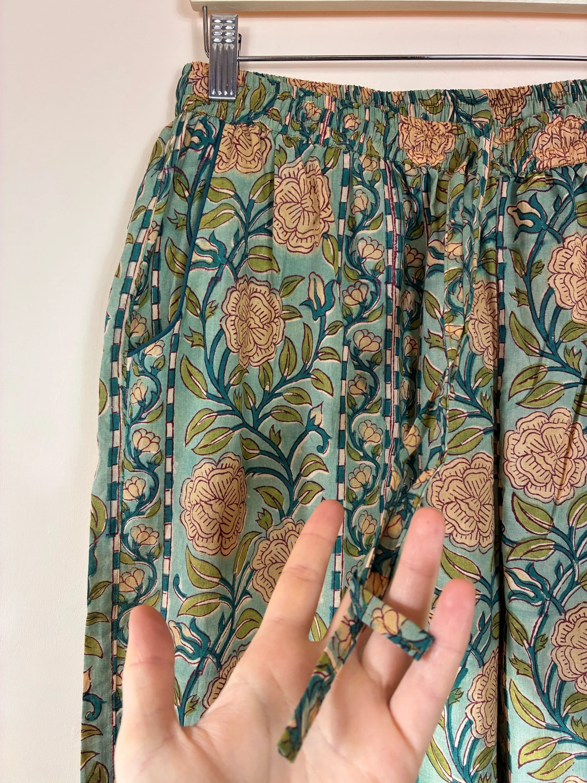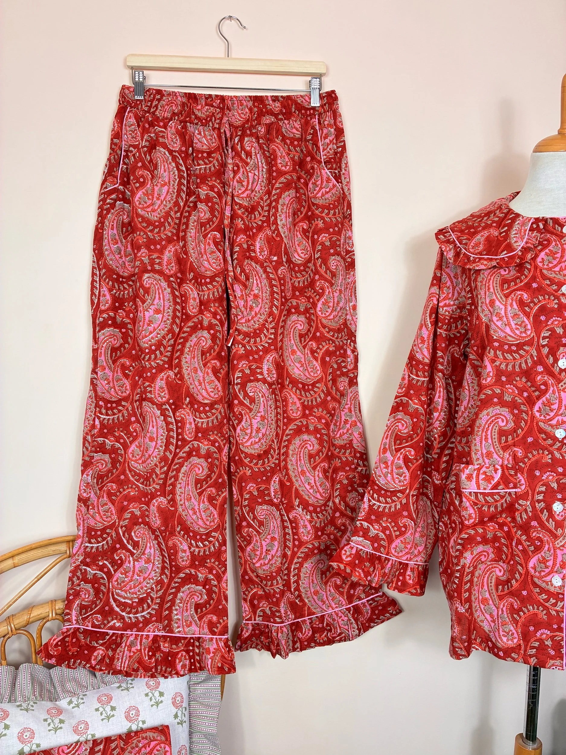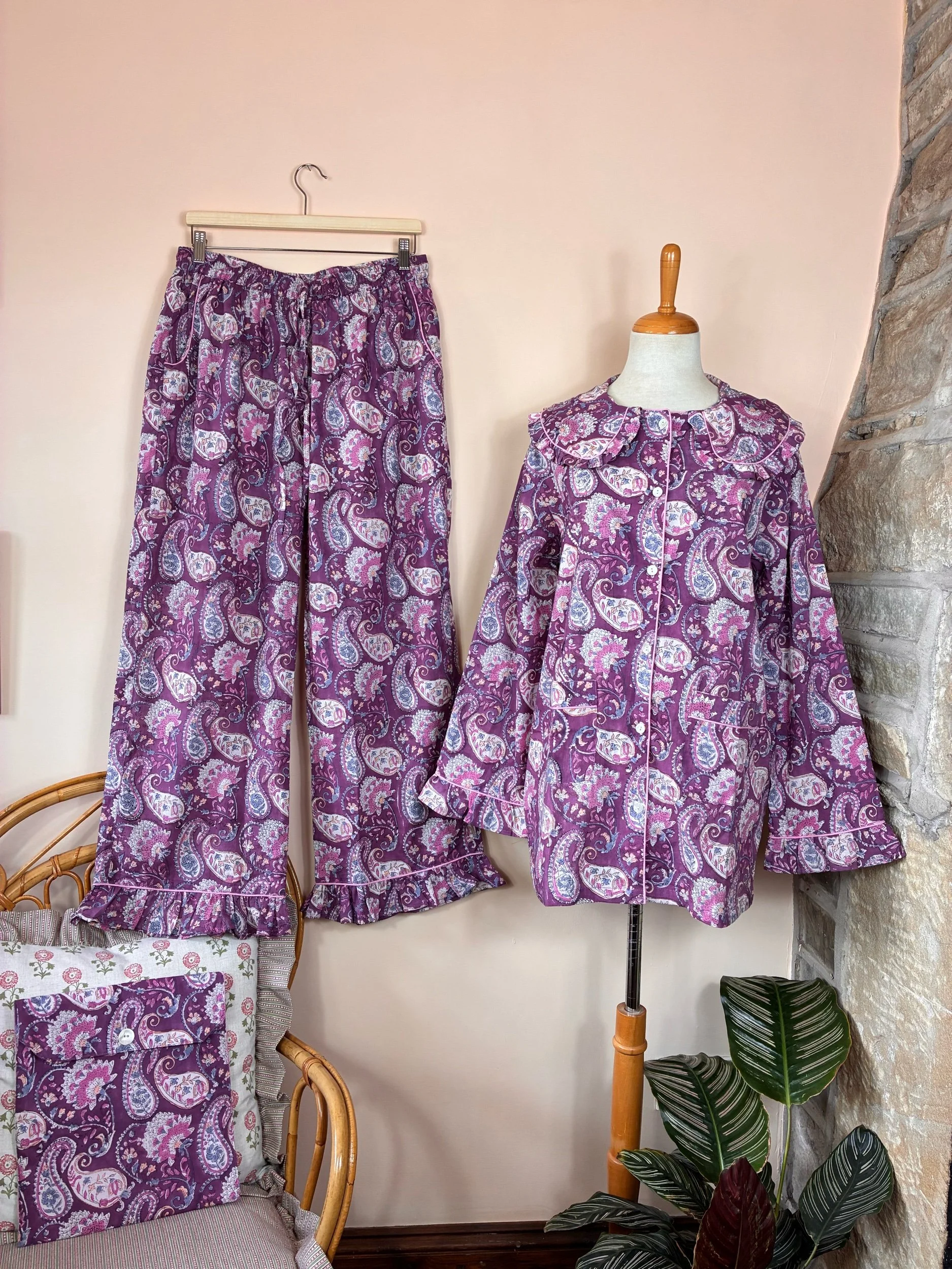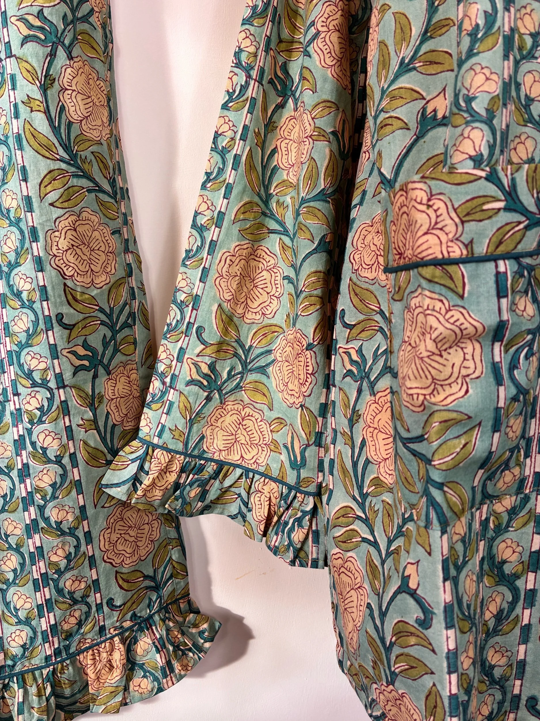 Handmade with love. Our limited edition selfcare loungewear collection is hand block printed using natural pigments and dyes from nature. This 100% cotton set is lightweight, breathable, comfortable and super adorable. The oversied blouse features a rounded collar adorned with ruffled edges, two front square pockets, ruffled cuffs and seashell buttons. The lounge pants are a wide leg relaxed fit with an elasticated waistband, drawstring ties, two side pockets and have a cute ruffled hem.