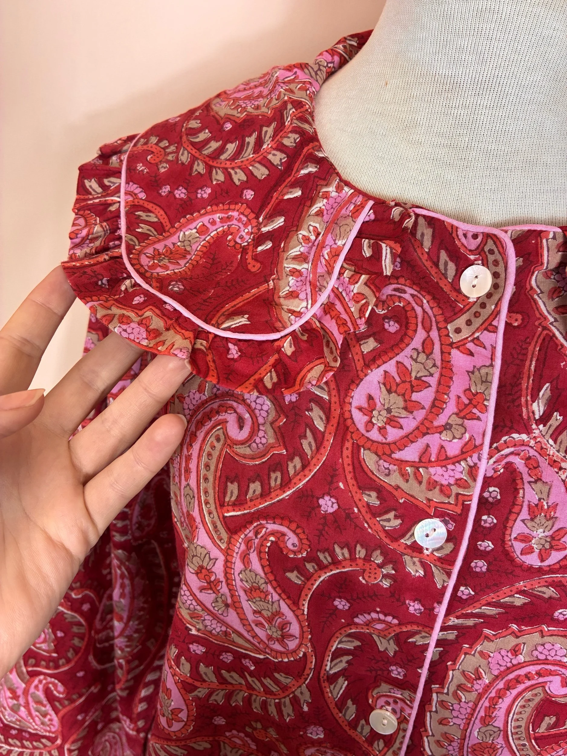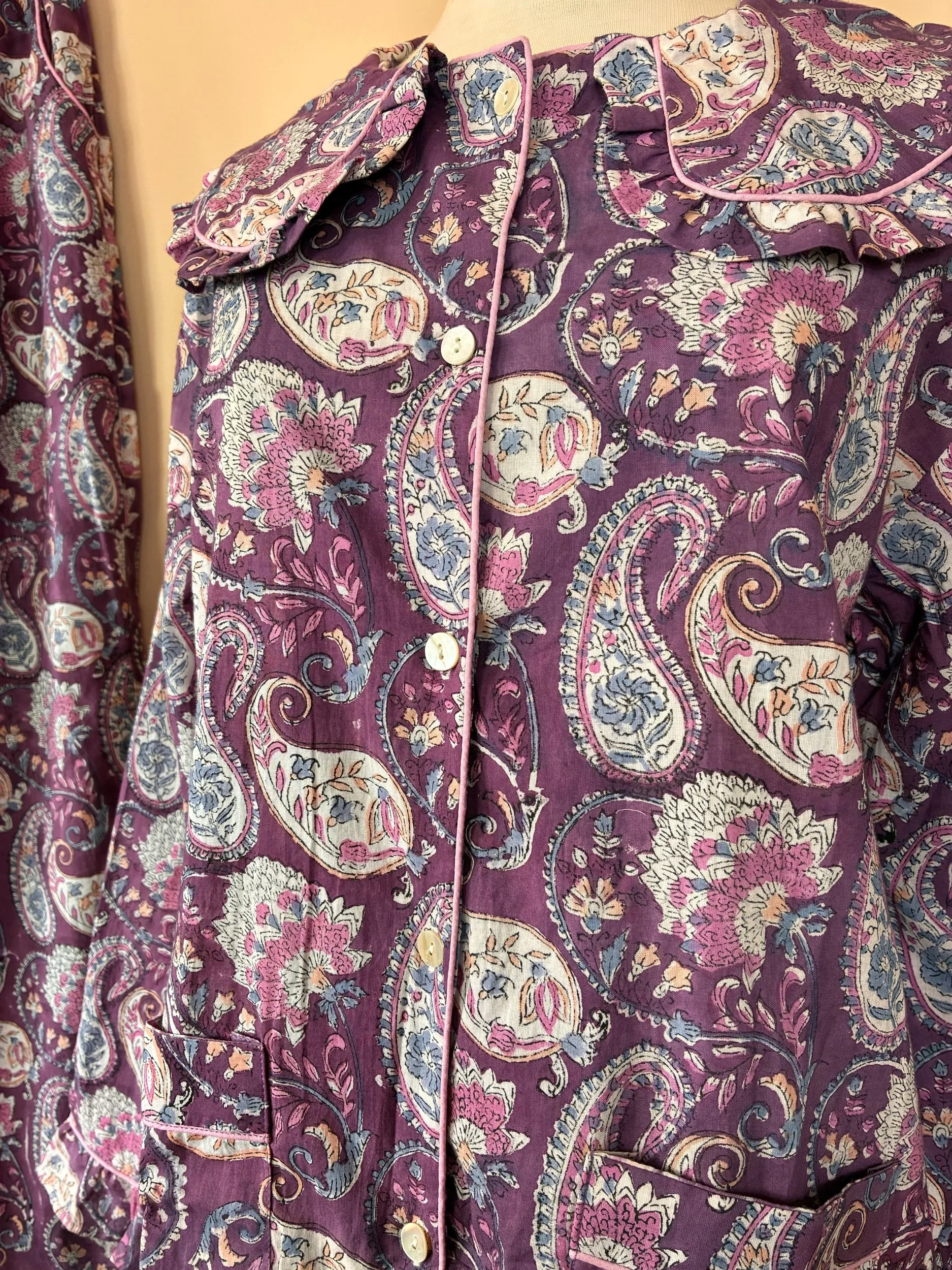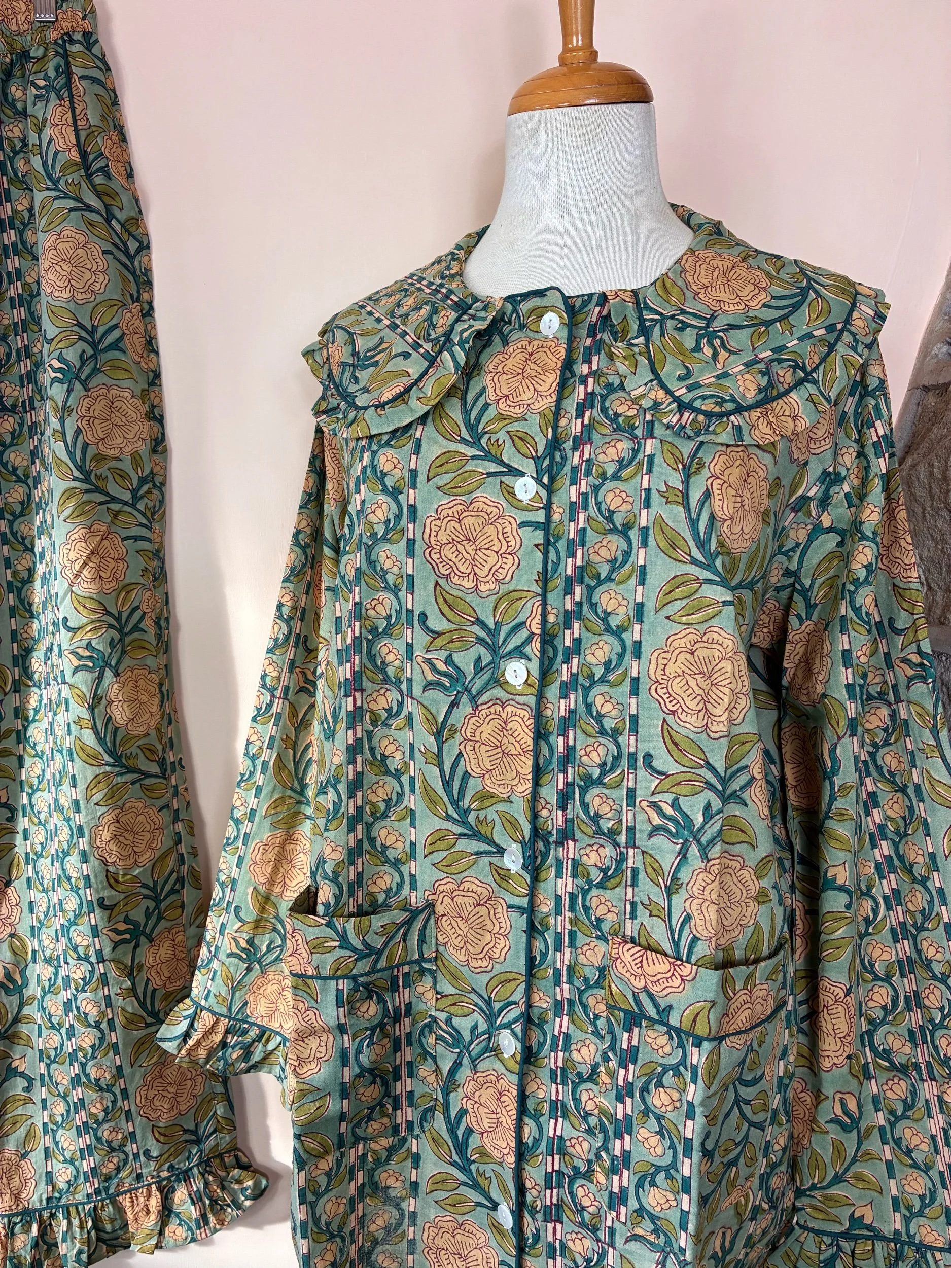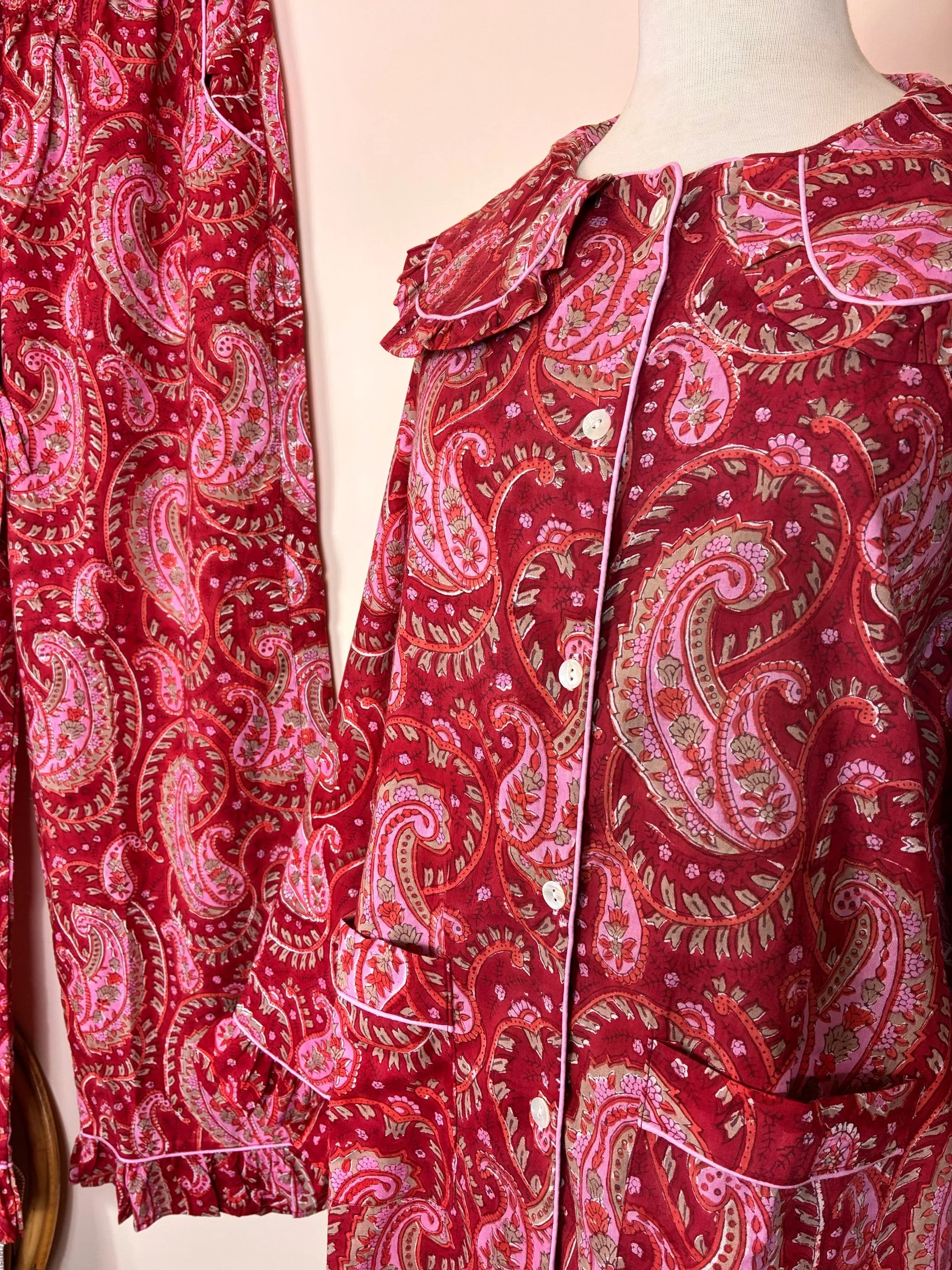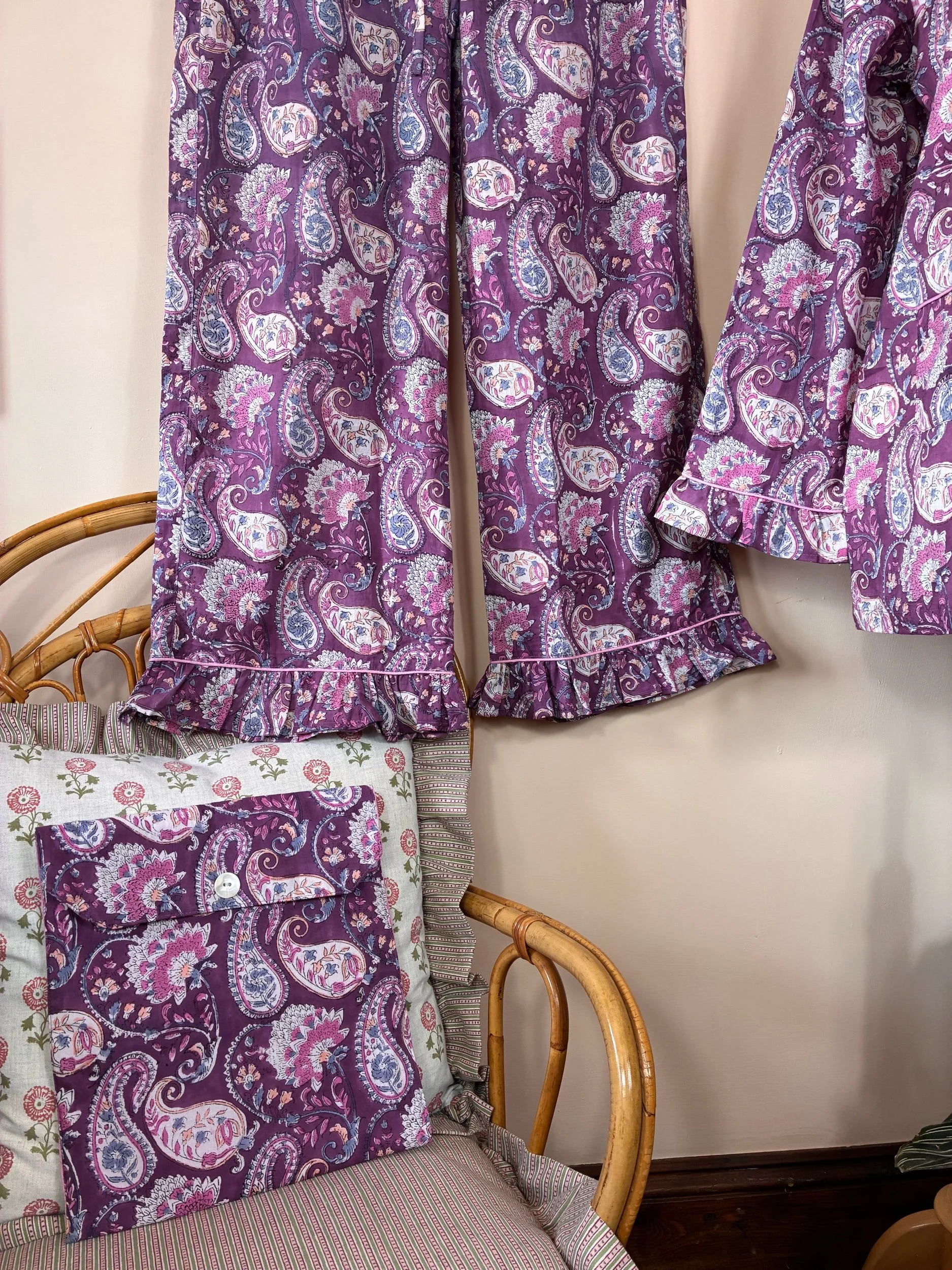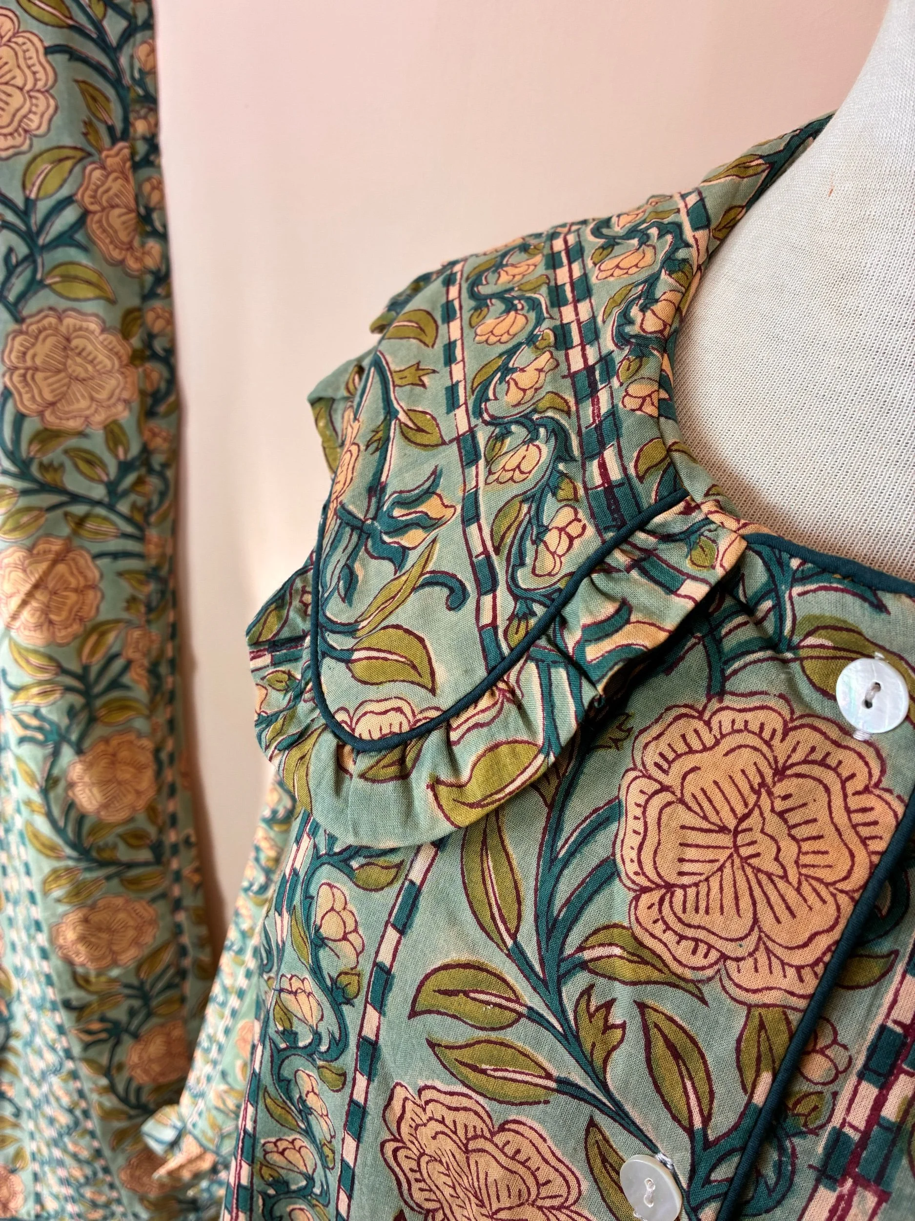 Handmade with love. Our limited edition selfcare loungewear collection is hand block printed using natural pigments and dyes from nature. This 100% cotton set is lightweight, breathable, comfortable and super adorable. The oversied blouse features a rounded collar adorned with ruffled edges, two front square pockets, ruffled cuffs and seashell buttons. The lounge pants are a wide leg relaxed fit with an elasticated waistband, drawstring ties, two side pockets and have a cute ruffled hem.