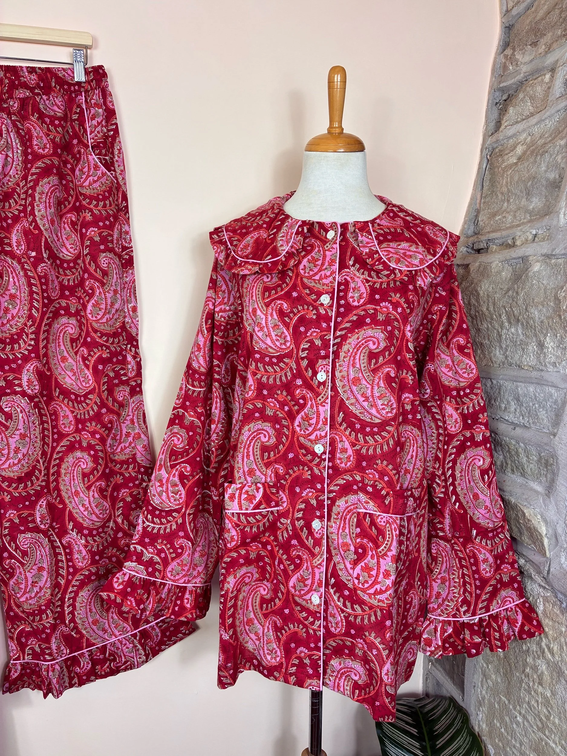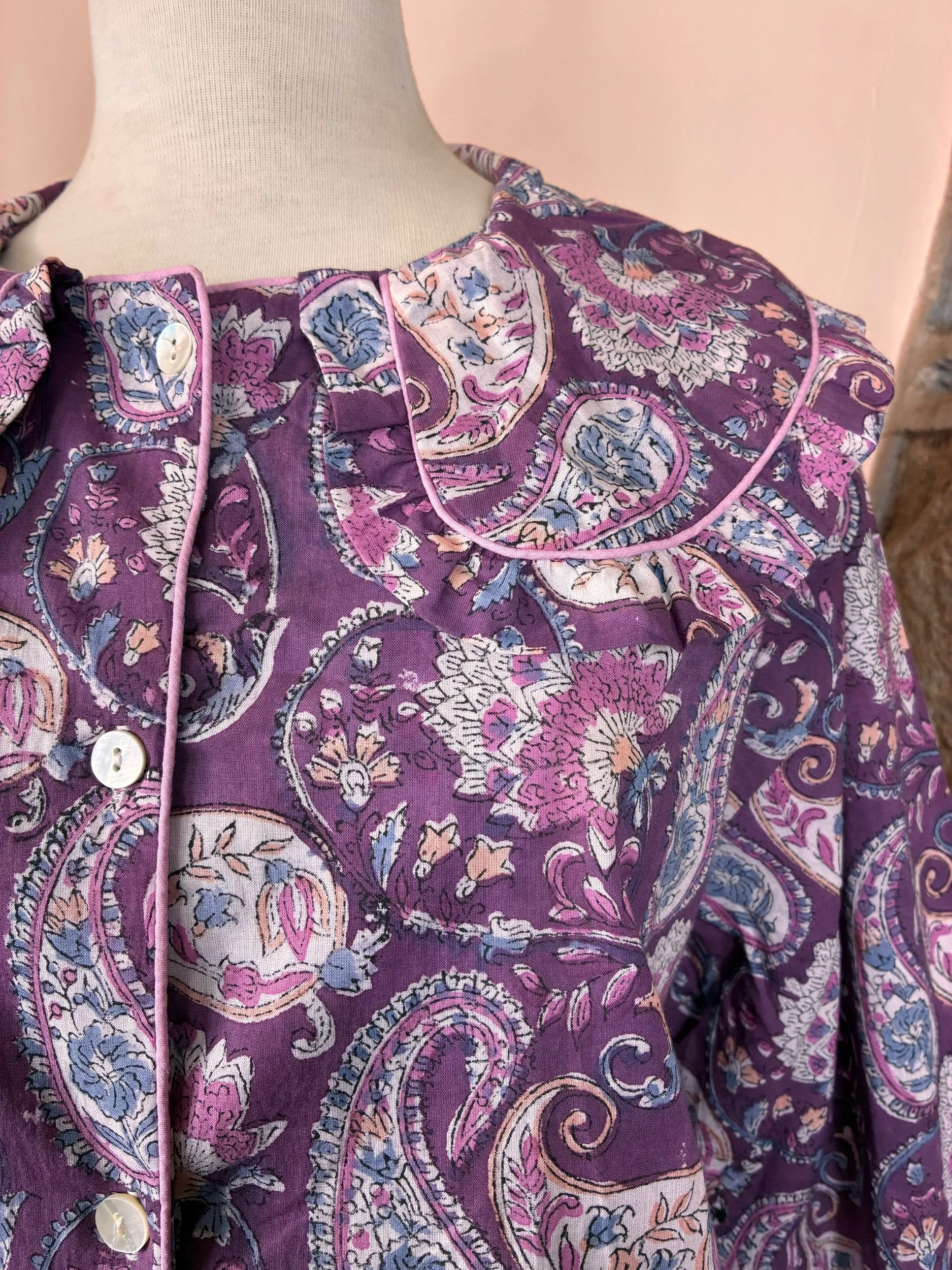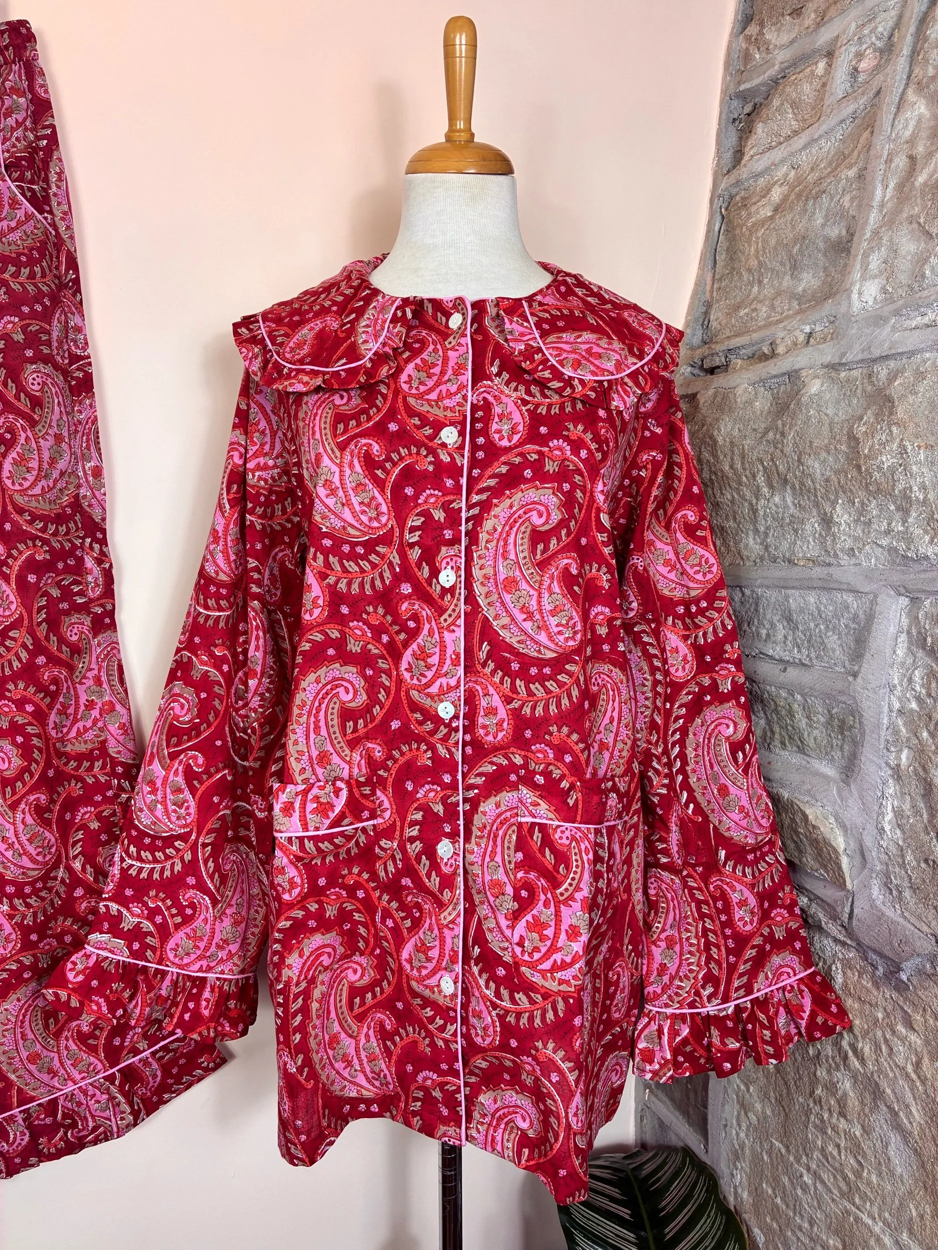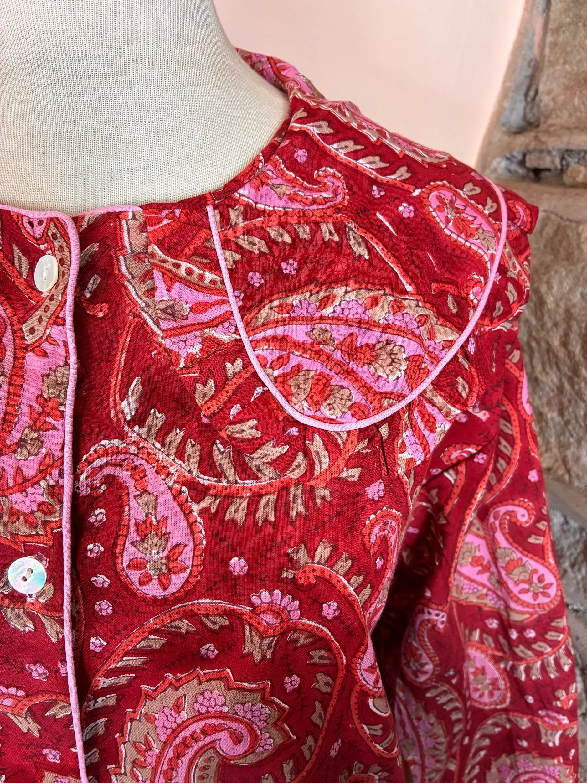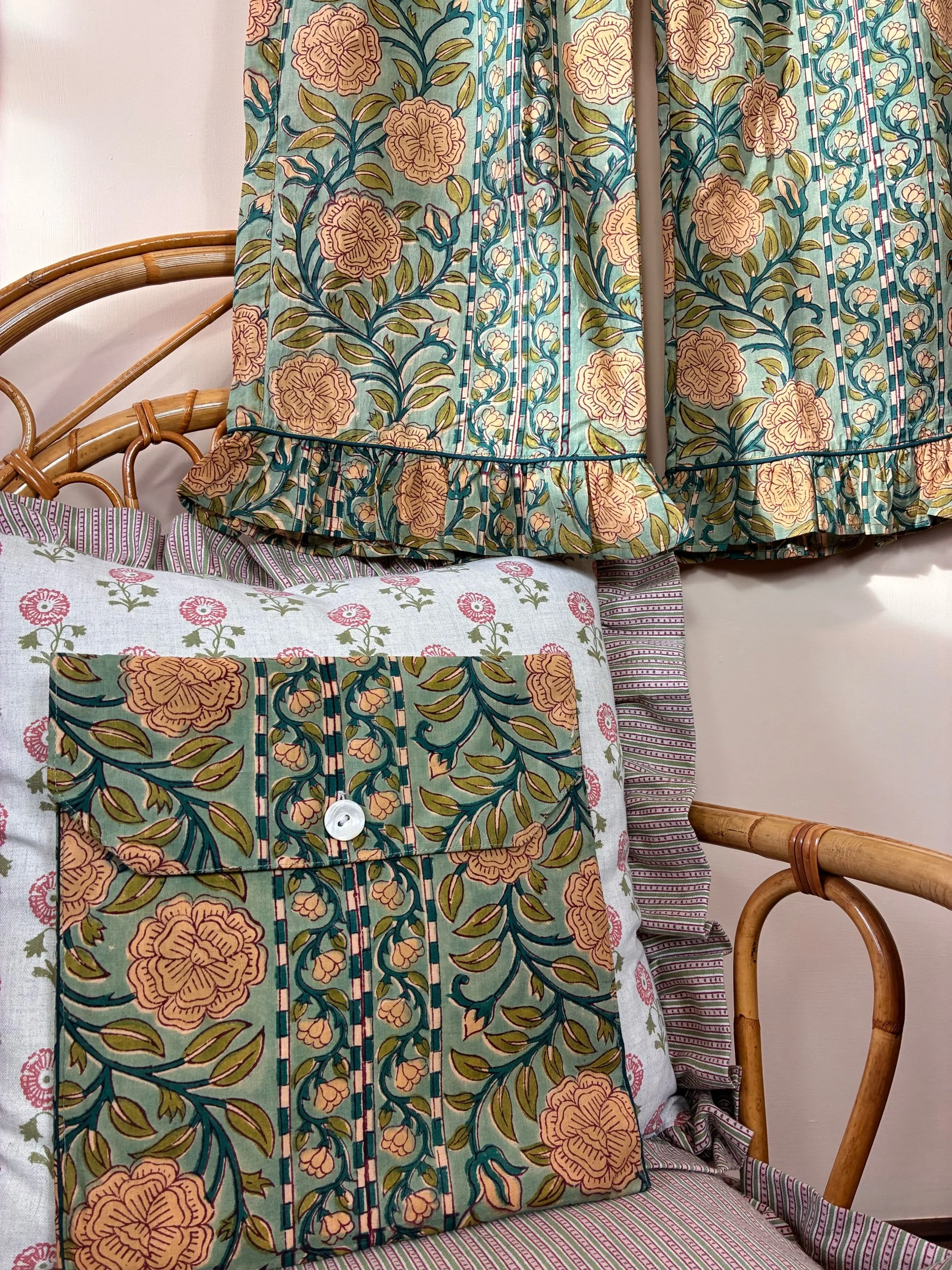 Handmade with love. Our limited edition selfcare loungewear collection is hand block printed using natural pigments and dyes from nature. This 100% cotton set is lightweight, breathable, comfortable and super adorable. The oversied blouse features a rounded collar adorned with ruffled edges, two front square pockets, ruffled cuffs and seashell buttons. The lounge pants are a wide leg relaxed fit with an elasticated waistband, drawstring ties, two side pockets and have a cute ruffled hem.