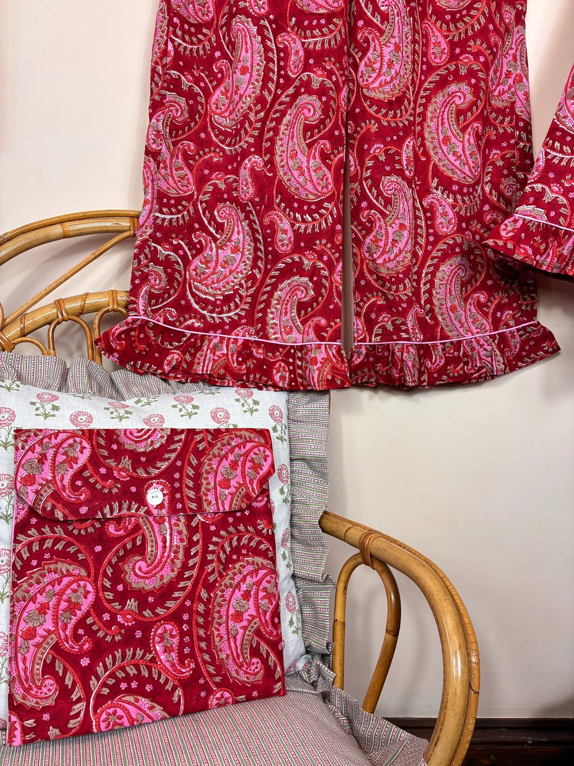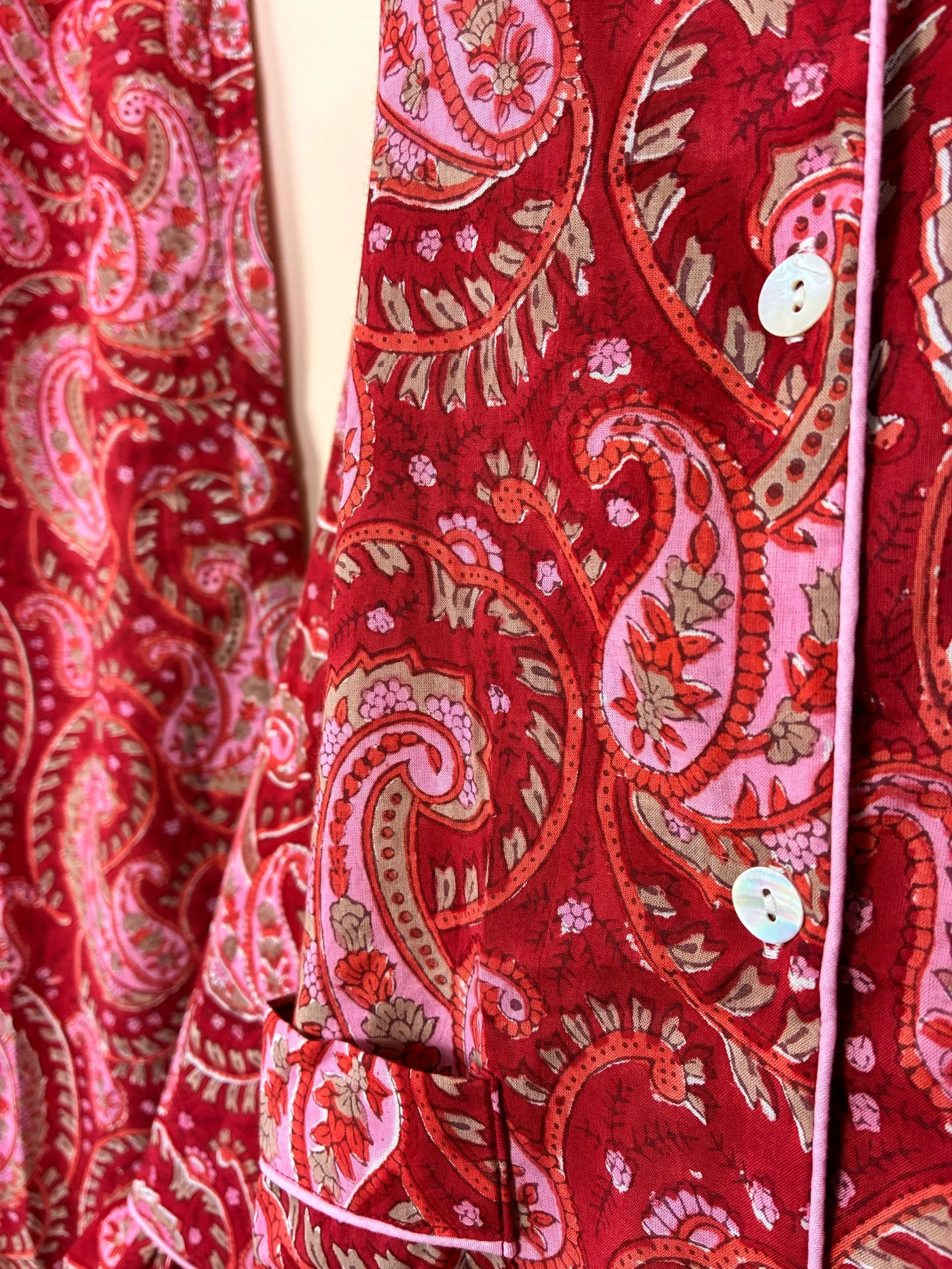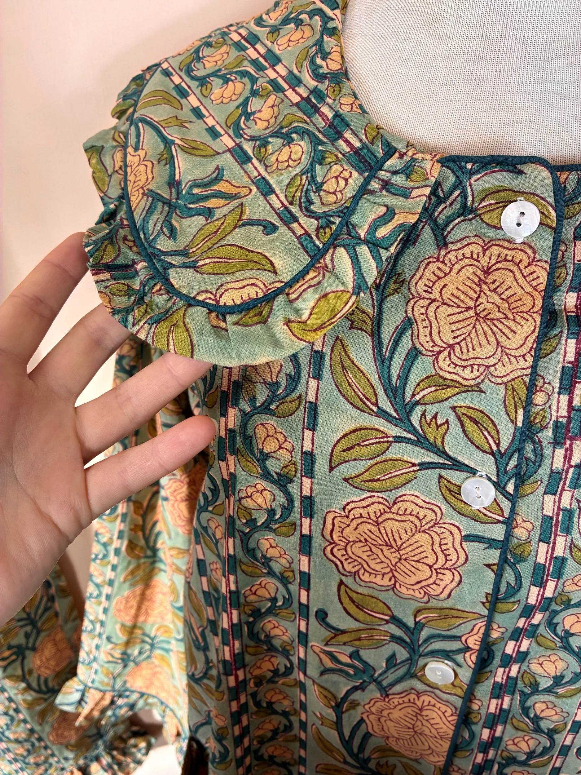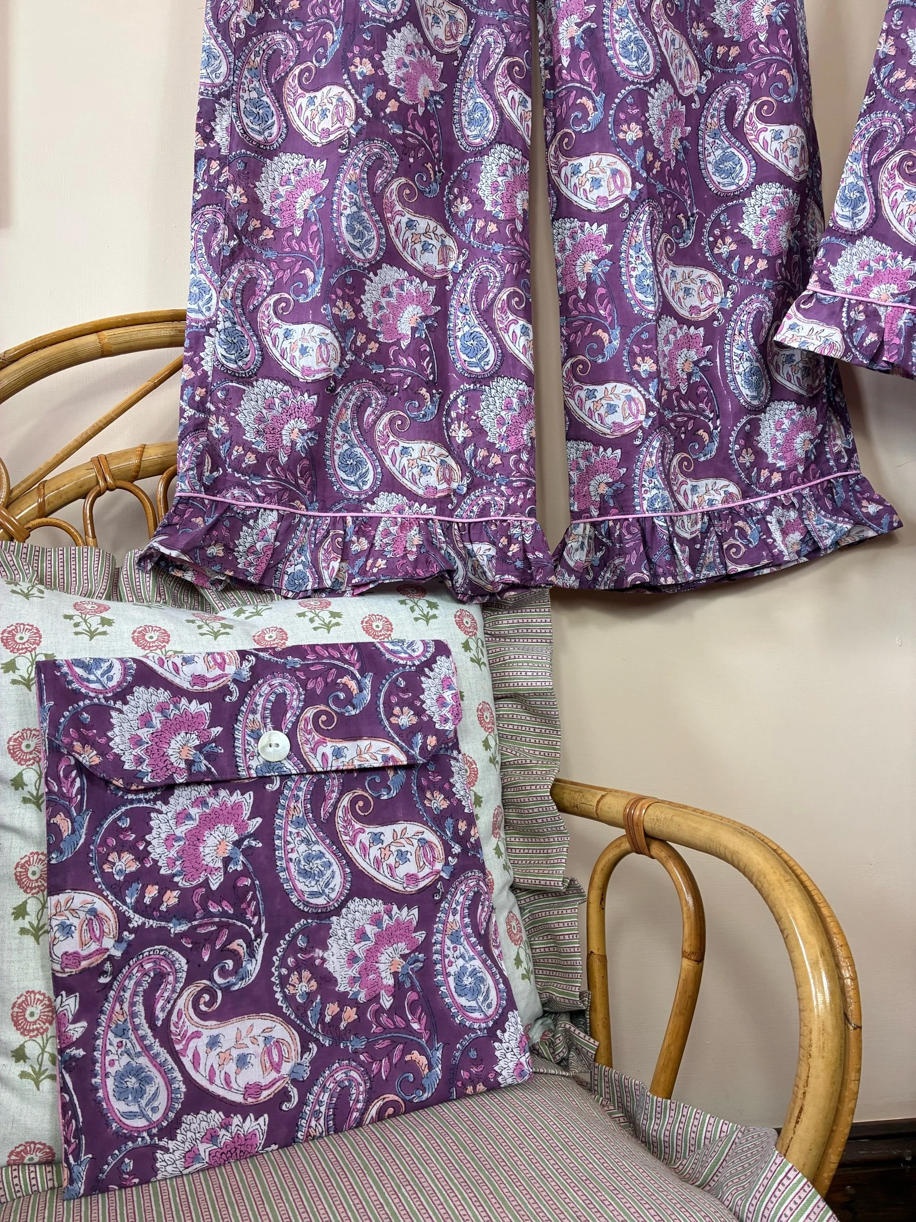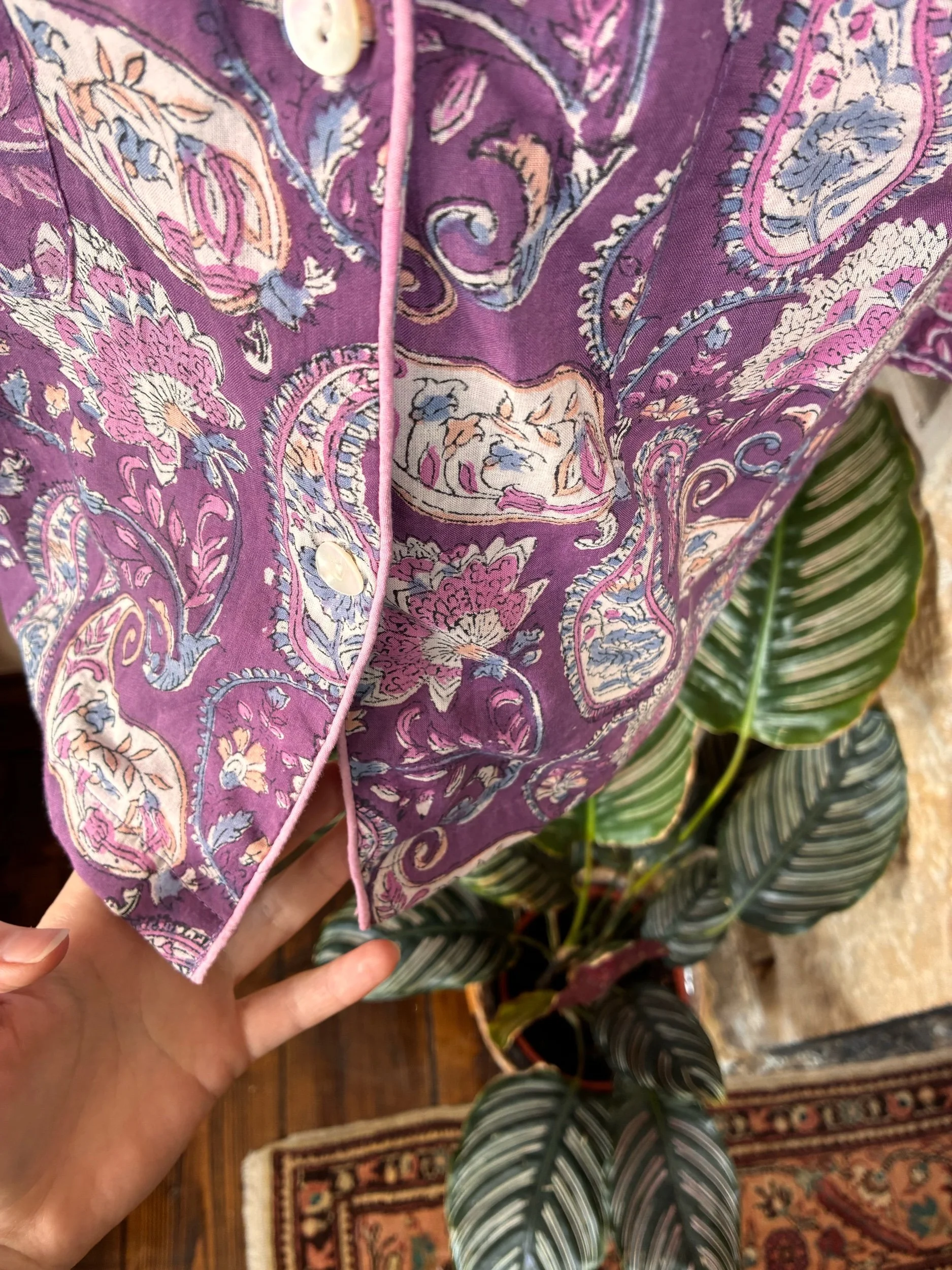 Handmade with love. Our limited edition selfcare loungewear collection is hand block printed using natural pigments and dyes from nature. This 100% cotton set is lightweight, breathable, comfortable and super adorable. The oversied blouse features a rounded collar adorned with ruffled edges, two front square pockets, ruffled cuffs and seashell buttons. The lounge pants are a wide leg relaxed fit with an elasticated waistband, drawstring ties, two side pockets and have a cute ruffled hem.