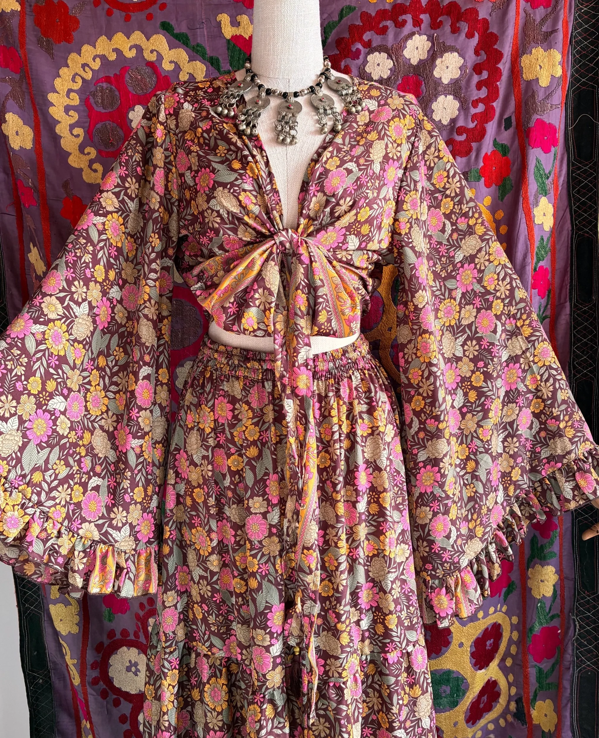 Seventies Soul Stevie Set includes a matching wrap top with large 70s sleeves and a tiered maxi skirt with an elasticated waistband. Both made from buttery soft silk and perfect for channeling your inner gold dust woman. Soft, comfortable and super versatile this set is perfect for floating throughout the seasons with unlimited styling options. Wear each piece as separates or together for the ultimate bohemian look.