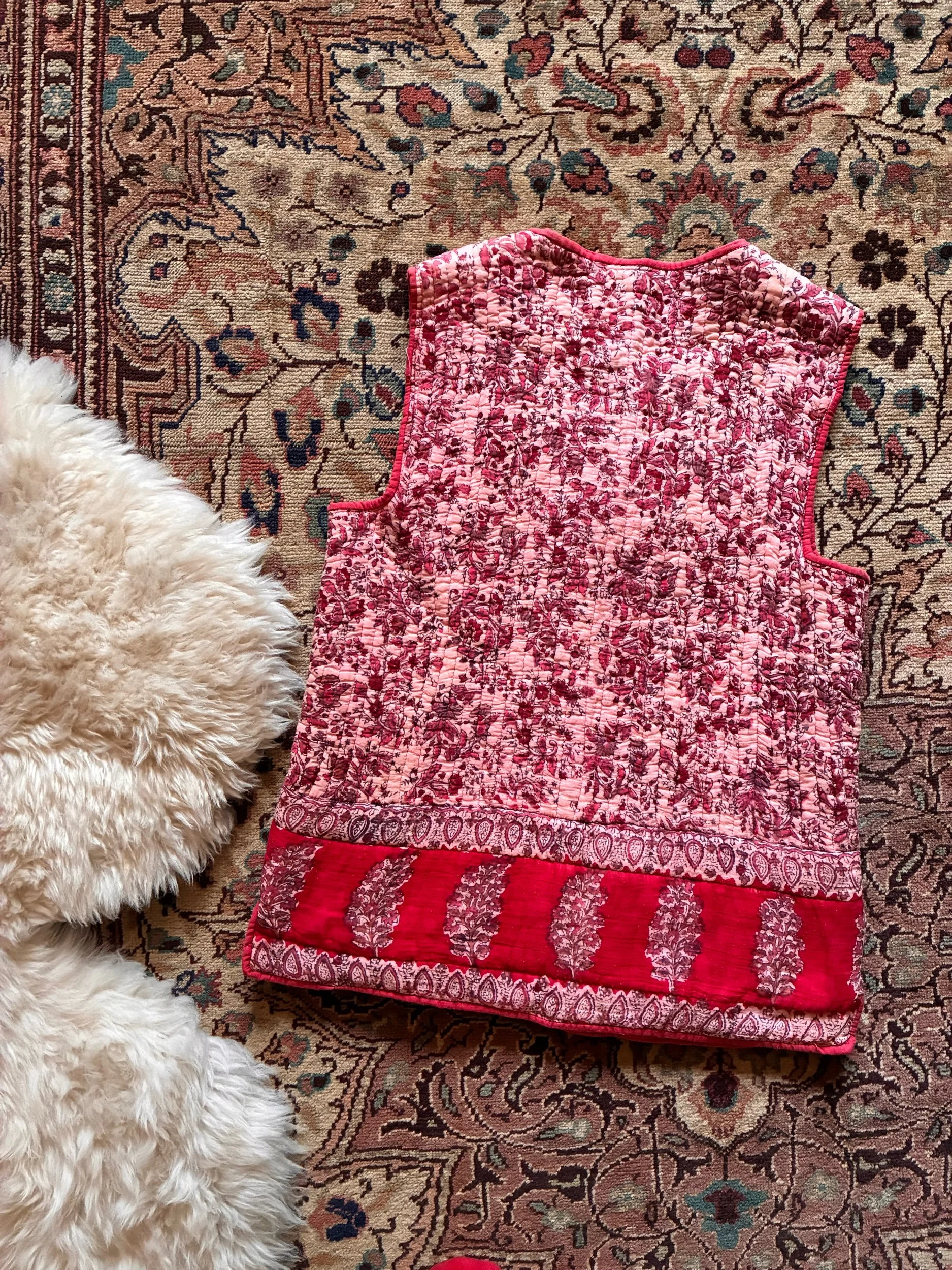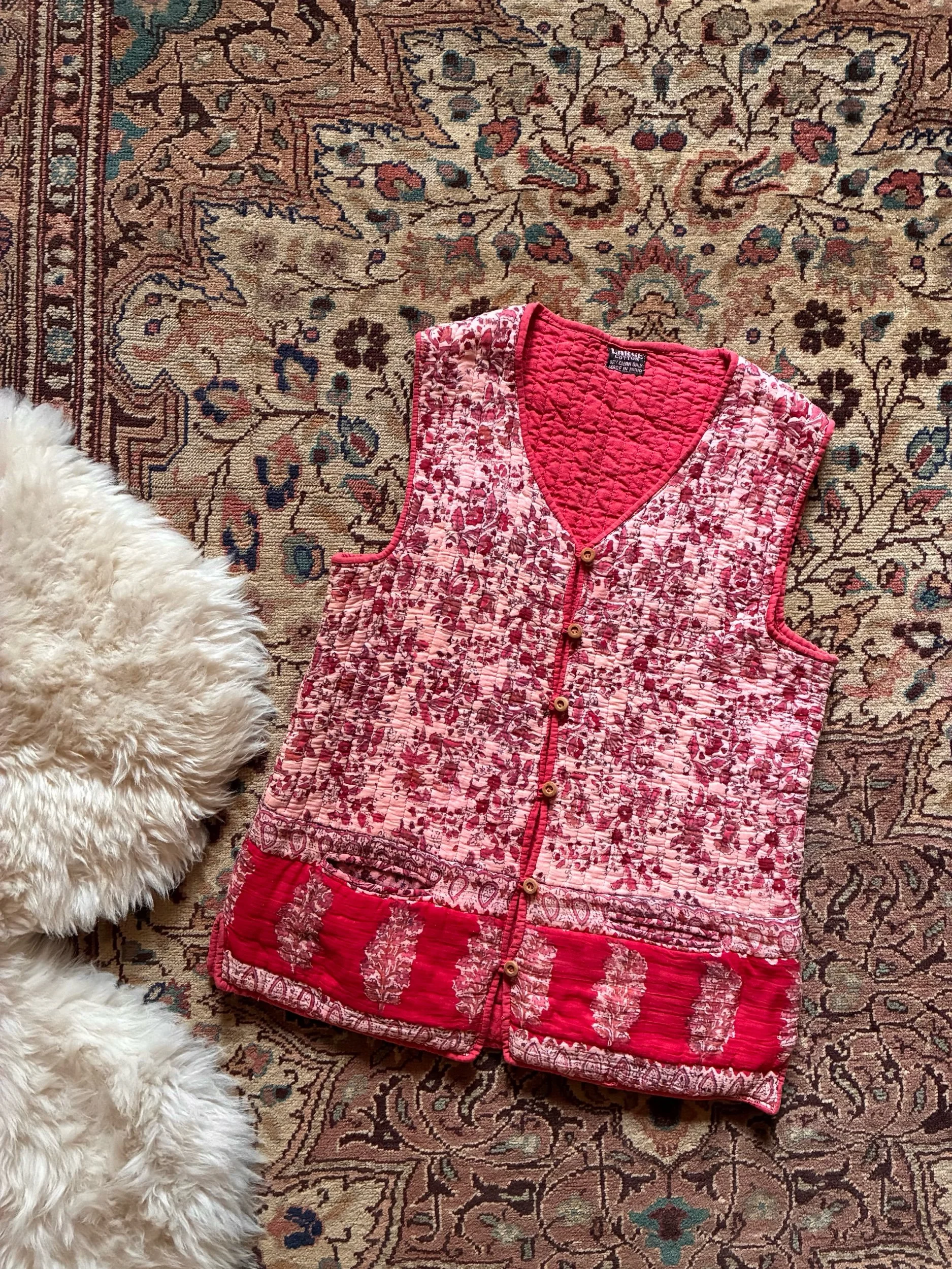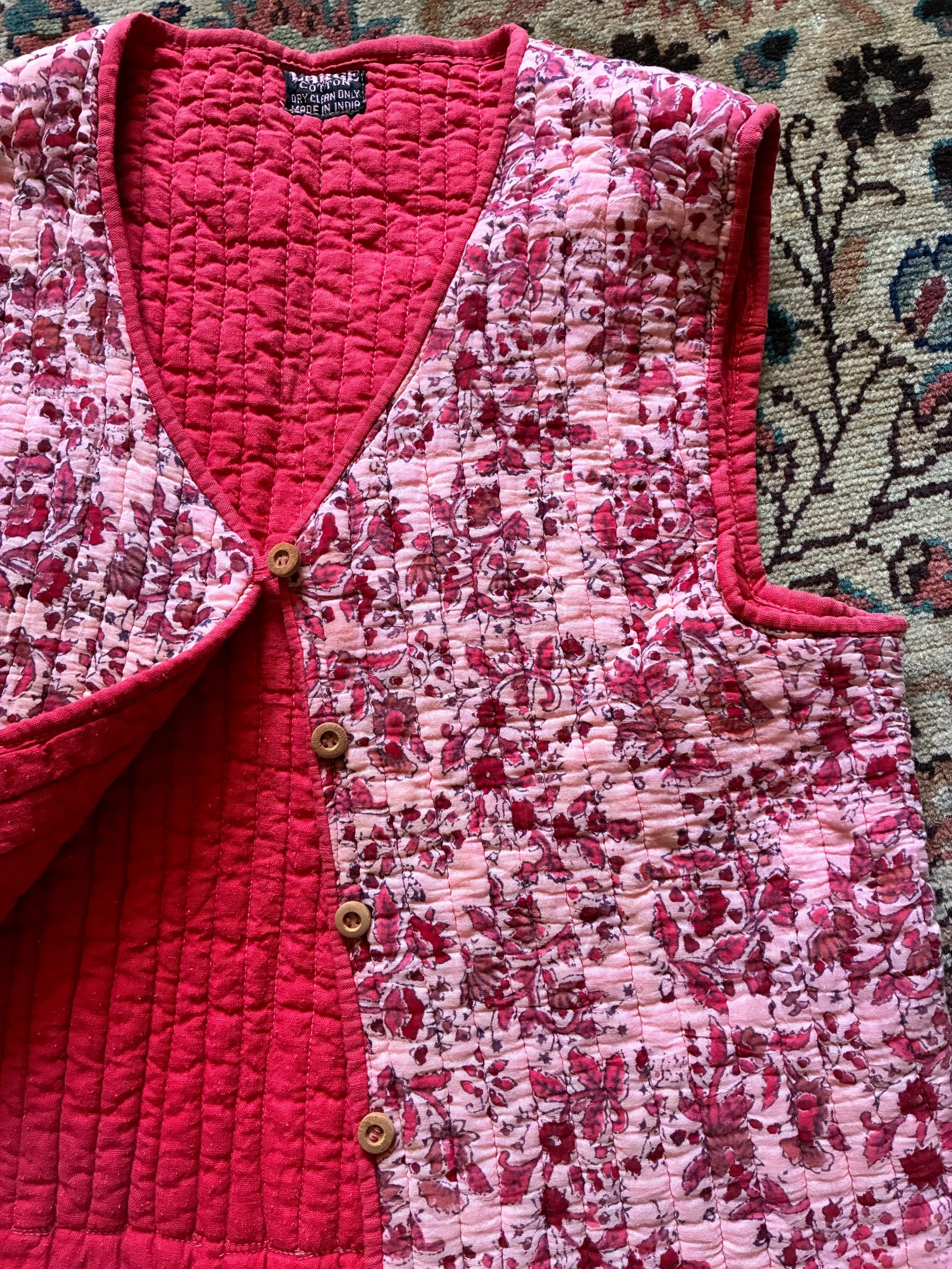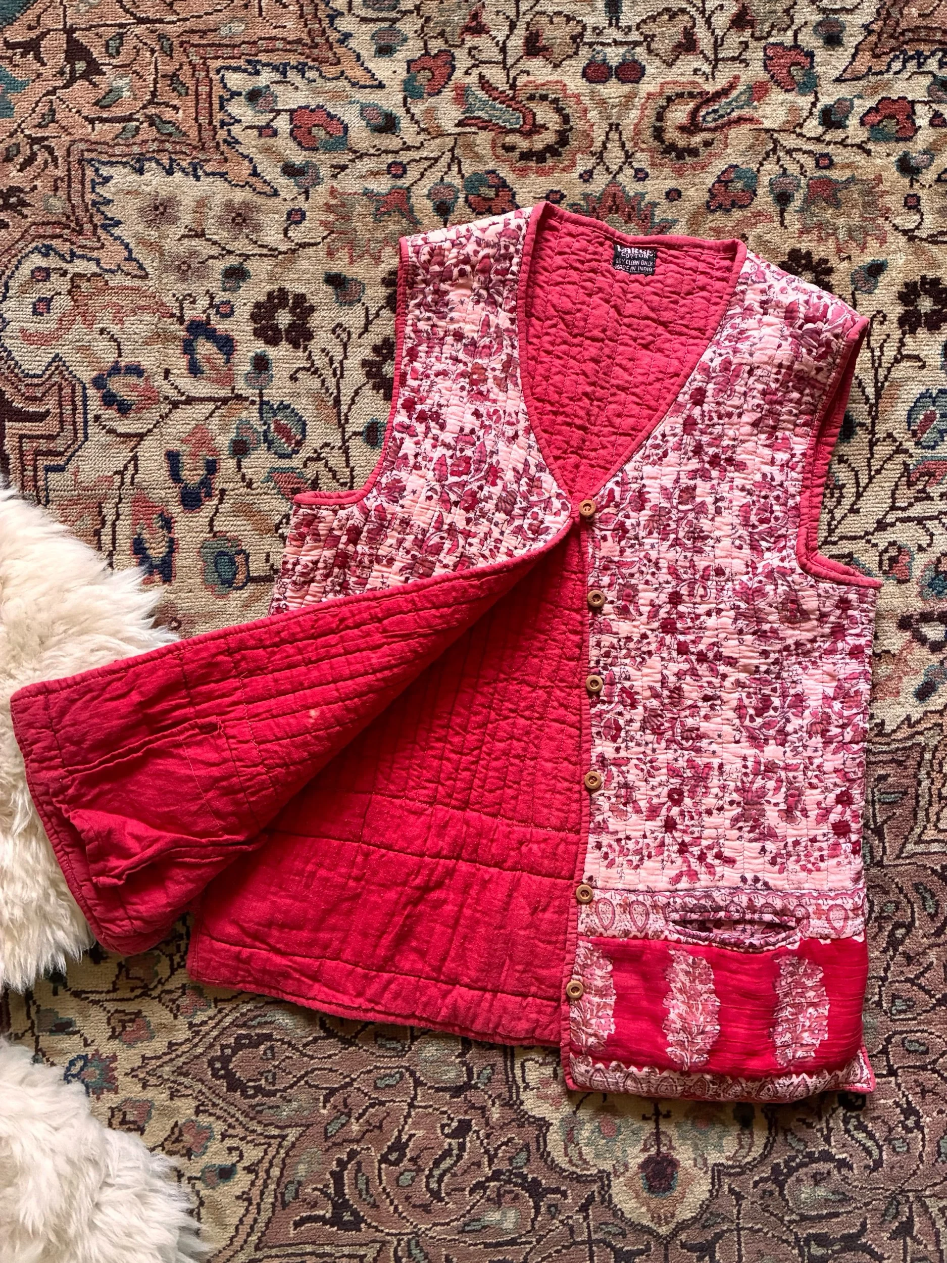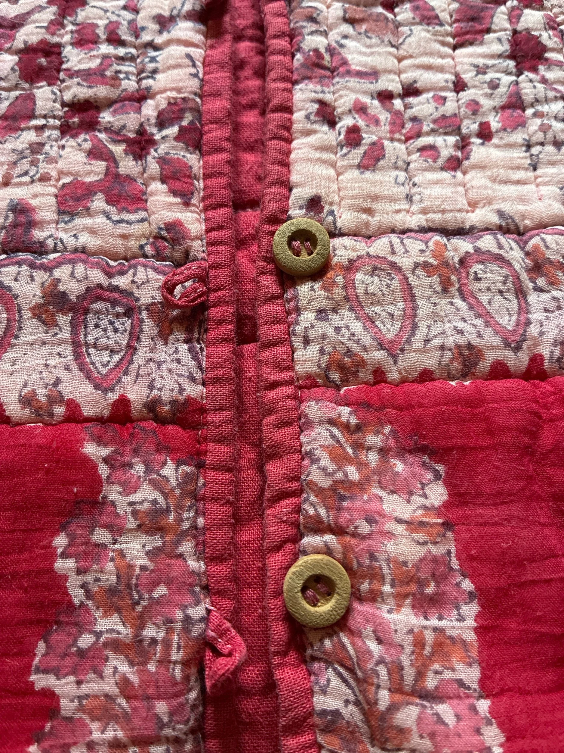 Beautiful pink floral paisley print 100% Indian cotton quilted waistcoat. Cute wooden buttons and two small front pockets. Super duper soft.